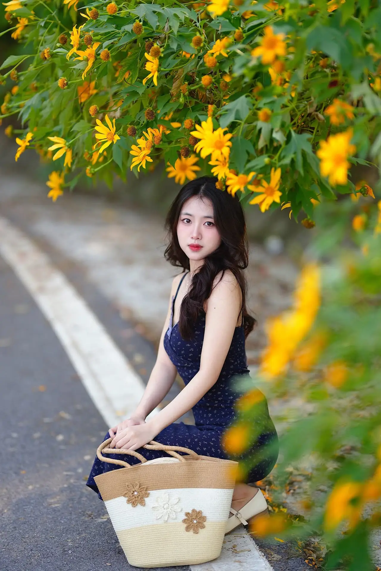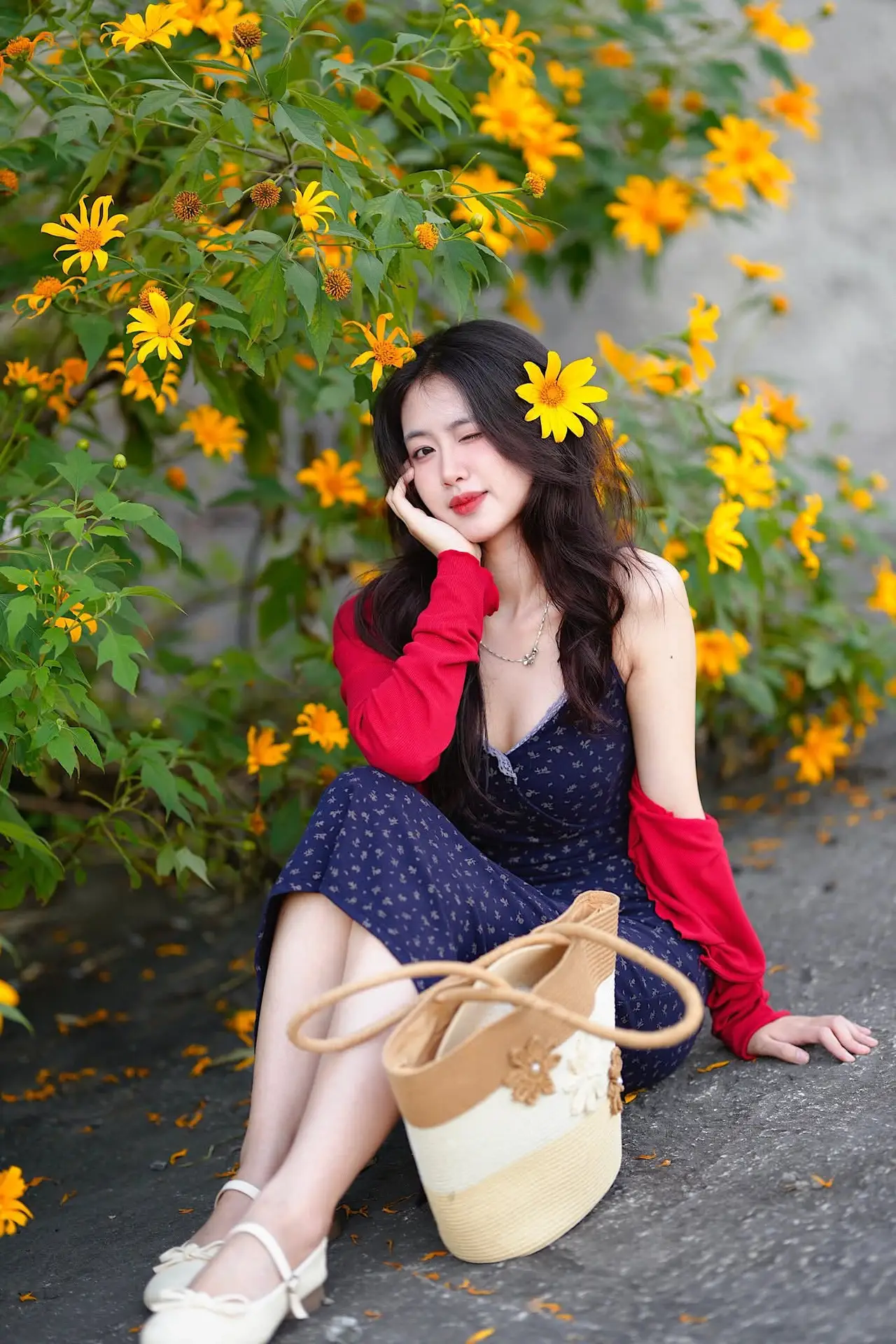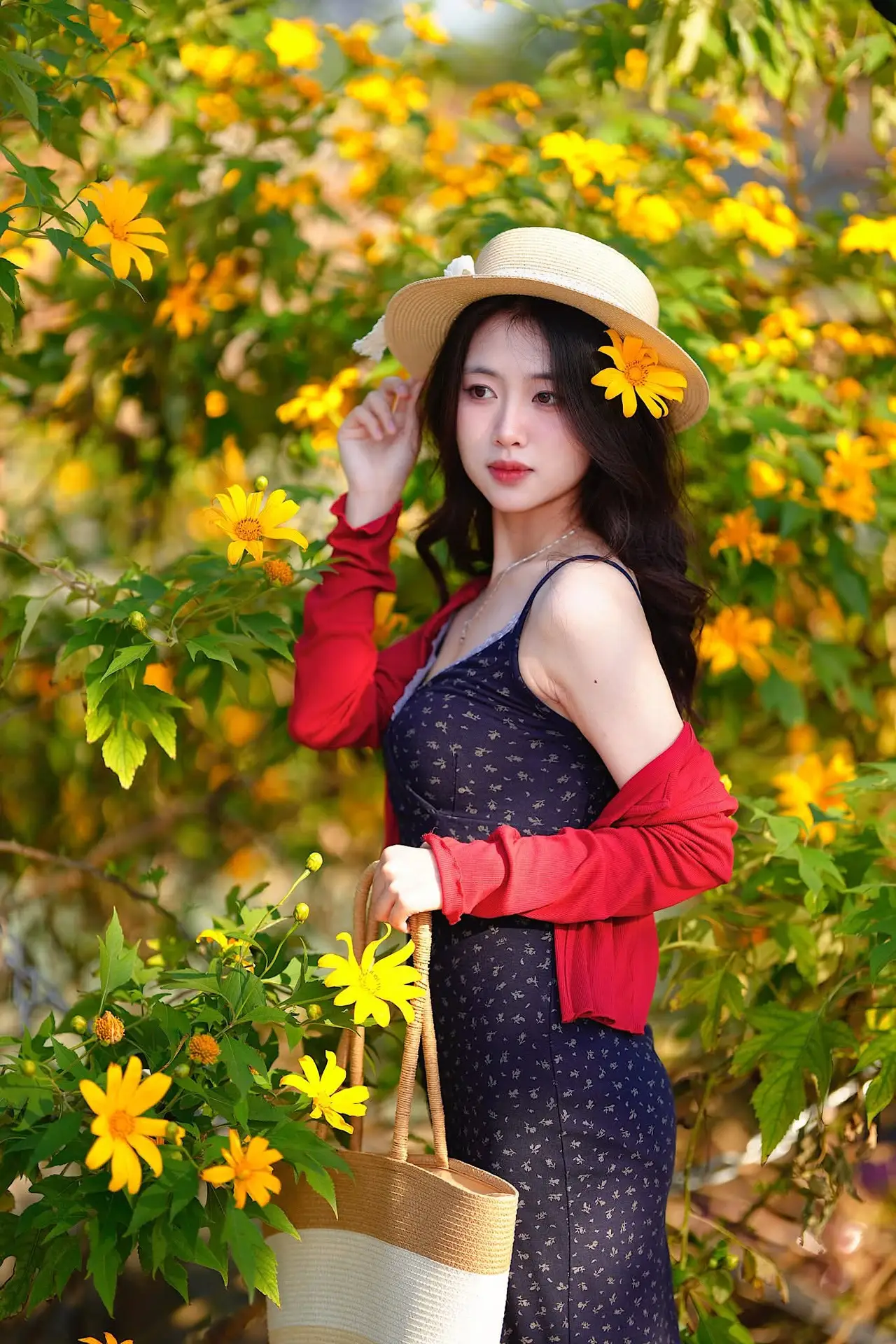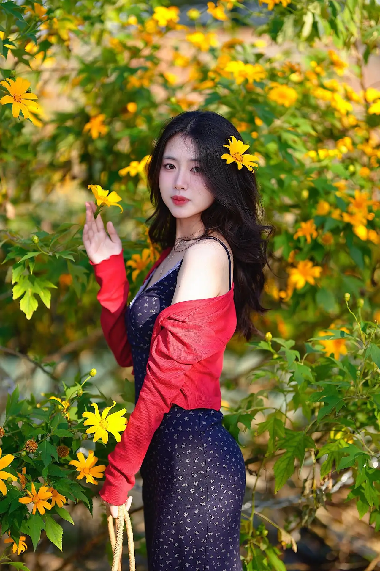 This stunning portrait captures an Asian girl radiating gentle beauty and elegance. With her long flowing hair and captivating gaze she delicately holds a vibrant yellow flower as if merging with nature's charm. The golden afternoon sunlight bathes the scene creating a warm and romantic ambiance that highlights her smooth skin and harmonious facial features. A red cardigan casually draped over her shoulder adds a touch of grace and style to the overall image. This is not just a fashion photograph but an art piece celebrating natural beauty and feminine sophistication offering viewers a sense of peace and comfort.#asiangirl #portraitphotography #yellowflowers #goldenhour #naturalbeauty
