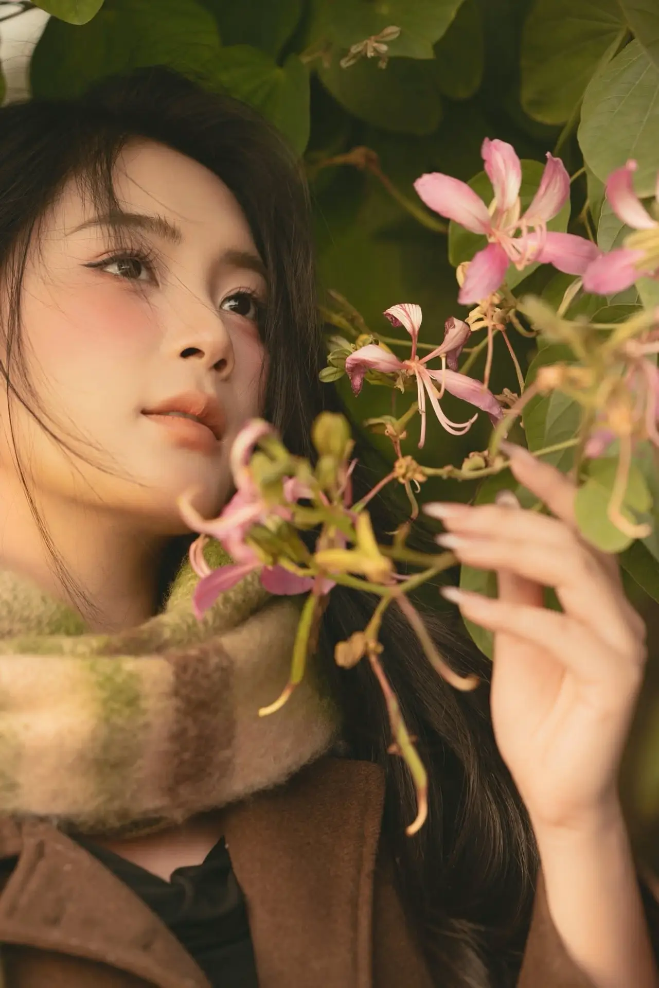 Elegant Asian Girl Portrait with Golden Flowers in Afternoon Sun 1000024552