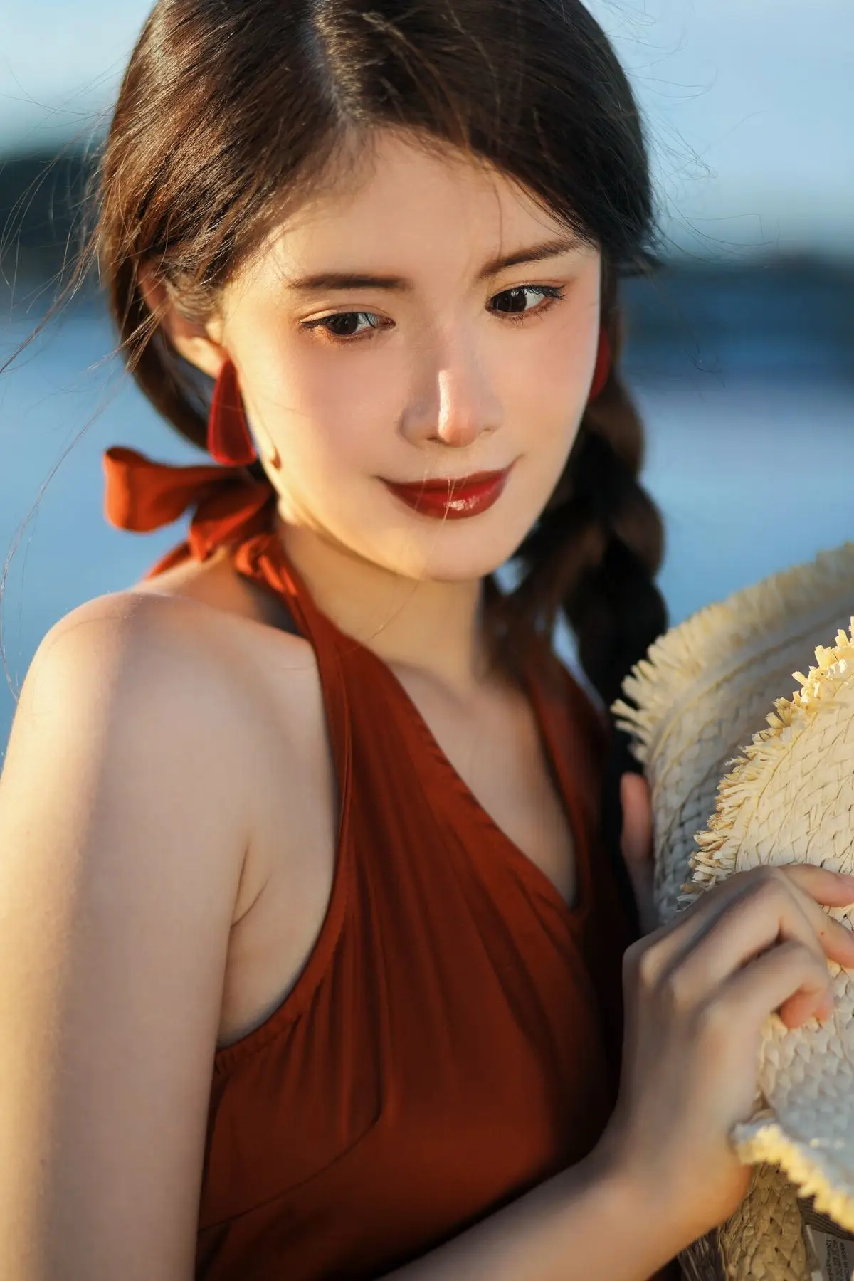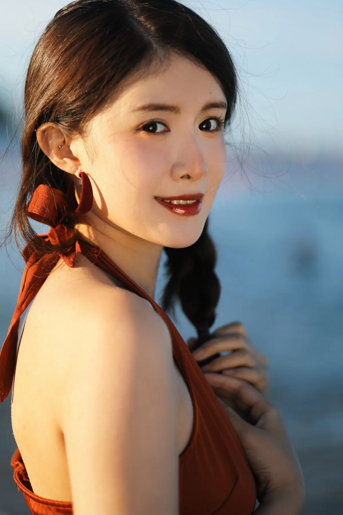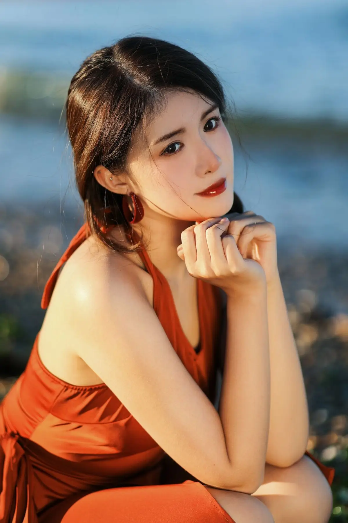 In this stunning YiTuYu Vol.8522 collection, model Yi Ming embodies elegant allure under the radiant golden hour sun. Her delicate profile, accentuated by vibrant red lips and lustrous brown hair kissed by the sunset glow, creates a truly enchanting moment. Dressed in a sophisticated terracotta-toned outfit, she gracefully reveals a hint of bare shoulder, adding to her refined charm. The serene backdrop of calm waters and a clear blue sky perfectly complements Yi Ming's natural beauty and tranquil presence. This photograph is a beautiful fusion of a romantic setting and a captivating aura, offering an emotionally rich and unforgettable visual experience. Yi Ming in YiTuYu Vol.8522 truly shines as a muse of the afternoon.#YiTuYu #YiMing #AsianBeauty #GoldenHour #SubtleAllure