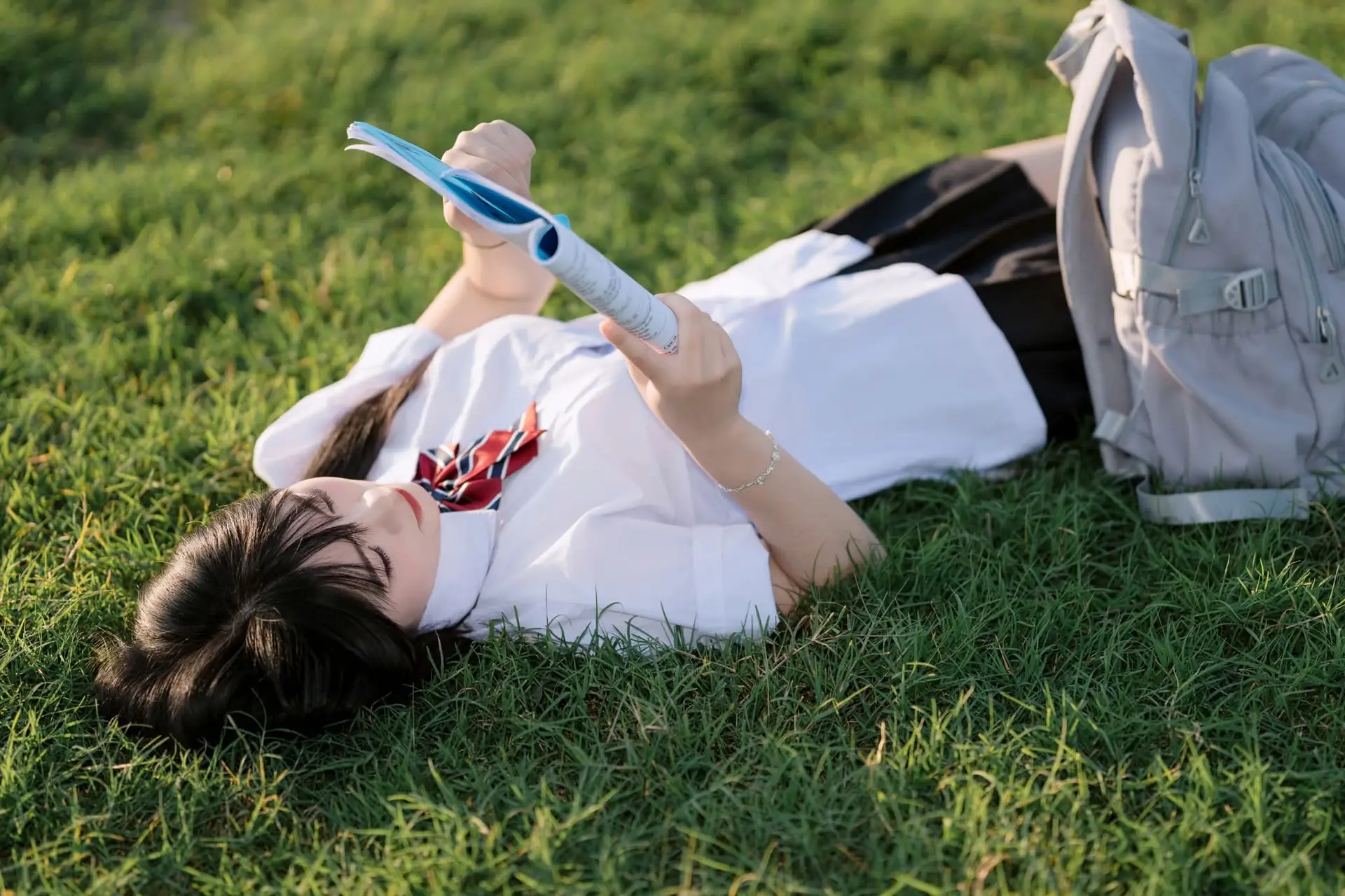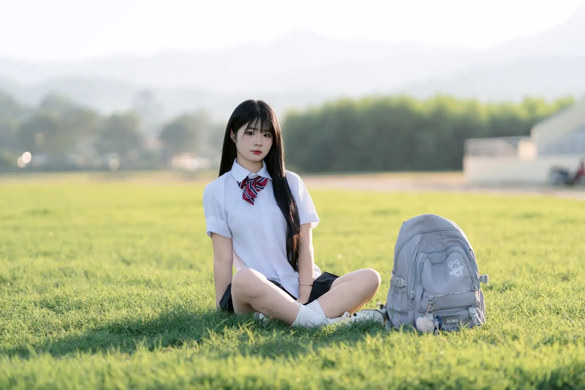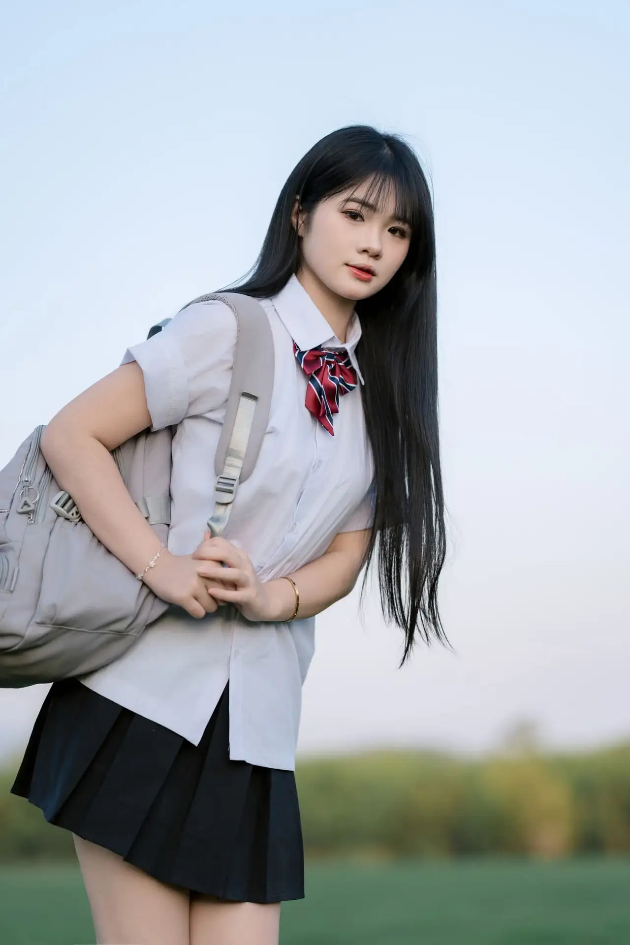This captivating photo features a young Asian schoolgirl in her traditional uniform standing gracefully against a lush green backdrop The warm golden light of the setting sun bathes her in a soft glow creating a beautiful halo around her hair With a backpack slung over her shoulder and a gentle gaze she embodies the innocent charm and fresh beauty of youth and student life This moment evokes feelings of nostalgia for school days and the peaceful simplicity of adolescence It is an authentic and emotionally resonant image that perfectly captures the essence of a beautiful schoolgirl in a natural setting#Schoolgirl #SchoolUniform #YouthfulBeauty #StudentLife #GoldenHour