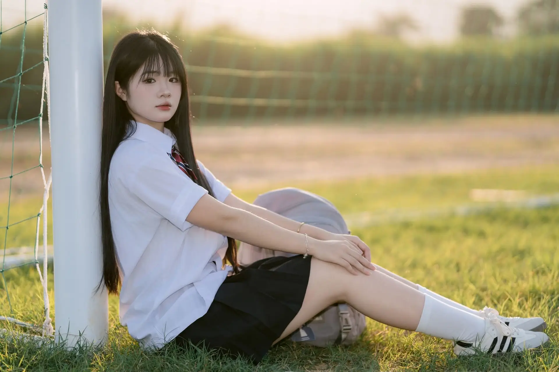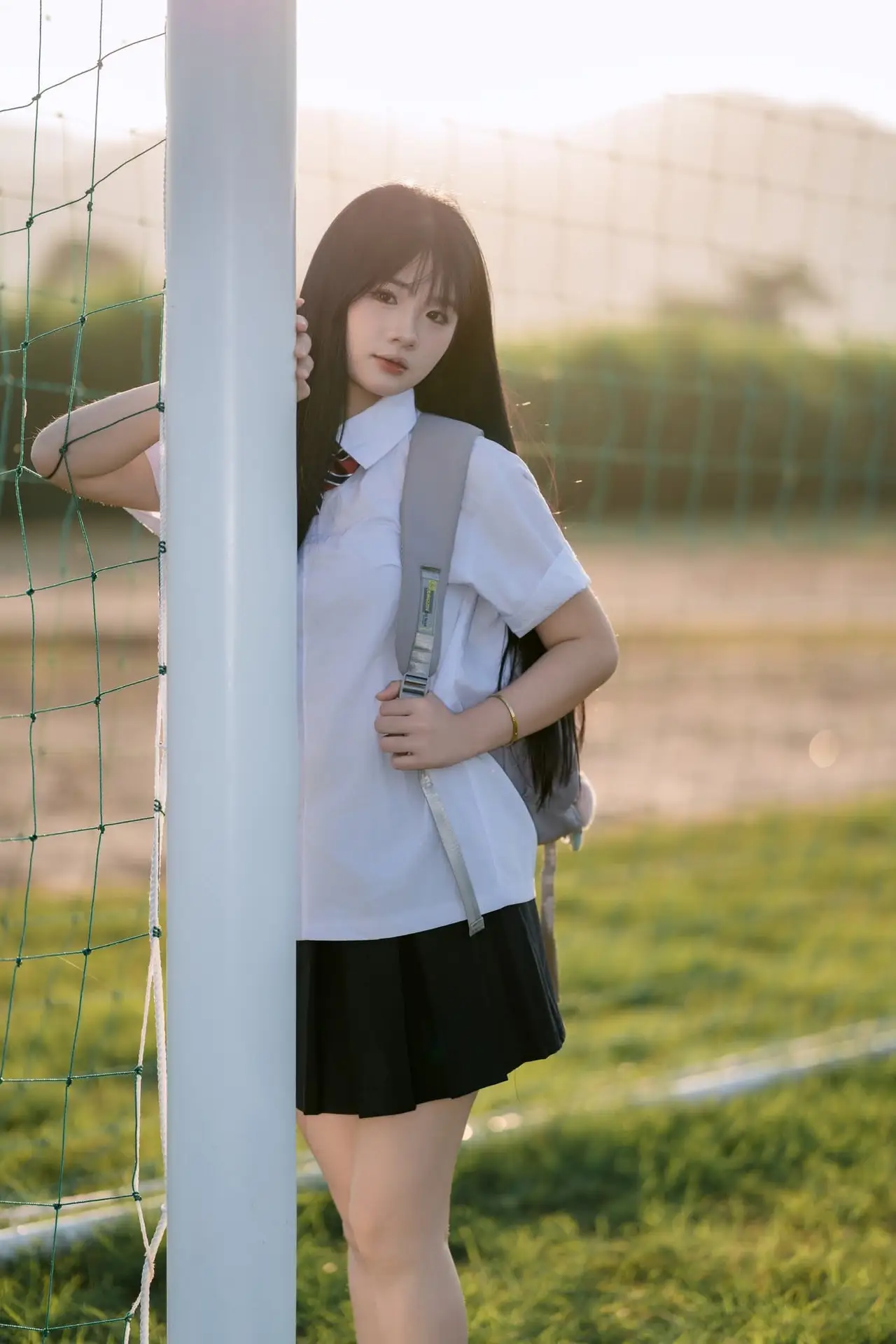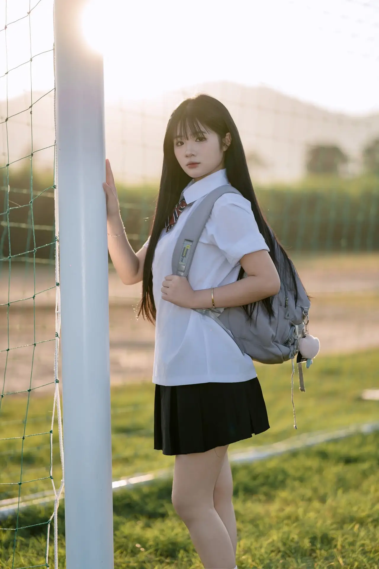 Youthful Schoolgirl in Uniform: Serene Golden Hour Beauty, a Glimpse into Nostalgic Student Life.