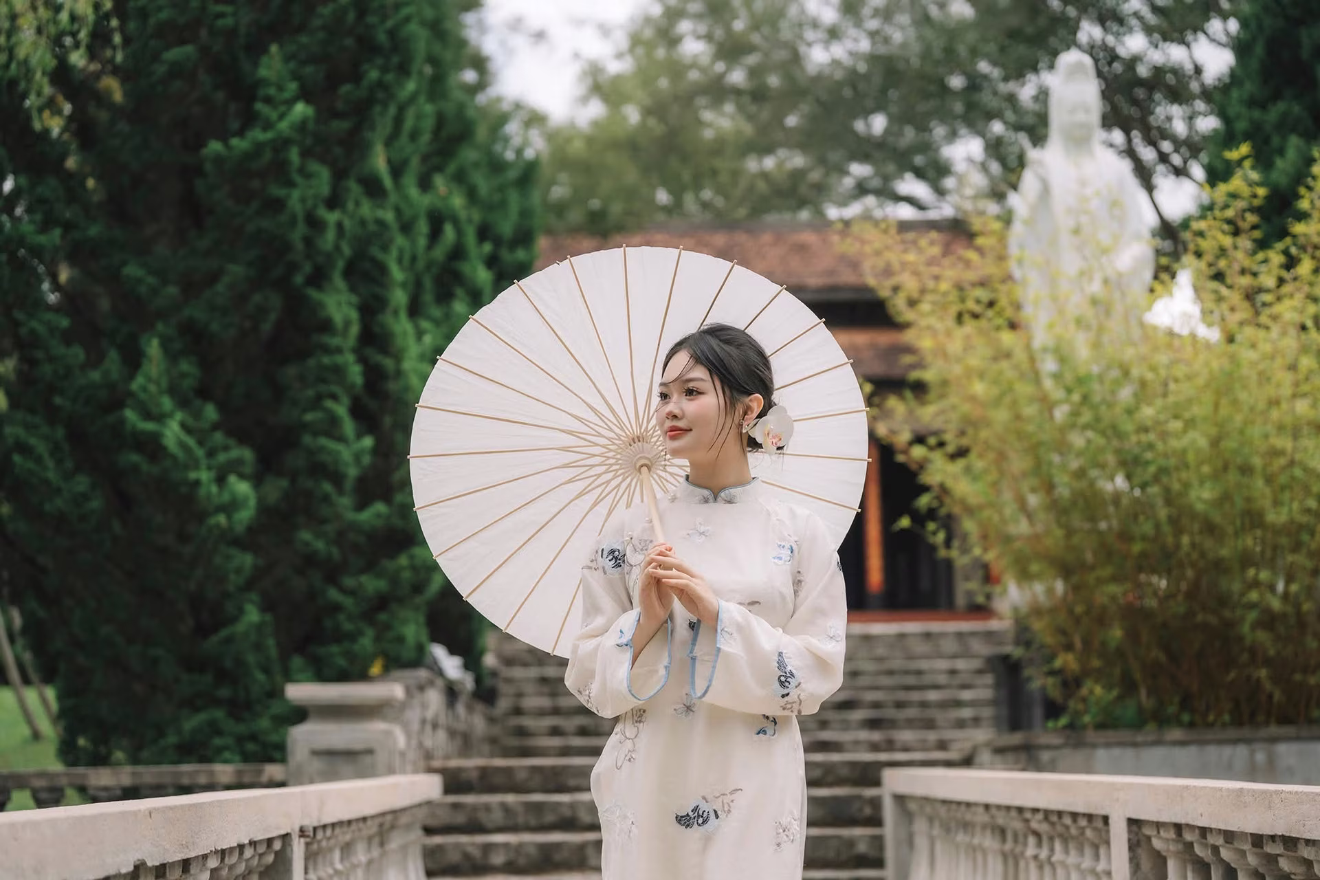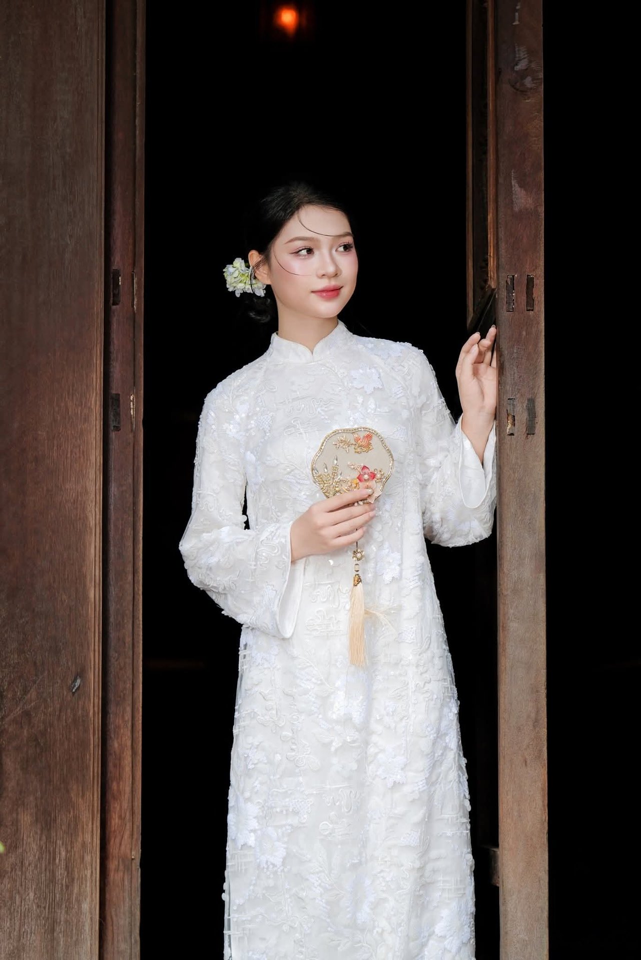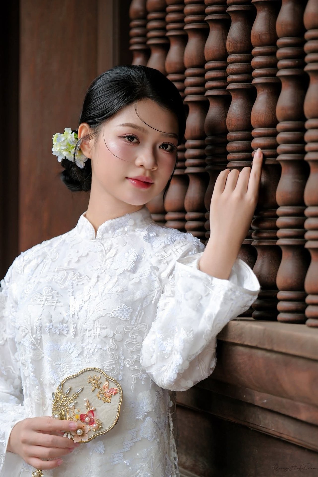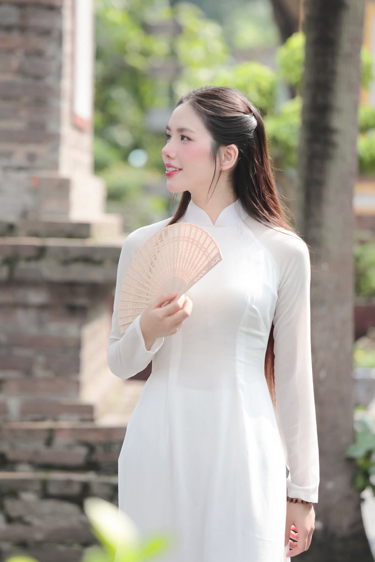 This captivating image features a graceful Asian woman adorned in a luxurious black velvet Cheongsam Qipao. The exquisite gold embroidery on the soft velvet fabric creates a stunning visual, evoking a sense of classic elegance and sophistication. Her serene expression long dark hair and the delicate fan she holds perfectly embody timeless Asian beauty and traditional charm. Posed against a backdrop of traditional architecture she represents a harmonious blend of cultural heritage and contemporary style. Every detail from her radiant gold earrings to the soft feather accents on her sleeves enhances her allure. This portrait is a celebration of enduring beauty and unique fashion inspiring admiration for both tradition and modernity.Elegant Vietnamese woman in traditional white Ao Dai, showcasing graceful beauty amidst ancient architecture.