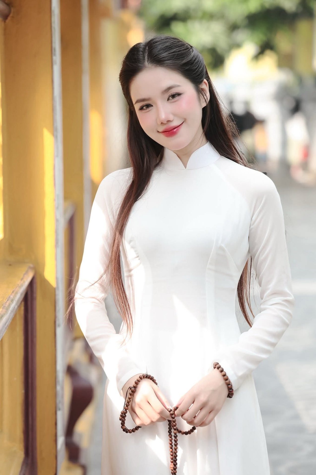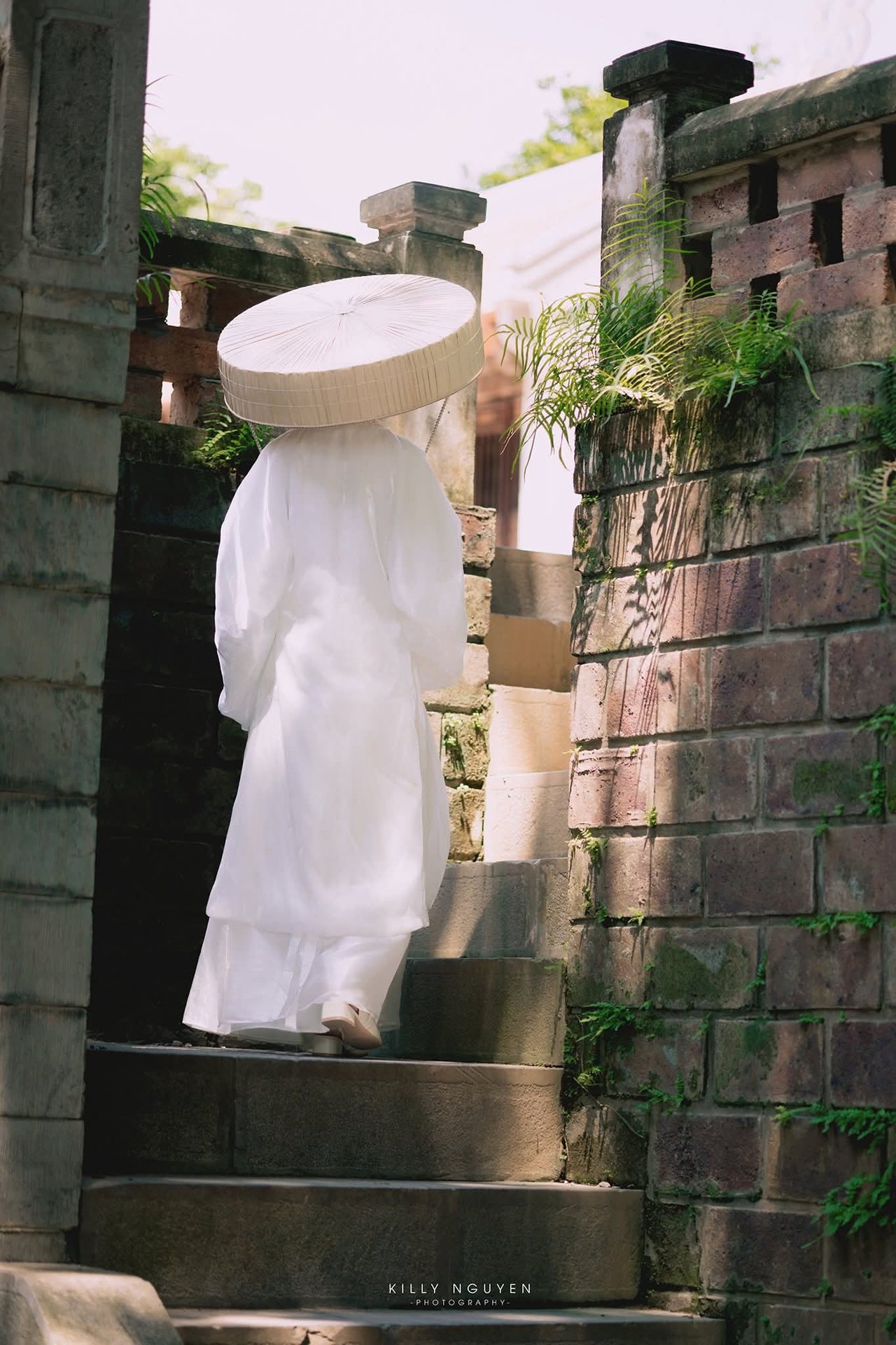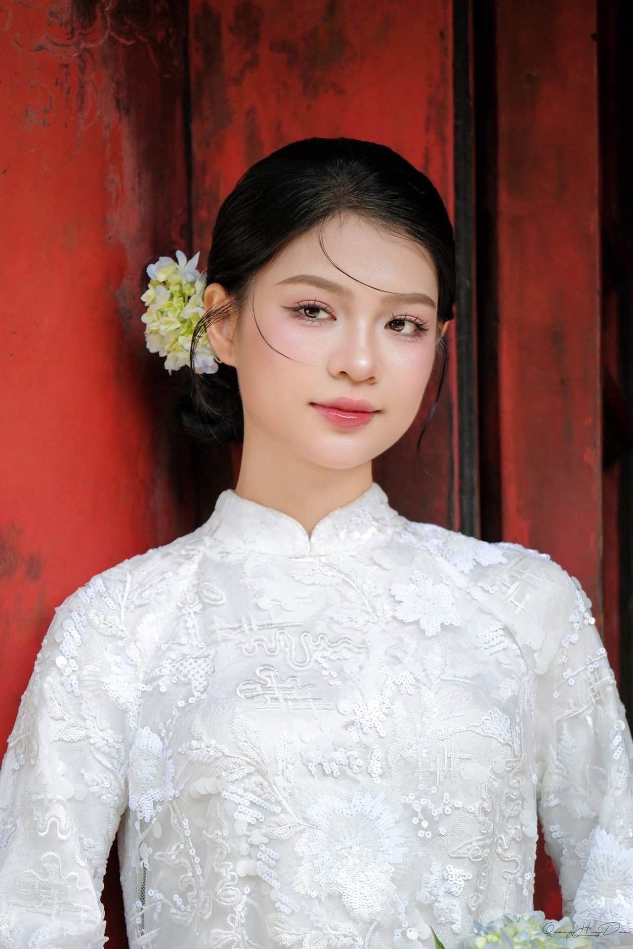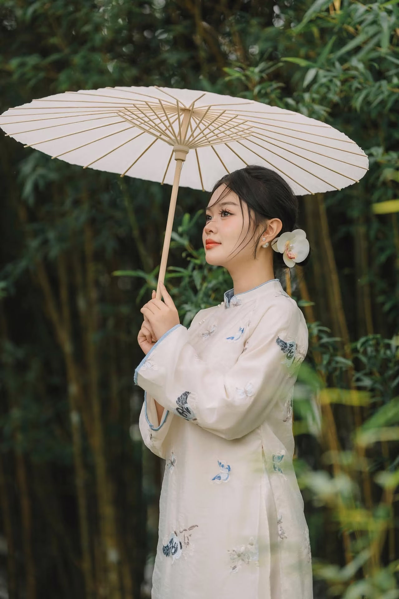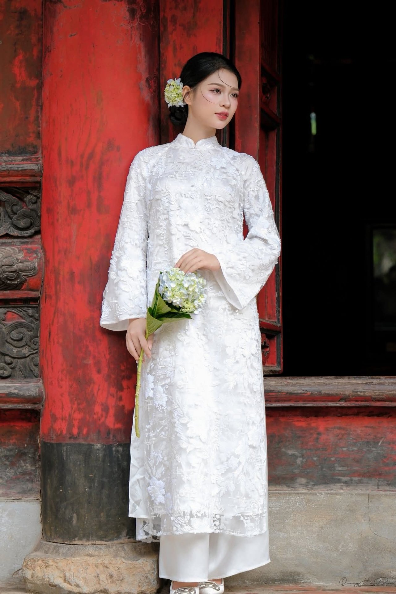 This captivating image features a graceful Asian woman adorned in a luxurious black velvet Cheongsam Qipao. The exquisite gold embroidery on the soft velvet fabric creates a stunning visual, evoking a sense of classic elegance and sophistication. Her serene expression long dark hair and the delicate fan she holds perfectly embody timeless Asian beauty and traditional charm. Posed against a backdrop of traditional architecture she represents a harmonious blend of cultural heritage and contemporary style. Every detail from her radiant gold earrings to the soft feather accents on her sleeves enhances her allure. This portrait is a celebration of enduring beauty and unique fashion inspiring admiration for both tradition and modernity.Elegant Vietnamese woman in traditional white Ao Dai, showcasing graceful beauty amidst ancient architecture.