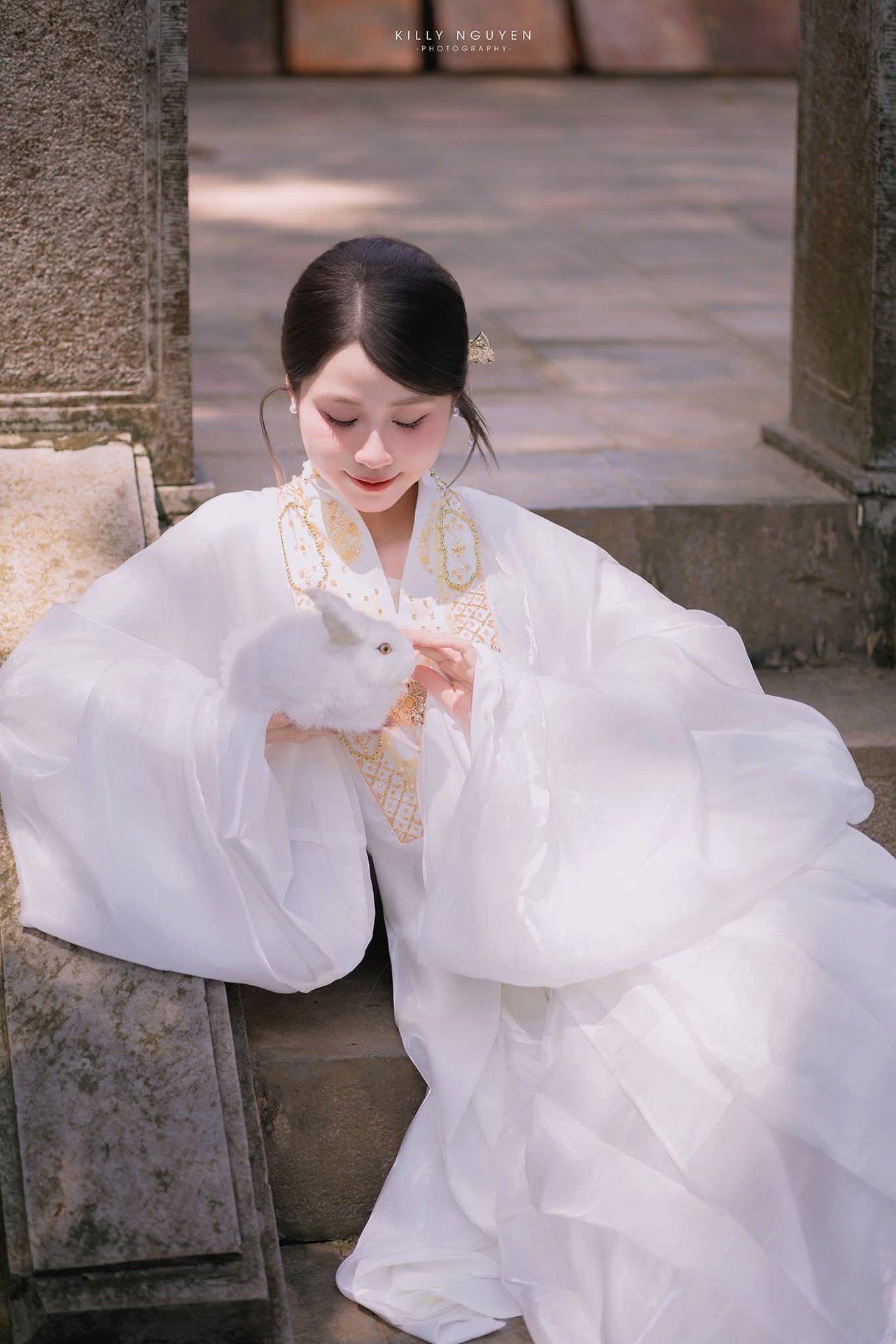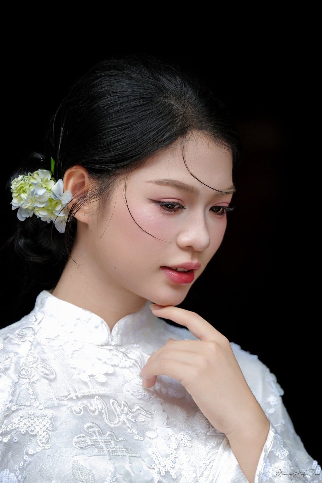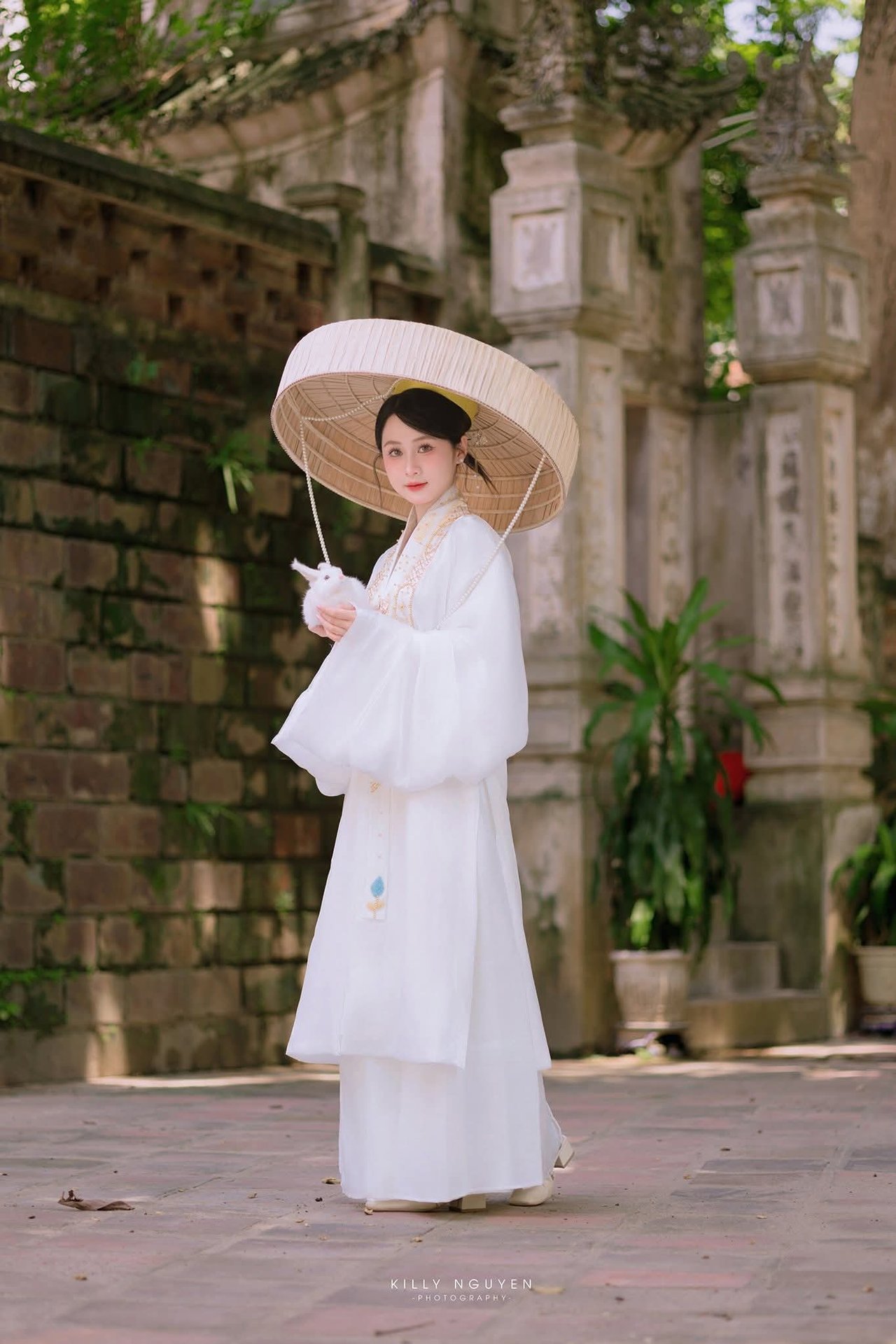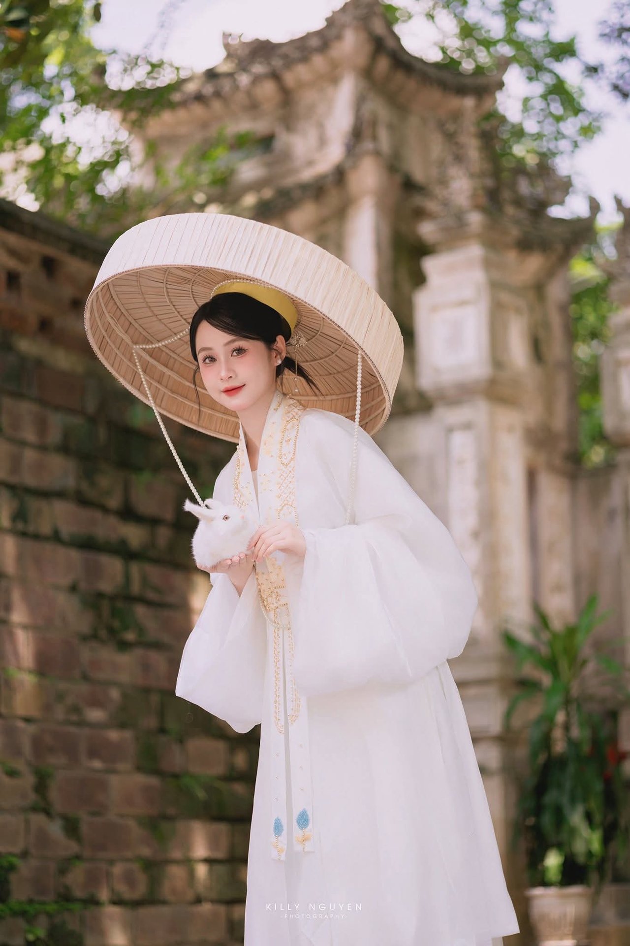This captivating image features a graceful Asian woman adorned in a luxurious black velvet Cheongsam Qipao. The exquisite gold embroidery on the soft velvet fabric creates a stunning visual, evoking a sense of classic elegance and sophistication. Her serene expression long dark hair and the delicate fan she holds perfectly embody timeless Asian beauty and traditional charm. Posed against a backdrop of traditional architecture she represents a harmonious blend of cultural heritage and contemporary style. Every detail from her radiant gold earrings to the soft feather accents on her sleeves enhances her allure. This portrait is a celebration of enduring beauty and unique fashion inspiring admiration for both tradition and modernity.Elegant Vietnamese woman in traditional white Ao Dai, showcasing graceful beauty amidst ancient architecture.