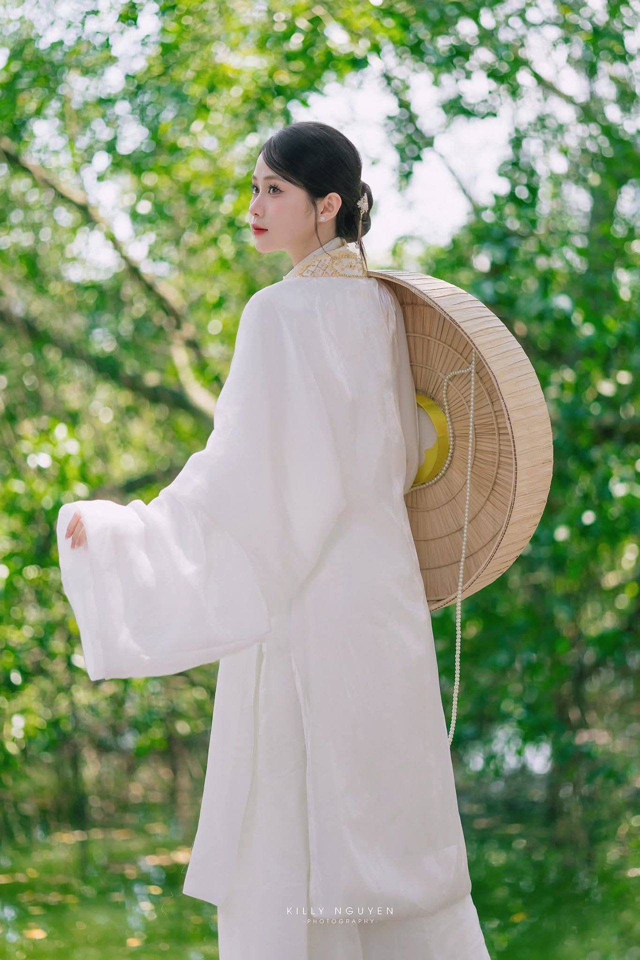 The image captures a serene young woman, embodying the grace of Vietnamese culture. Dressed in elegant white traditional attire adorned with delicate gold accents, she exudes timeless beauty. Her wide-brimmed hat, a symbol often associated with Vietnamese tradition, adds to her mystique. This scene beautifully portrays the rich heritage and traditional values deeply embedded in Vietnamese identity. It's a visual ode to the gentle spirit and profound cultural depth of Vietnam, inviting viewers to appreciate the enduring elegance of its people and traditions. The soft lighting and natural setting further enhance the authentic feel, making this a captivating representation of Vietnamese women and their cultural legacy.Stories