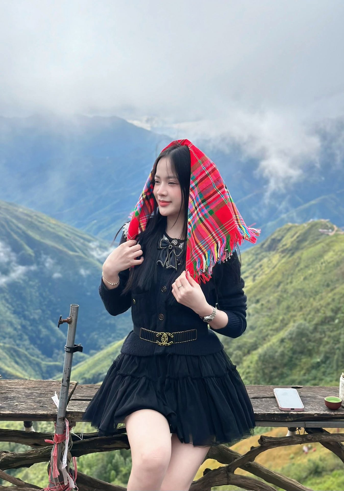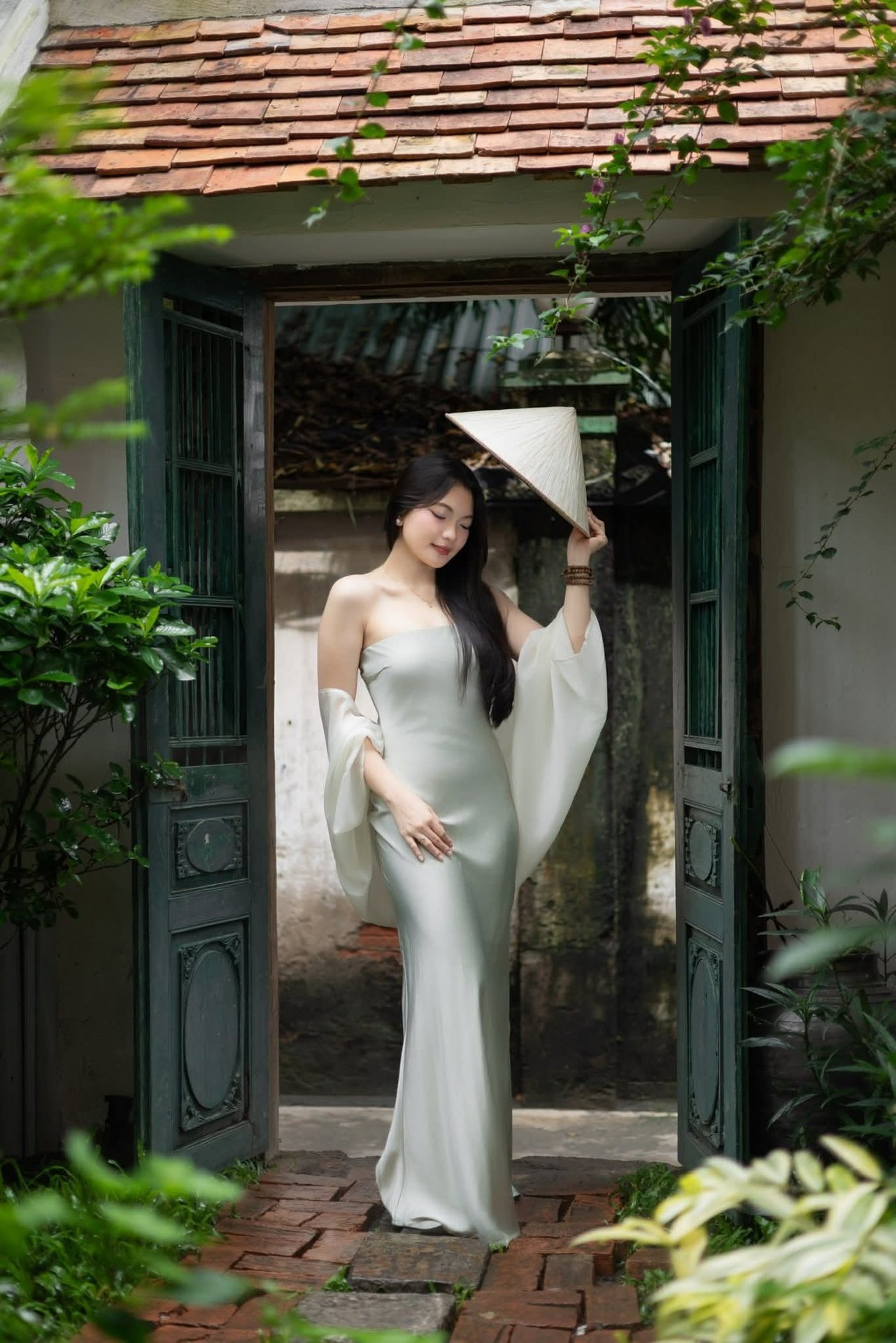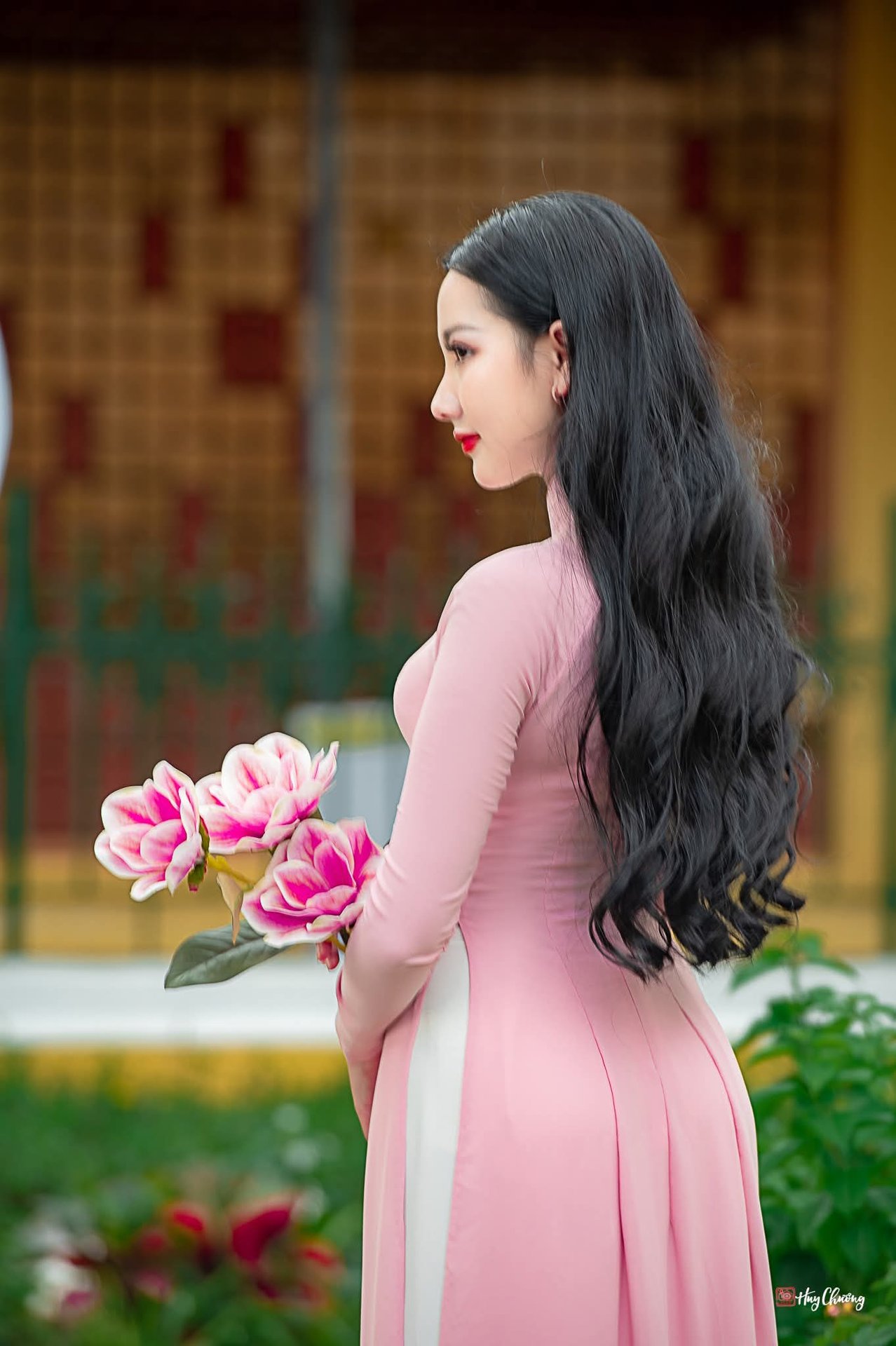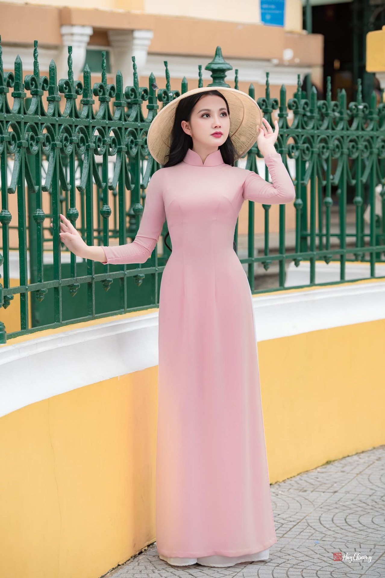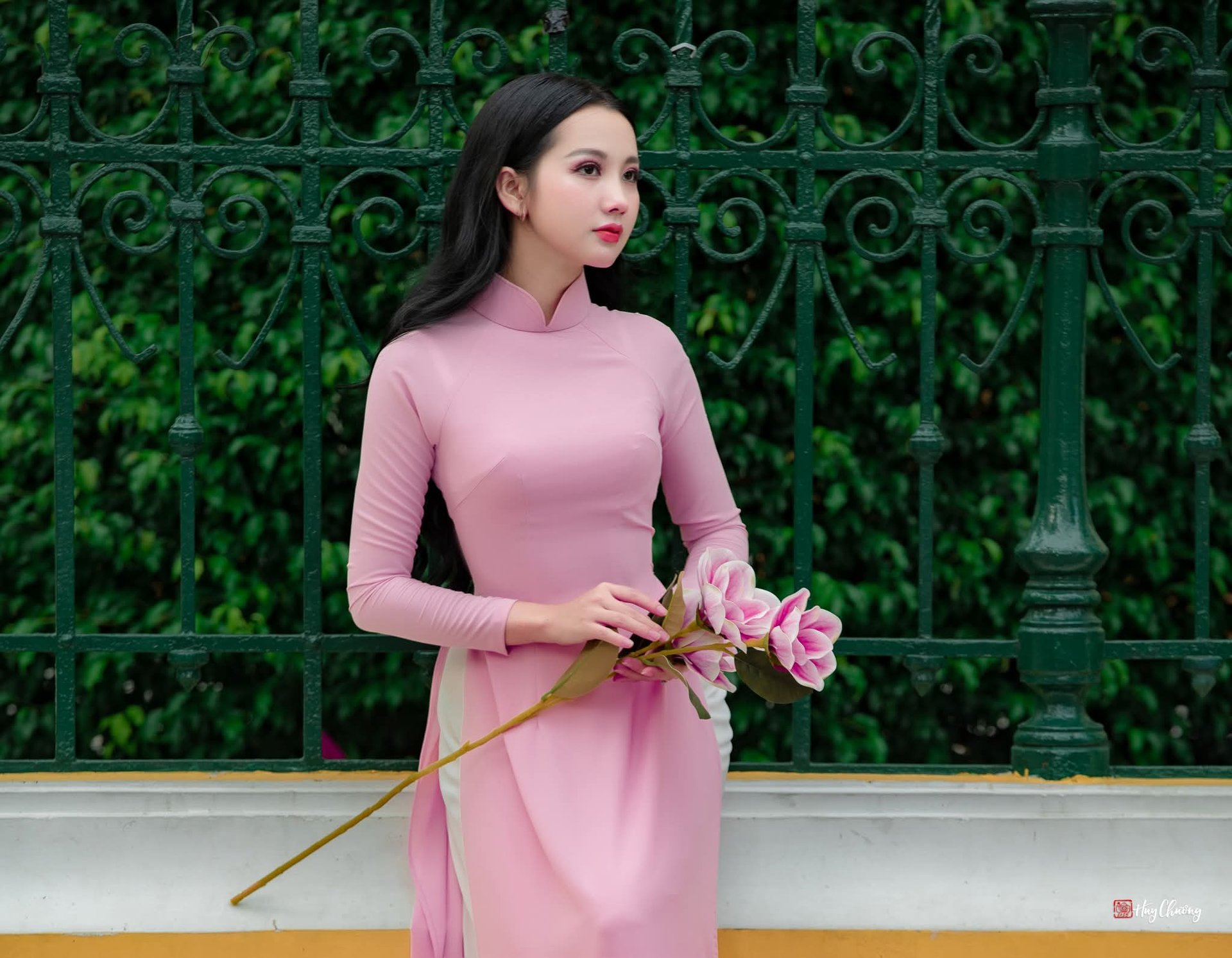 This exquisite photograph captures a gentle and graceful Vietnamese young woman adorned in a traditional pink Ao Dai. The form-fitting dress beautifully accentuates her slender figure paired with white trousers to create an allure that is both modest and captivating. Seated serenely amidst lush greenery she delicately holds a small bouquet of pink flowers her gaze evoking the shy elegance and tender charm characteristic of Vietnamese women. More than just a personal portrait this image is a vibrant symbol of the cultural heritage sophistication and timeless grace of Vietnamese femininity. It truly inspires pride in the national attire and the enduring beauty of the Ao Dai.Traditional Vietnamese Beauty: Elegant Lady in Royal Attire & Conical Hat