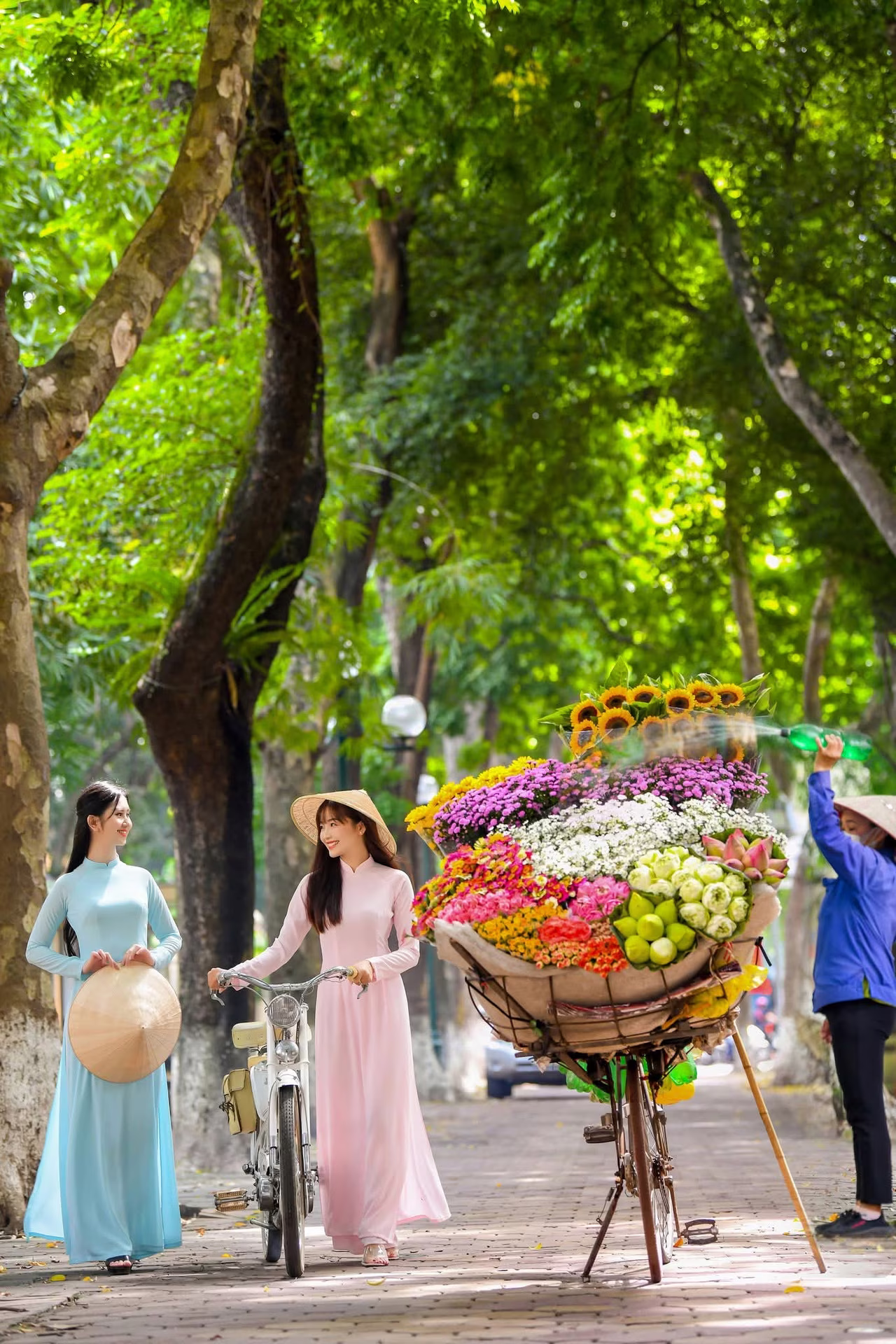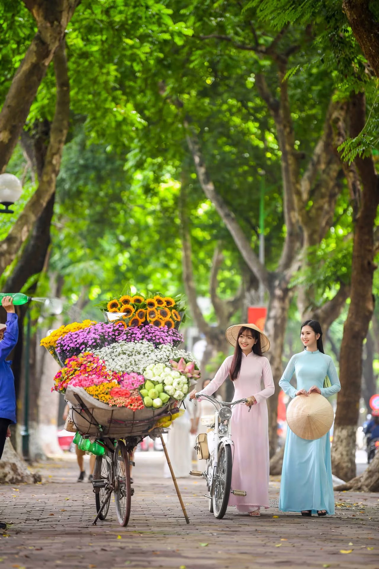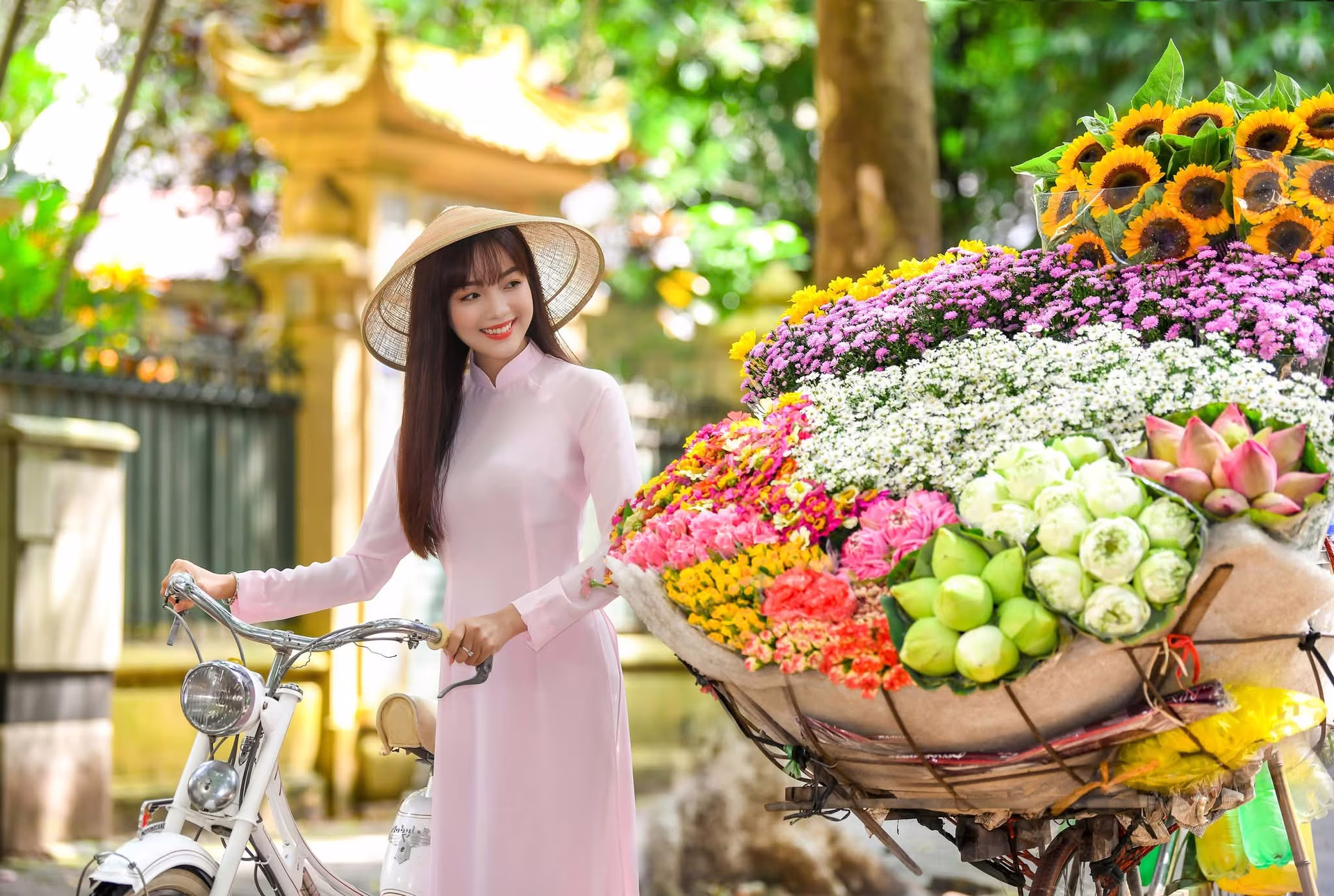This captivating image XVG No23 celebrates the gentle beauty of a Vietnamese lady in a flowing pink Ao Dai beside a bicycle overflowing with vibrant fresh flowers She wears a traditional conical hat smiling gracefully embodying timeless elegance and cultural heritage The serene tree lined street forms a harmonious backdrop evoking the distinct cultural essence of Vietnam The flower laden bicycle with sunflowers daisies and various blossoms symbolizes not just transport but also vitality and a deep connection to nature This scene beautifully captures the grace of Vietnamese women blending seamlessly with the fresh colors of everyday life The photograph invites viewers to explore the simple yet alluring charm of VietnamXVG No.18 - Elegant Vietnam: Captivating Traditional Beauty in a Sacred Setting
