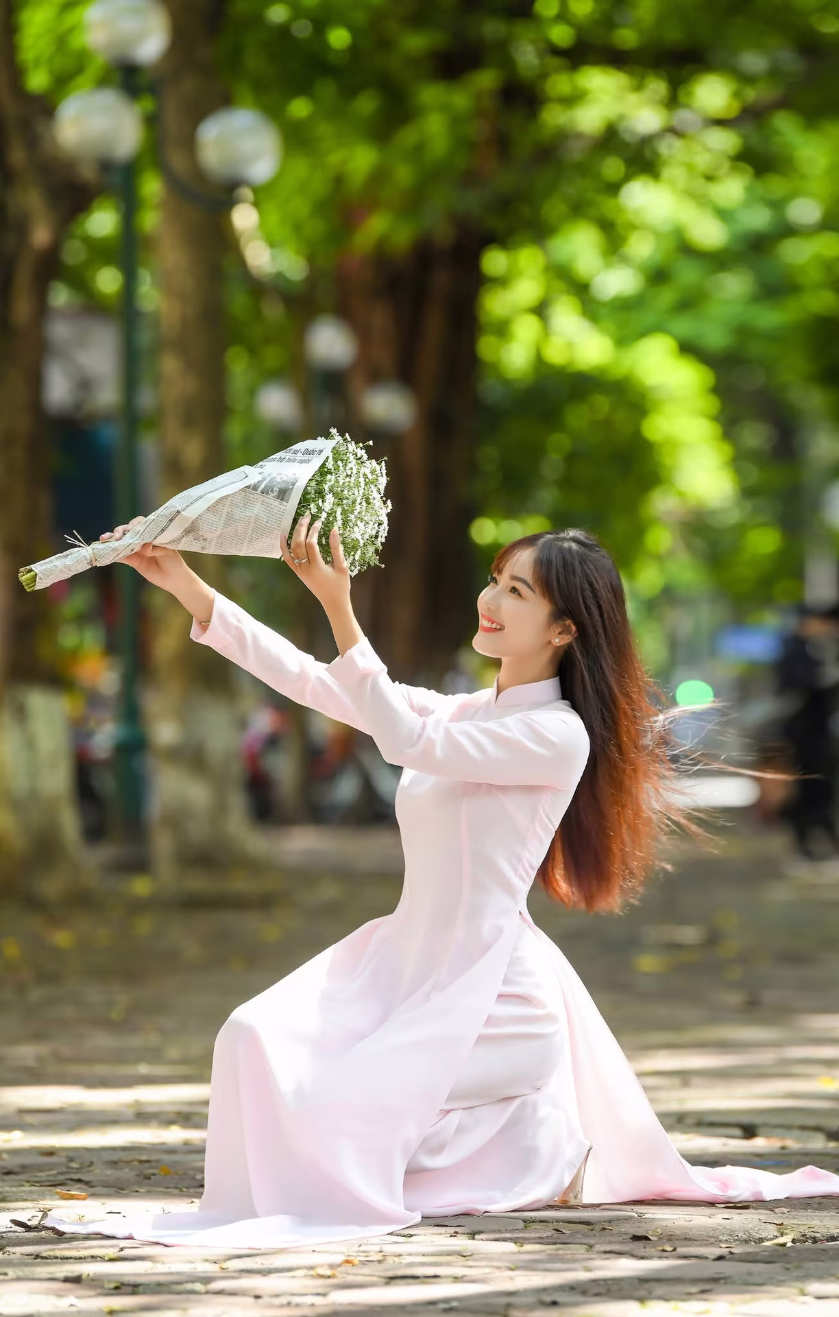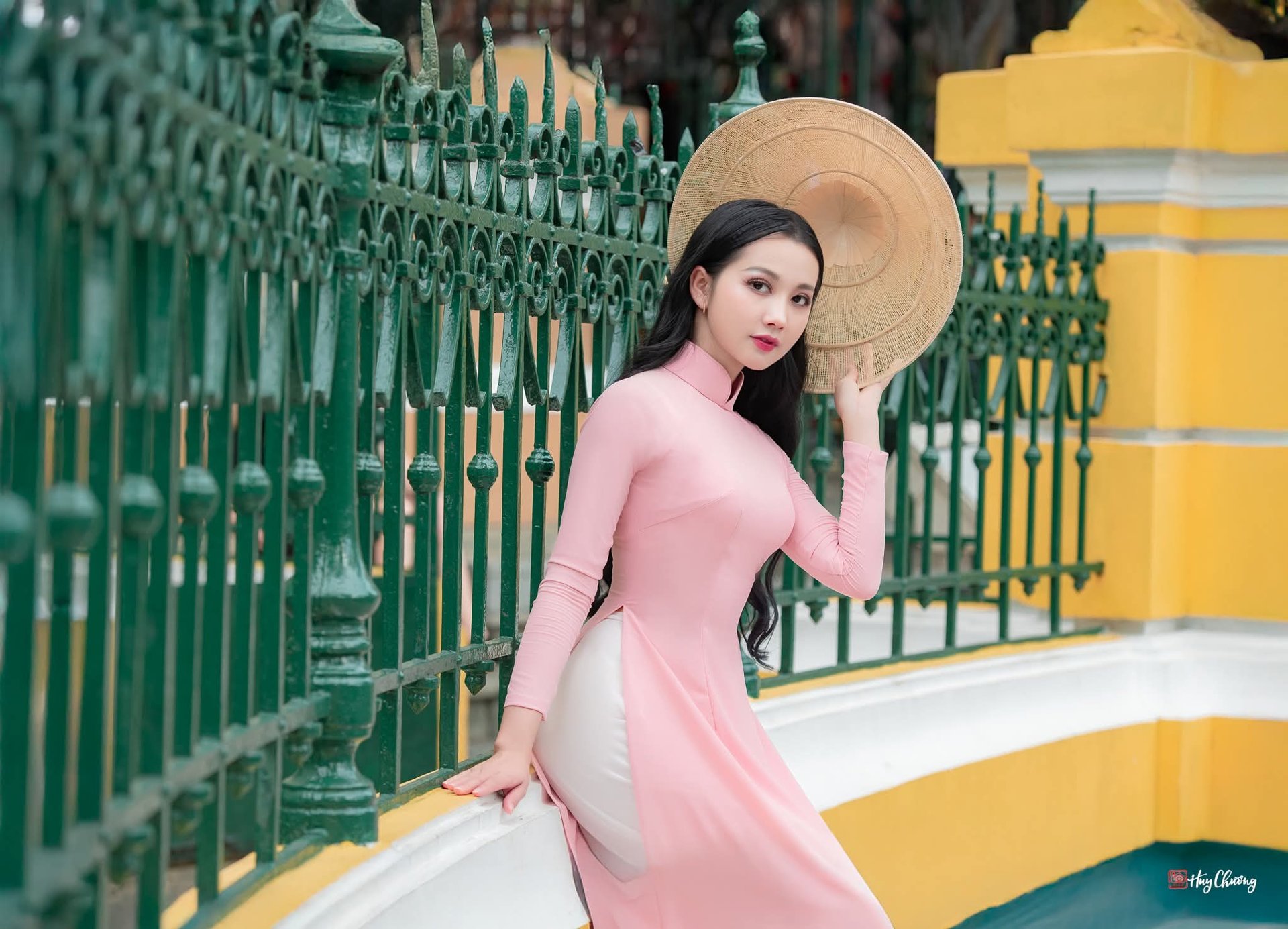 This captivating image beautifully portrays the graceful and elegant beauty of a Vietnamese girl adorned in a delicate traditional outfit. Her gentle smile and modest gaze beneath the brim of the conical hat evoke a strong sense of Asian charm, reminiscent of Vietnam's profound cultural heritage. The pristine white off-shoulder dress, showcasing her slender shoulders, perfectly complements the rustic conical hat, highlighting her refined and elegant demeanor. The ancient architecture in the background further enhances the timeless beauty of the Vietnamese woman. This photograph is not just a beautiful moment but also a tribute to traditional aesthetics, conveying a feeling of peace and nostalgia.Elegant Vietnamese Woman in Pink Ao Dai Gracing a Sunny Park