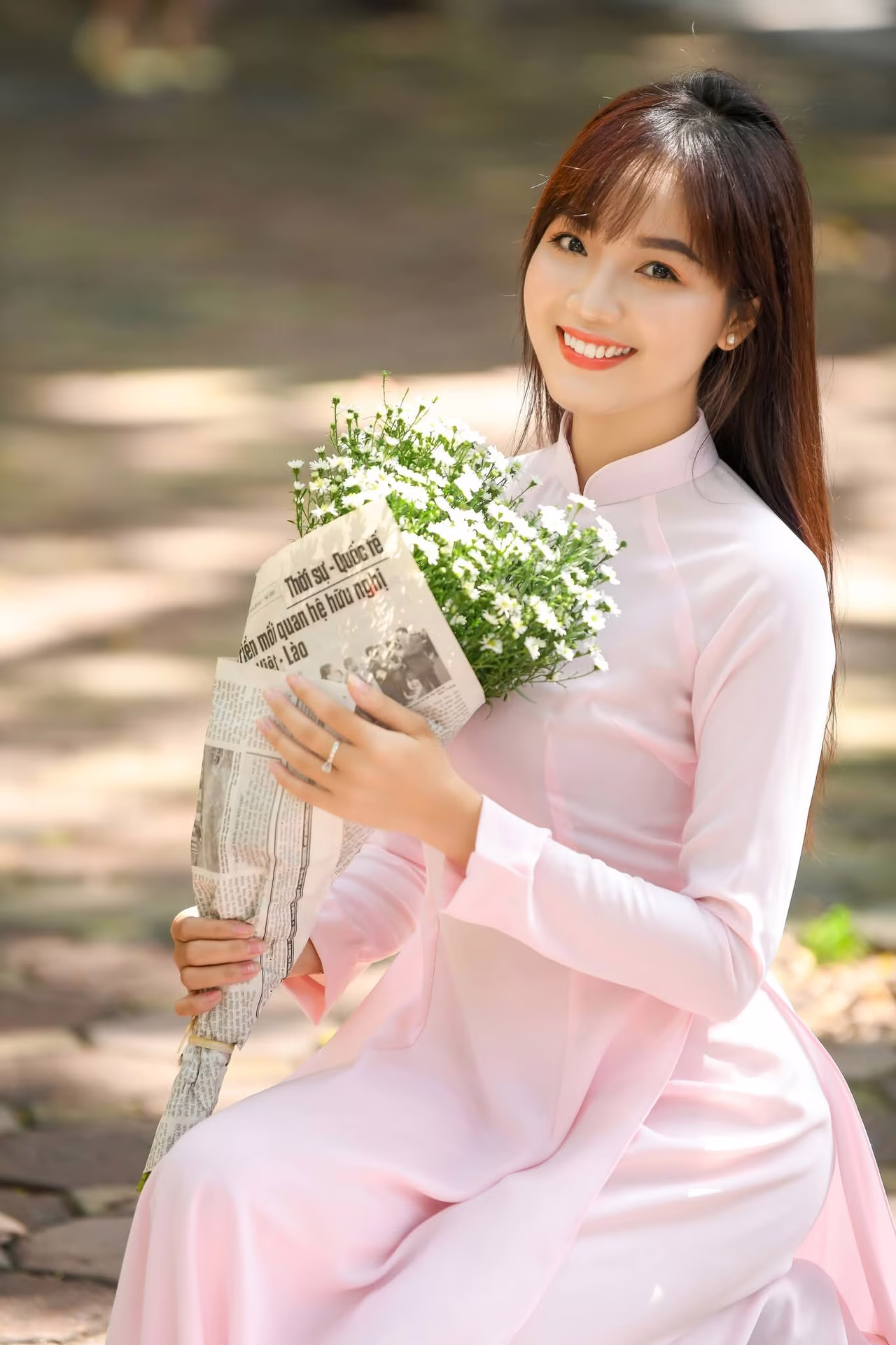 This stunning photograph captures a graceful Vietnamese woman adorned in a pristine pink and white Ao Dai. She sits elegantly on a classic park bench amidst the lush green scenery bathed in gentle sunlight. Her delicate beauty is further highlighted by her long flowing dark hair and the pure white bouquet she tenderly holds. The traditional Ao Dai is not merely an outfit but a profound symbol of elegance nobility and cultural heritage. This image beautifully conveys a sense of peace profound cultural beauty and the unique charming allure of Vietnamese women offering viewers a moment of tranquility and admiration.