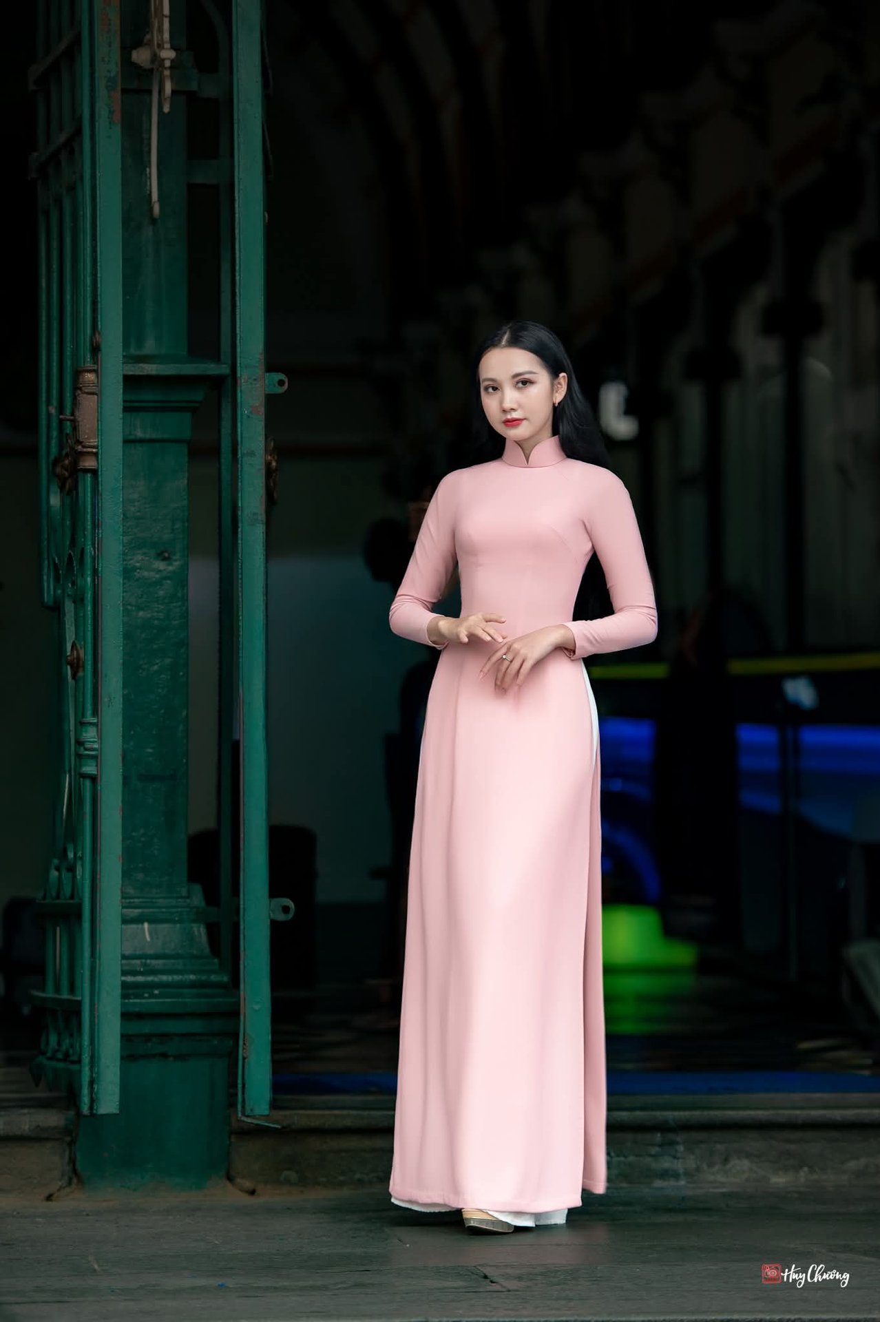 This captivating image beautifully captures the traditional grace of Vietnamese women through the portrayal of an elegant young lady in royal court attire She dons a vibrant golden Ao Nhat Binh adorned with exquisite embroidered patterns exuding the sophistication and nobility of ancient Vietnamese culture The traditional Non Quai Thao hat and the delicate hand fan further enhance her refined classic charm Her gaze is distant and contemplative as if conveying deep sentiments evoking memories of a golden era in history This is more than just a photograph it is a narrative of a rich cultural heritage a source of pride for the distinctive traditional costumes of the Vietnamese people This image will undoubtedly stir feelings of affection and appreciation for traditional values in everyoneElegant Woman in Pink Ao Dai at Hanoi Grand Cathedral - Vietnamese Cultural Charm