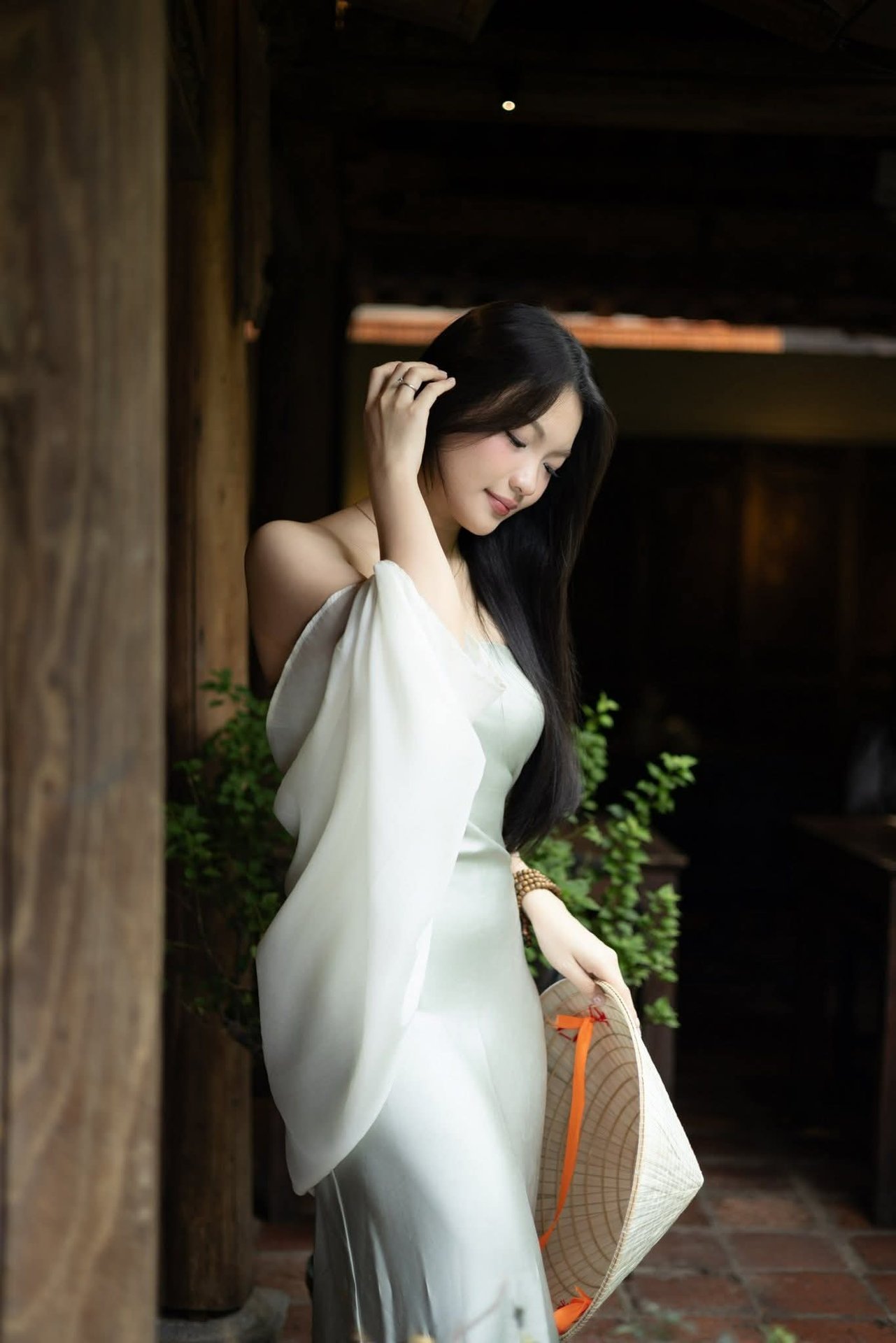 This exquisite photograph captures the serene elegance of a Vietnamese woman adorned in traditional attire Standing gracefully within an ancient architectural setting she embodies the timeless beauty and cultural richness of Vietnam Her gentle gaze and composed demeanor reflect a profound sense of peace and inner tranquility The delicate white flower adorning her neatly styled hair enhances her refined charm Her pristine white garment harmonizes beautifully with the rustic wooden tones of the traditional structure creating a visually captivating and poetic scene More than just a portrait this image celebrates the enduring grace and cultural heritage of Vietnamese women offering a captivating glimpse into their unique eleganceGraceful Vietnamese Girl in Traditional Conical Hat