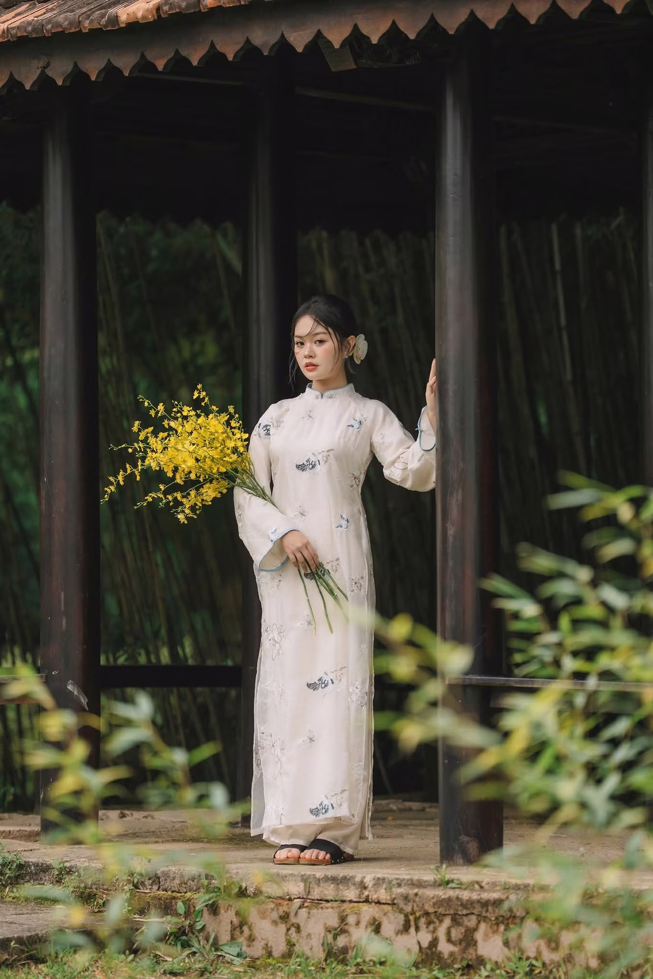 This captivating image beautifully portrays the elegant and graceful charm of a Vietnamese woman. Dressed in a pristine white ao dai adorned with subtle patterns she stands gracefully against the dark wooden pillars of a traditional structure. Her serene expression hair styled with a delicate flower and the vibrant bouquet of yellow flowers in her hands create a striking focal point. The ao dai more than just an attire symbolizes Vietnams rich cultural heritage accentuating the womans delicate figure and noble character. Surrounded by lush greenery the scene evokes a sense of tranquility and timeless beauty celebrating traditional values and the enduring allure of Vietnamese grace.