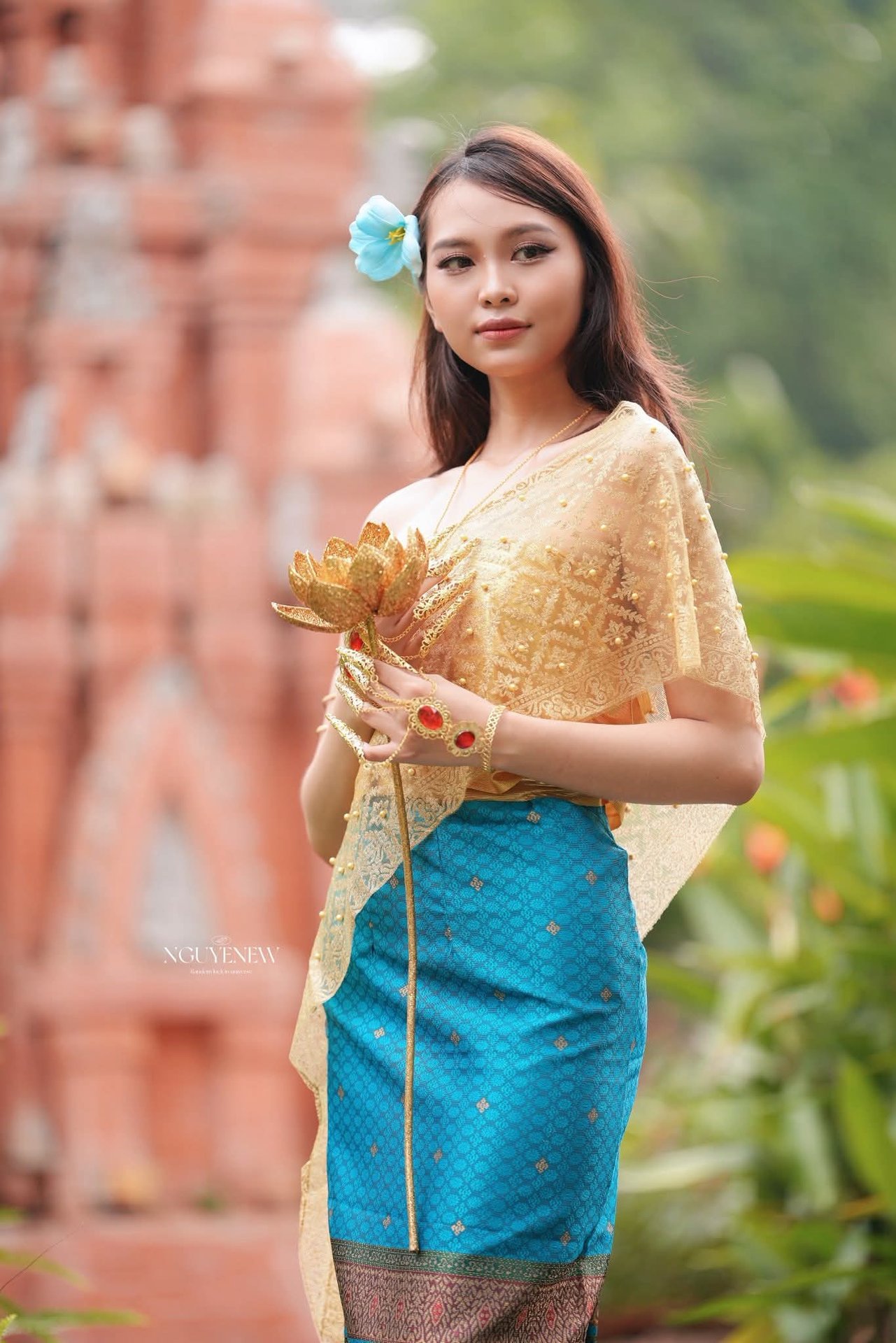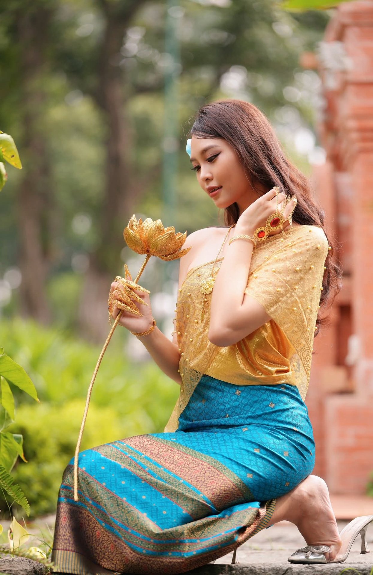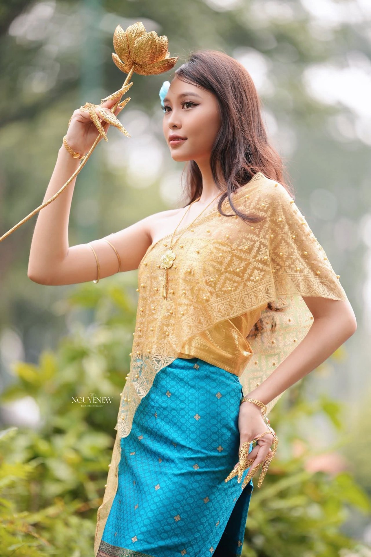 This image captures the gentle and graceful beauty of a young woman in traditional attire, exuding an elegant Oriental charm. The girl kneels softly, her hands gently cradling a radiant golden lotus, a symbol of purity and wisdom. Her finely woven golden and turquoise outfit celebrates long-standing cultural beauty, reminiscent of traditional Vietnamese values. The lush green background and ancient architecture further highlight the scene's elegance and tranquility. This image is not just a beautiful moment but also a deep connection to cultural heritage, evoking pride in traditional beauty. The serenity of the lotus and the ancient surroundings blend to create an emotional painting, showcasing the delicacy and timeless beauty of women in Vietnamese traditional culture.The Elegant Beauty of Vietnamese Women in Traditional Attire, A Symbol of Enduring Culture