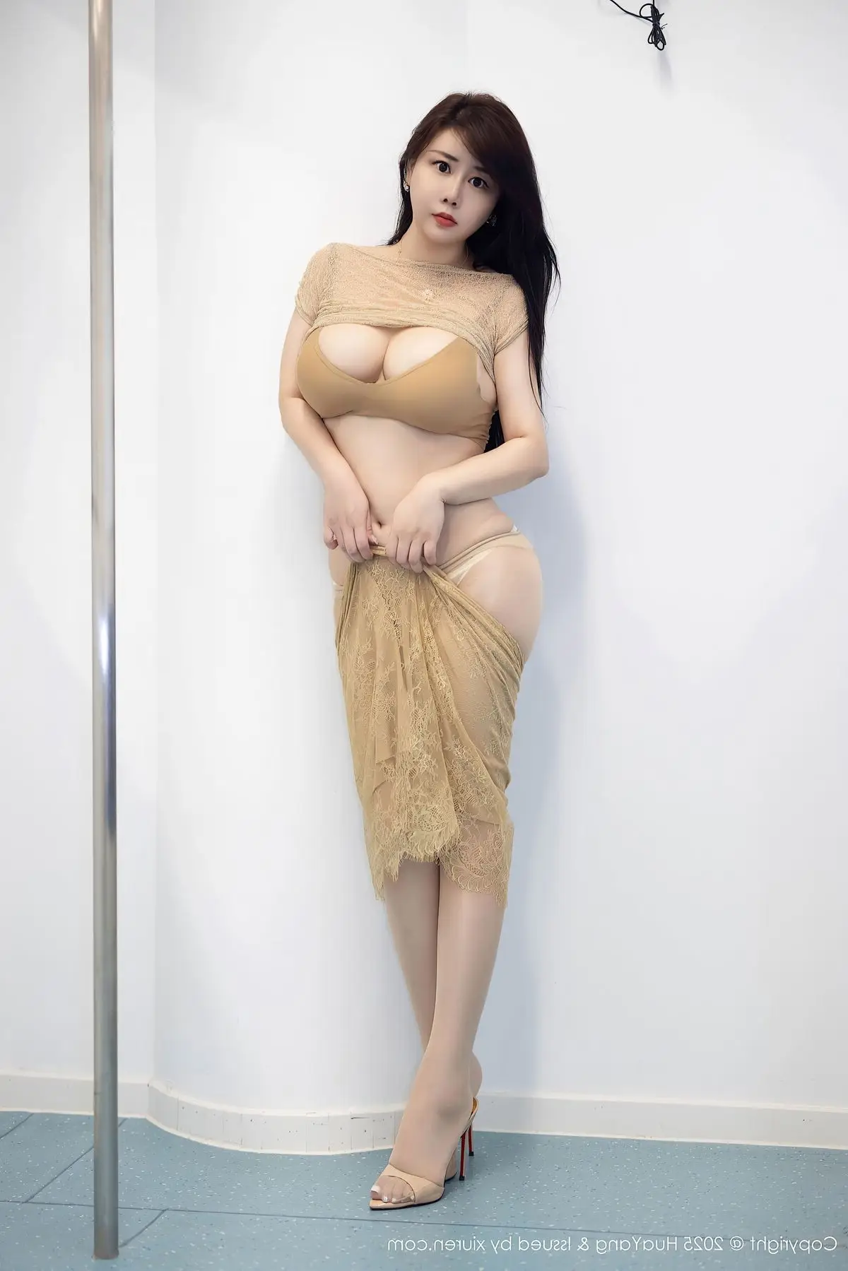 Discover the captivating beauty of model Huang Le Ran adorned in exquisite white sheer lace lingerie. Her long legs are elegantly highlighted by sheer stockings with intricate floral patterns perfectly complementing her alluring pose. This stunning image is part of the HuaYang Vol.045 collection showcasing a blend of sensuality and sophisticated elegance. The Chinese model exudes confidence and charm captivating viewers with her graceful presence. This beautiful girl photo offers an intimate glimpse into high fashion lingerie highlighting Huang Le Rans unique charm and poise