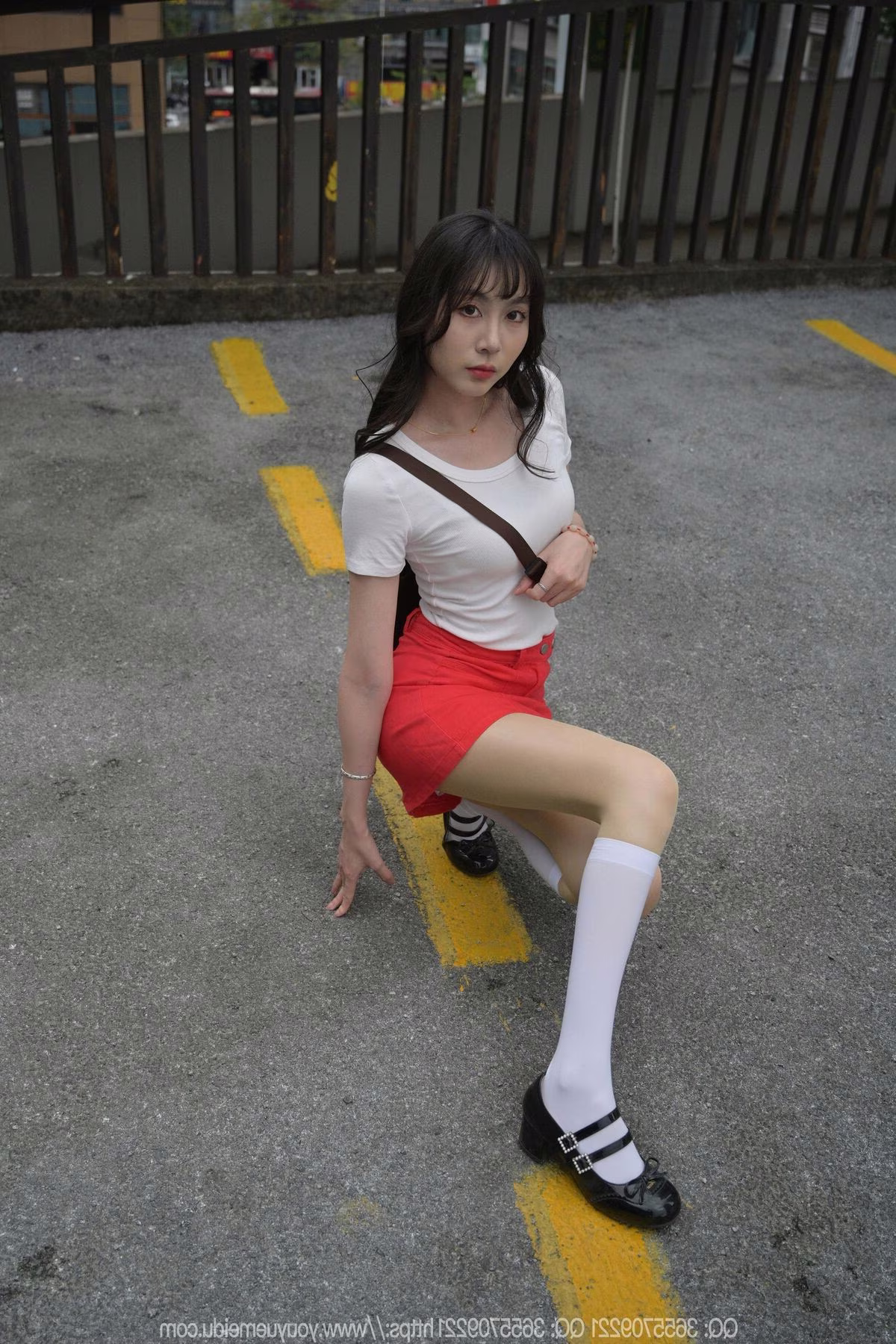 Discover the IESS SXJ No.2055 collection featuring model Tuan Tuan, who shines with natural beauty and captivating presence. The young woman sports a simple white t-shirt paired with a vibrant red mini skirt, creating an energetic and lively image. Tuan Tuan's gentle pose and contemplative gaze convey grace and a hint of mystery. The minimalist urban backdrop further accentuates her elegant features and refined fashion sense. This moment beautifully captures the harmonious blend of East Asian allure and contemporary style, showcasing her unique youthful charm.