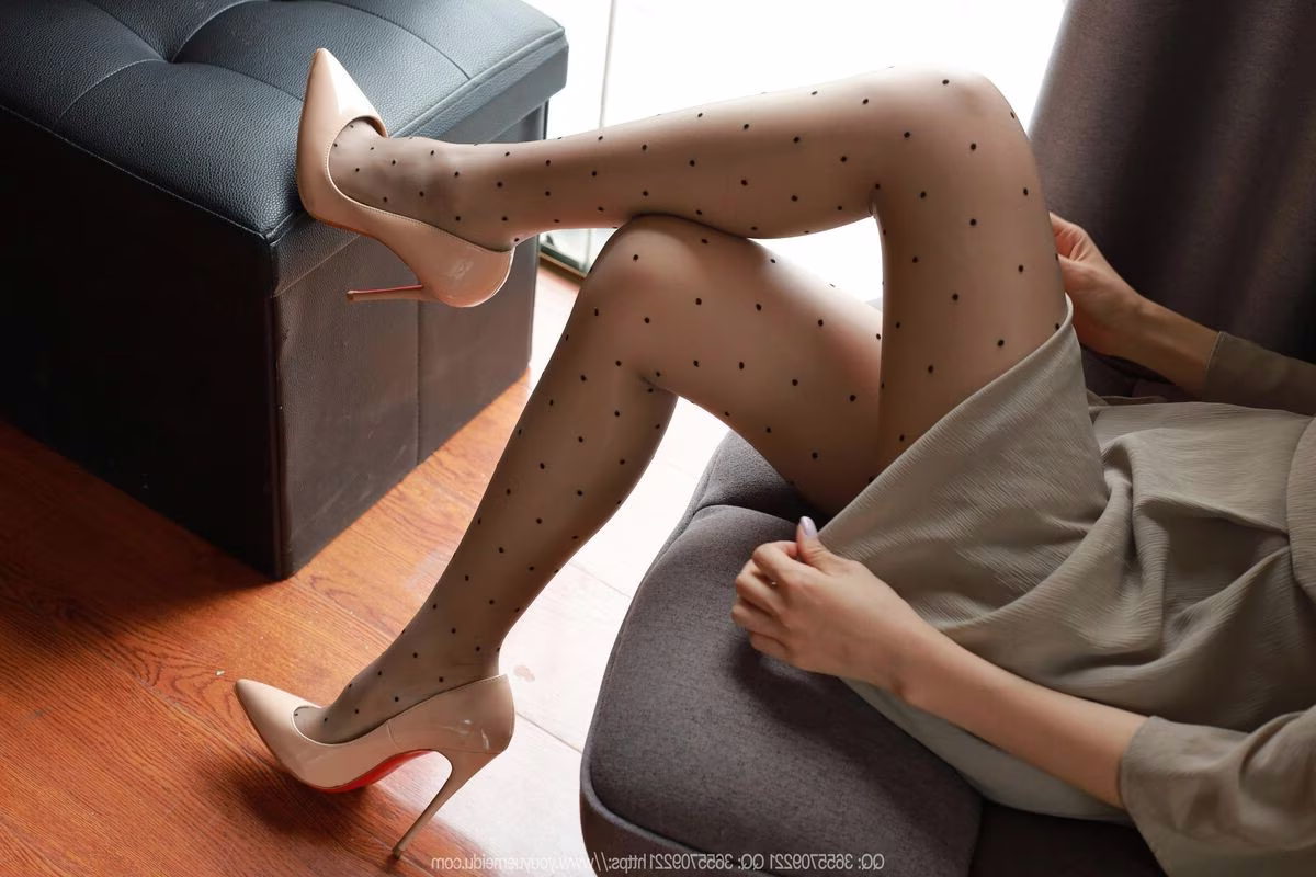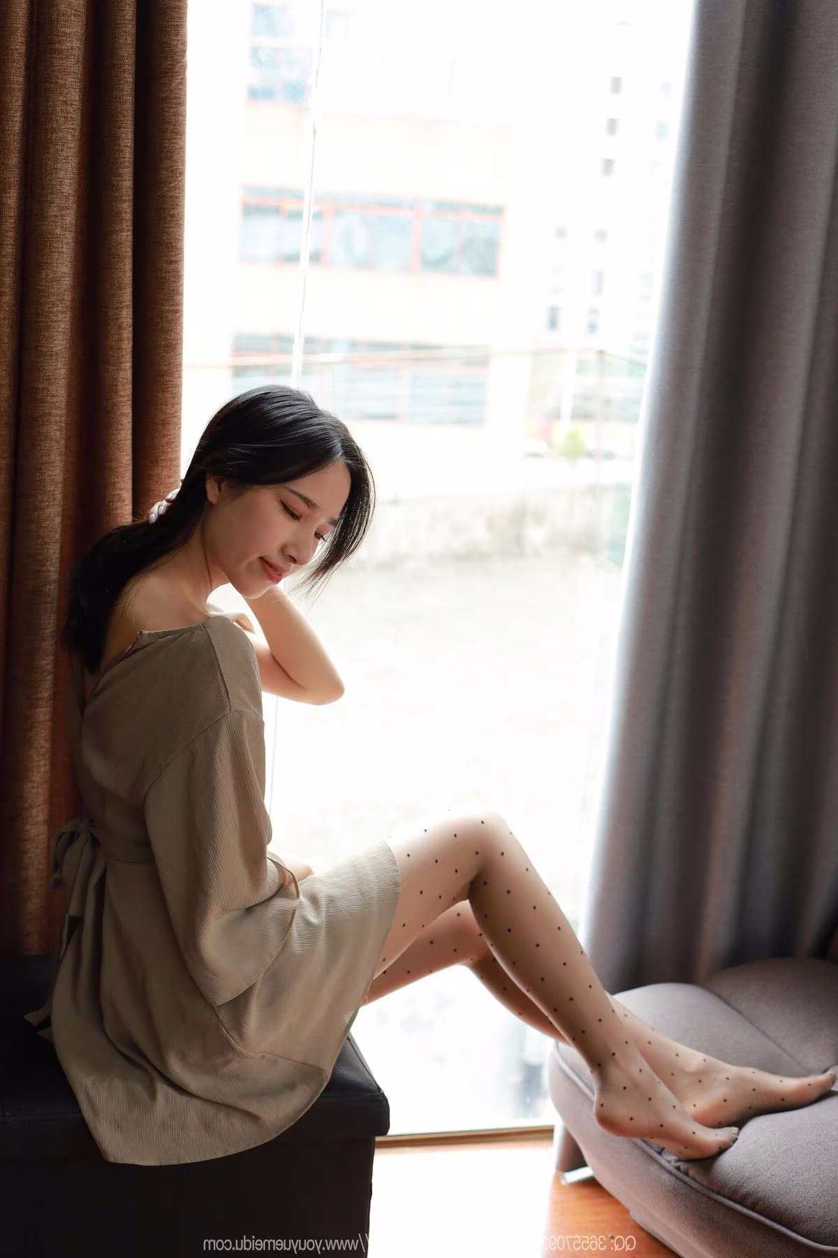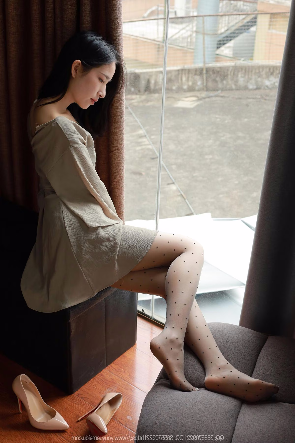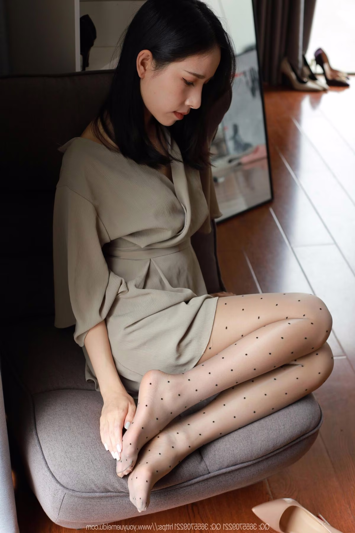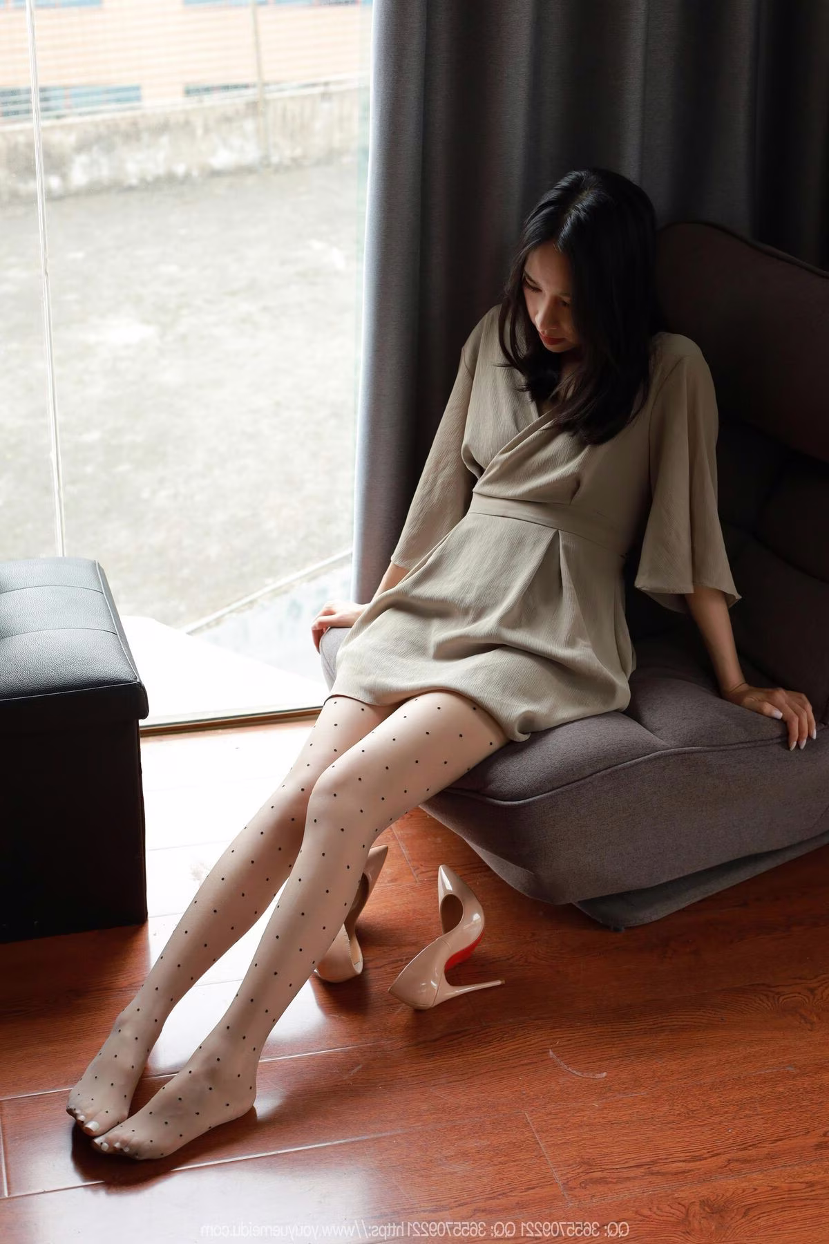 This captivating image captures a poignant moment of model Mei Zi from the IESS SXJ No.2061 collection. The Chinese model exudes an elegant and graceful charm, seated thoughtfully with a pensive gaze. Her light beige dress beautifully complements the unique polka dot stockings, highlighting her slender figure and sophisticated fashion sense. Every detail, from her smooth dark hair to her delicate feet, contributes to a perfect portrayal of understated allure. Viewers are easily drawn into Mei Zi's captivating aura and the subtle emotions conveyed through her expression and posture, offering an artistic and visually engaging experience.