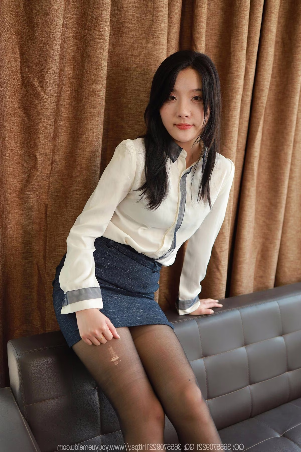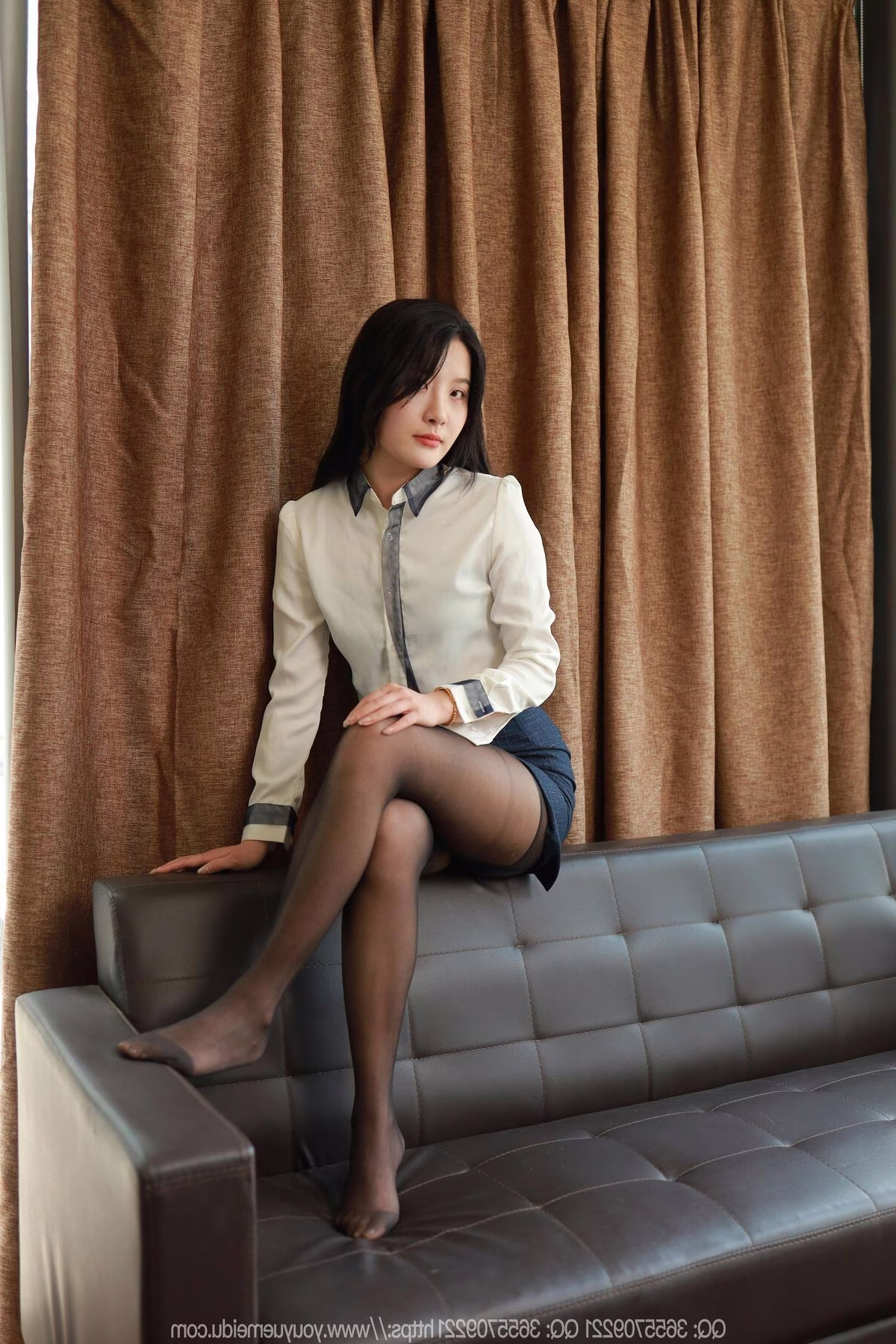 Wan Ping, a prominent model from the IESS SXJ No.2056 collection, exudes an irresistible elegance and charm. She sits gracefully on the sofa, her confident demeanor and direct gaze creating a strong connection. Her sophisticated office attire, featuring a crisp white shirt, dark skirt, paired with sheer black stockings and slender high heels, skillfully accentuates her slender figure and alluring contours. Every gesture, from the delicate placement of her hand to her poised posture, radiates professionalism and grace. The simple interior backdrop further highlights Wan Ping's beauty, offering an impressive glimpse into the style and aura of a modern Chinese model.Stories