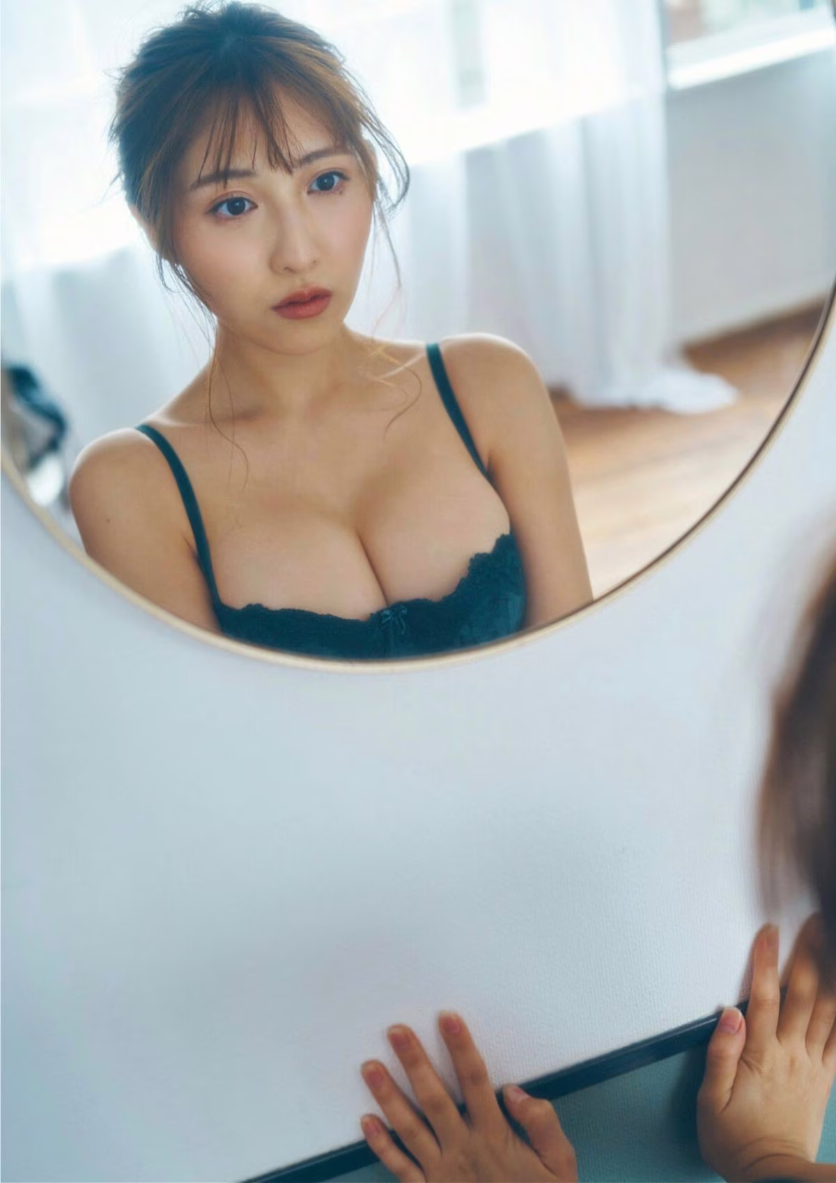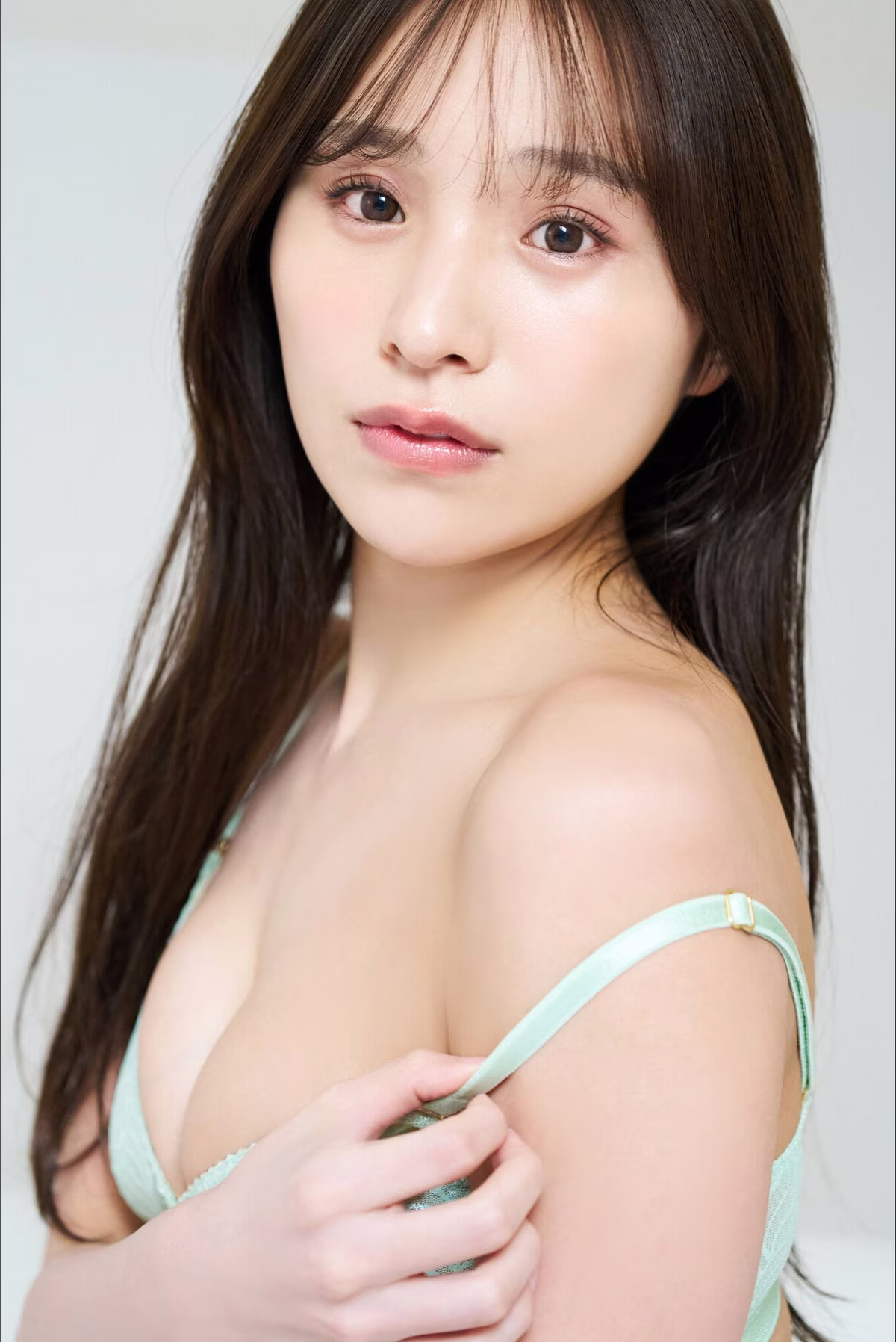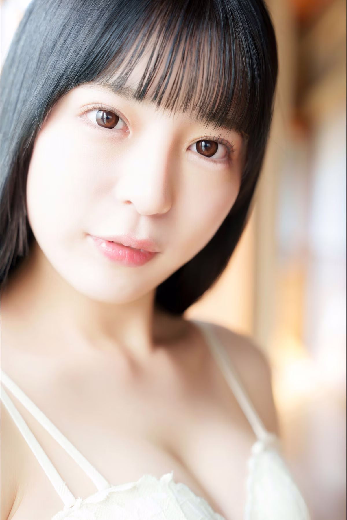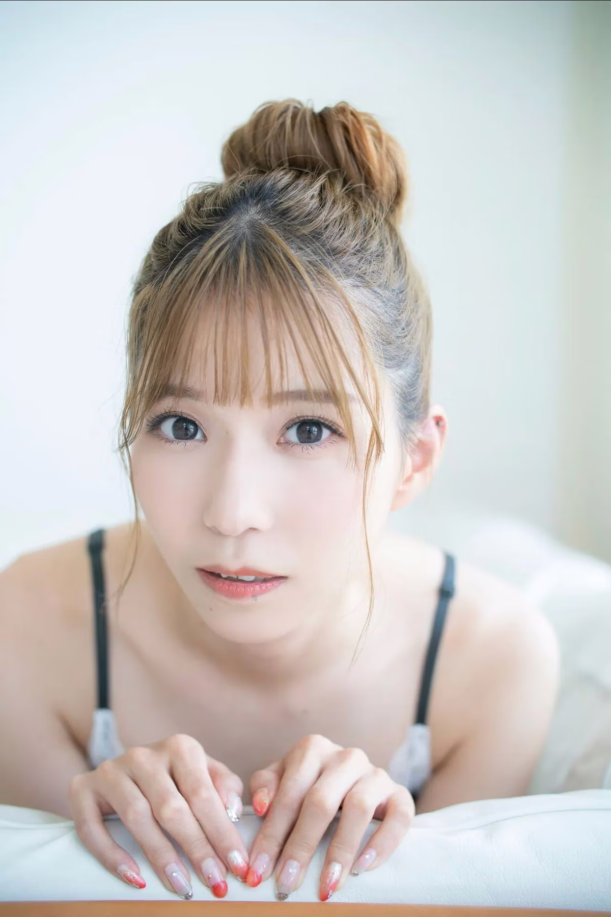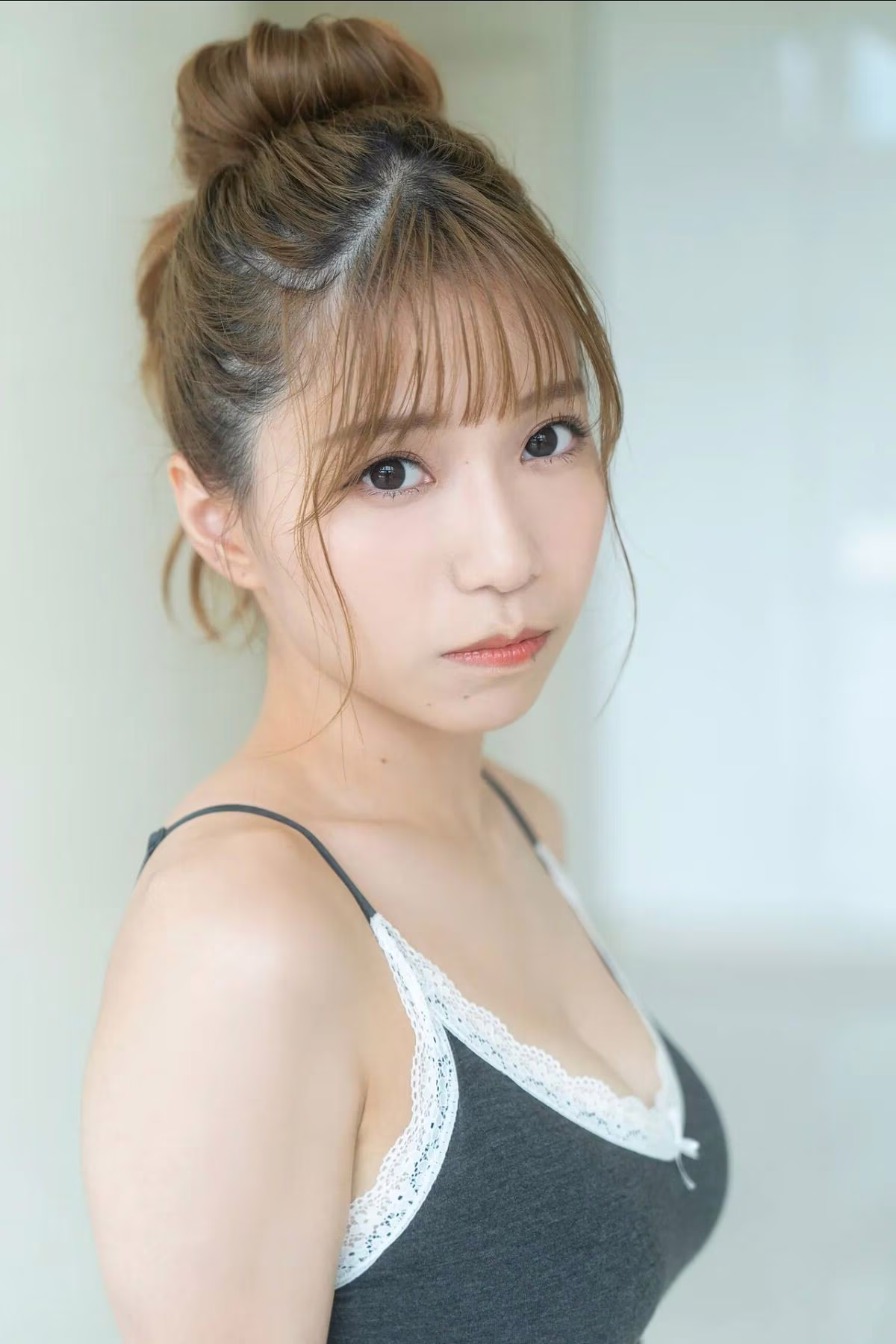 In this exclusive and previously unreleased FRIDAY Monthly Girl 043 Part 2 collection, JP Asaka showcases her captivating yet understated beauty. This particular shot highlights Asaka's profound gaze as she confidently wears a simple grey camisole adorned with delicate white lace. Her hair styled in a neat bun, complemented by soft bangs, beautifully frames her elegant face, exuding a sense of natural charm and approachability. The image not only celebrates her graceful figure but also conveys a depth of emotion, inviting viewers to explore new facets of the talented artist. This part of the exclusive series promises an inspiring visual journey.#Asaka #JP #Japanese #Idol #Natural #Beauty