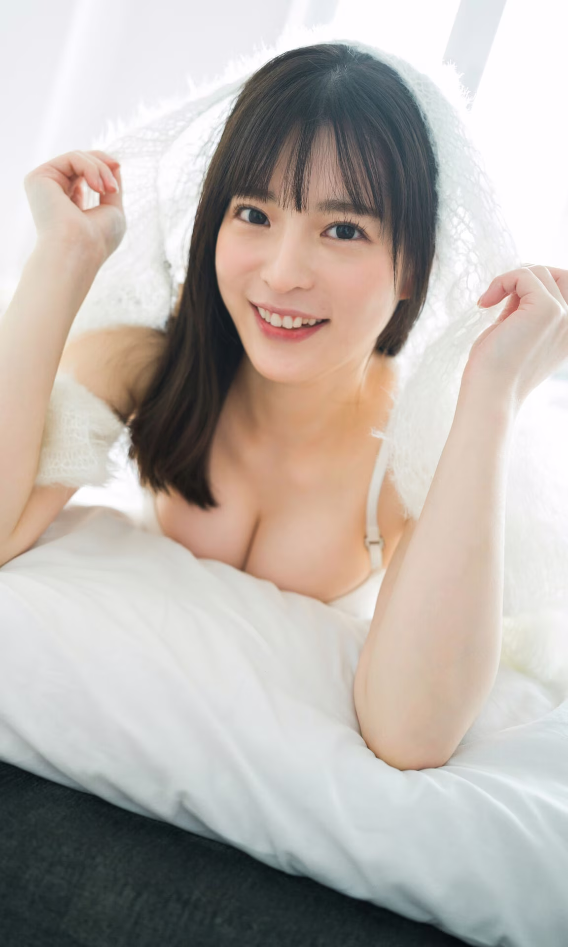 This exquisite image captures JP Miru in a tender and captivating pose. Her gentle smile and direct gaze create an intimate connection with the viewer. Bathed in soft, natural light, her smooth skin and expressive eyes highlight an irresistible allure. Miru is depicted in a relaxed setting, possibly a cozy bedroom, enveloped by a plush white blanket or pillow, suggesting warmth and comfort. This portrait, part of the 'Scenery Part01' collection, beautifully showcases Miru's natural elegance and charm, inviting admiration for her serene beauty. It evokes a feeling of peaceful intimacy and subtle sensuality, making it a truly memorable visual experience for fans and admirers alike.