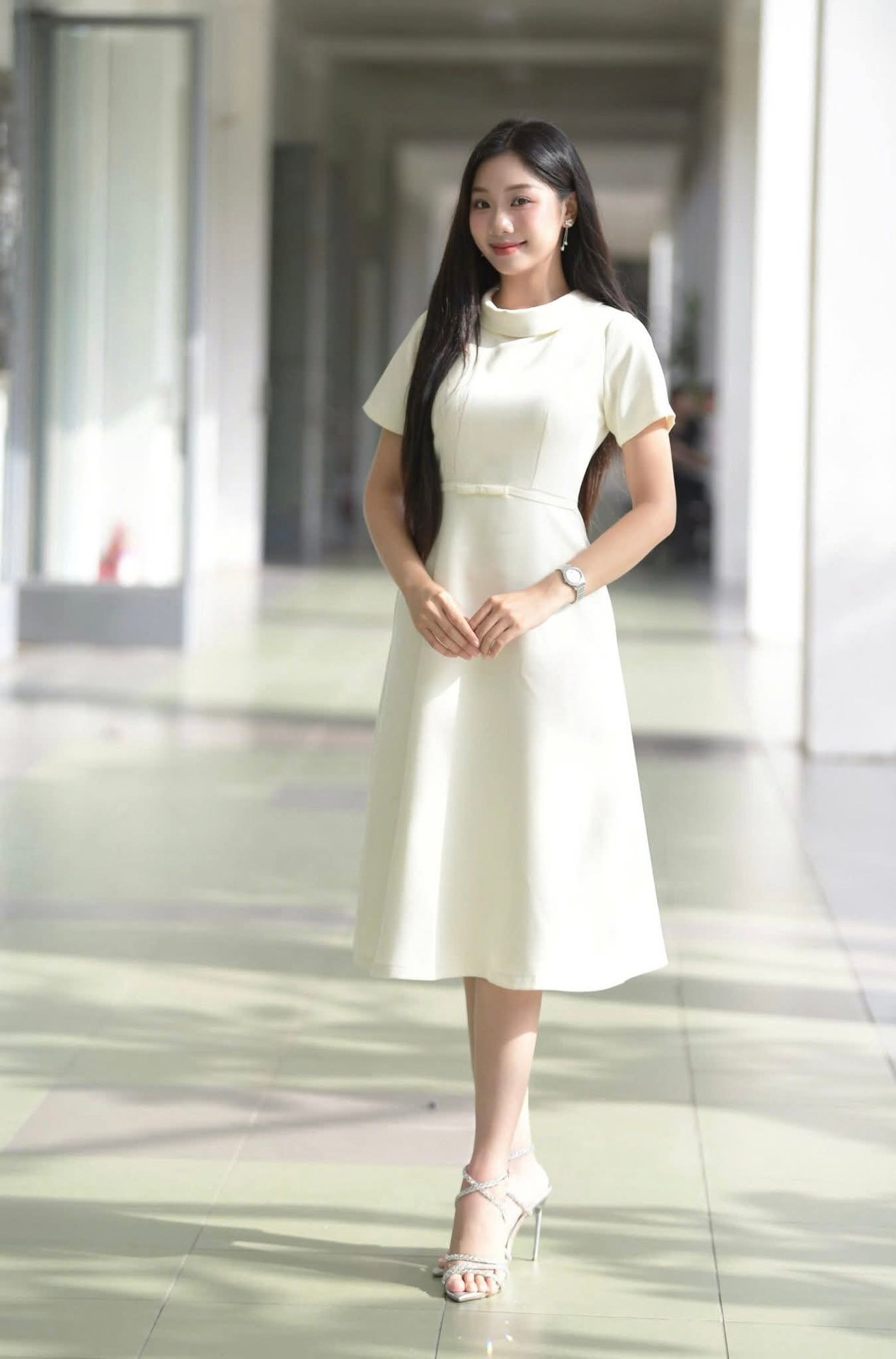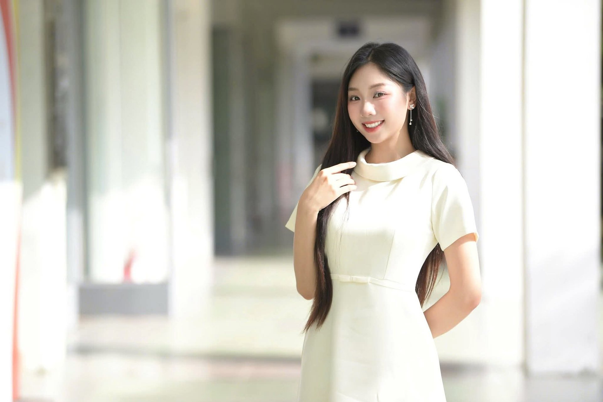 This captivating portrait features a beautiful Vietnamese woman exuding grace and charm. She is elegantly dressed in a cream-white midi dress, perfectly accentuating her slender figure. Her long, dark, flowing hair and gentle smile, combined with a radiant gaze, create a harmonious and alluring presence. Captured in a bright corridor, the image conveys a sense of serene beauty and refined style. This high-quality full-body portrait is ideal for those seeking stunning visuals. Perfect as an HD wallpaper, showcasing the natural allure of Vietnamese beauty. The photograph highlights her captivating charm and elegant demeanor, making it a wonderful representation of Asian beauty and graceful fashion. Image ID: 1000017598.jpg.Elegant Girl in Black Dress | Classic Style Portrait HD