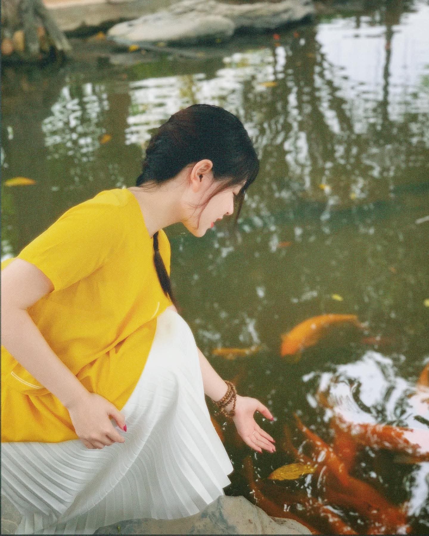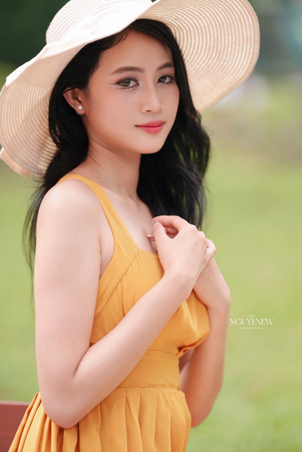 In image 1000019258.jpg, a youthful and beautiful girl appears gracefully adorned in a vibrant yellow dress and an elegant wide-brimmed hat. Her gentle gaze, subtly dreamy, creates a natural and captivating beauty. Her long, lustrous dark hair further enhances her East Asian charm. The delicate pose, touching the brim of her hat, not only conveys confidence but also evokes a sense of relaxation, blending harmoniously with the fresh green outdoor setting. This is an ideal image for summer fashion style, exuding freshness and sophistication. The photograph is more than just a beautiful moment; it is a source of inspiration for those who appreciate simple, refined, and vibrant beauty.