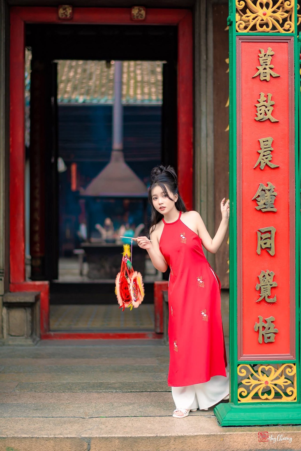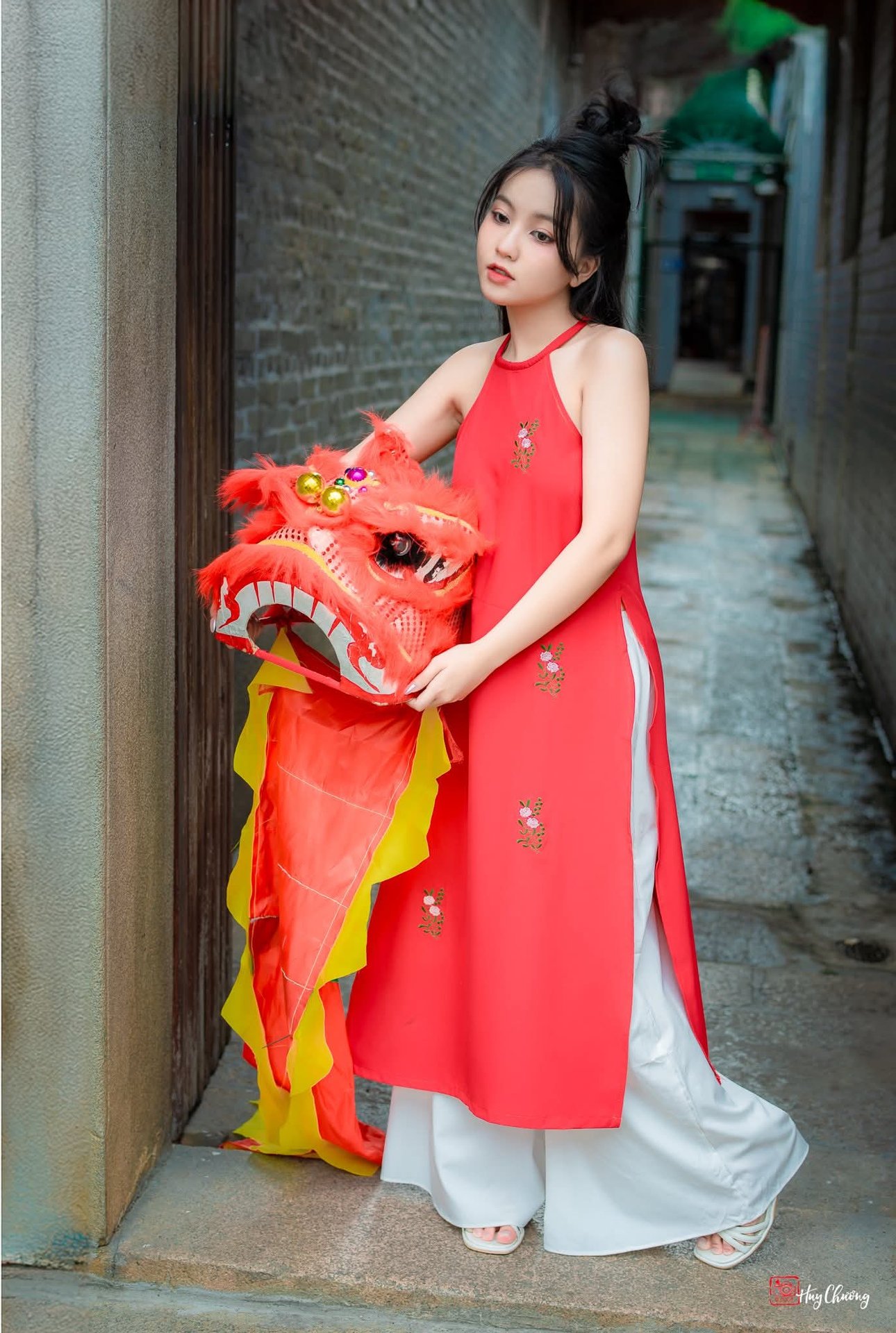This image 1000018036.jpg captures a charming Vietnamese girl gracefully posing in a modern red ao dai, paired with elegant white wide-leg trousers. She beams a radiant smile and makes a friendly heart gesture. A distinctive highlight is the miniature lion dance head she holds, a familiar symbol of traditional festivals and Vietnamese folk culture. The ao dai, while showcasing traditional beauty, also embraces a contemporary flair. This picture beautifully combines human charm with rich cultural values, inviting tourists to explore unique travel experiences in Vietnam. It truly embodies the pride in Vietnam's vibrant cultural heritage.