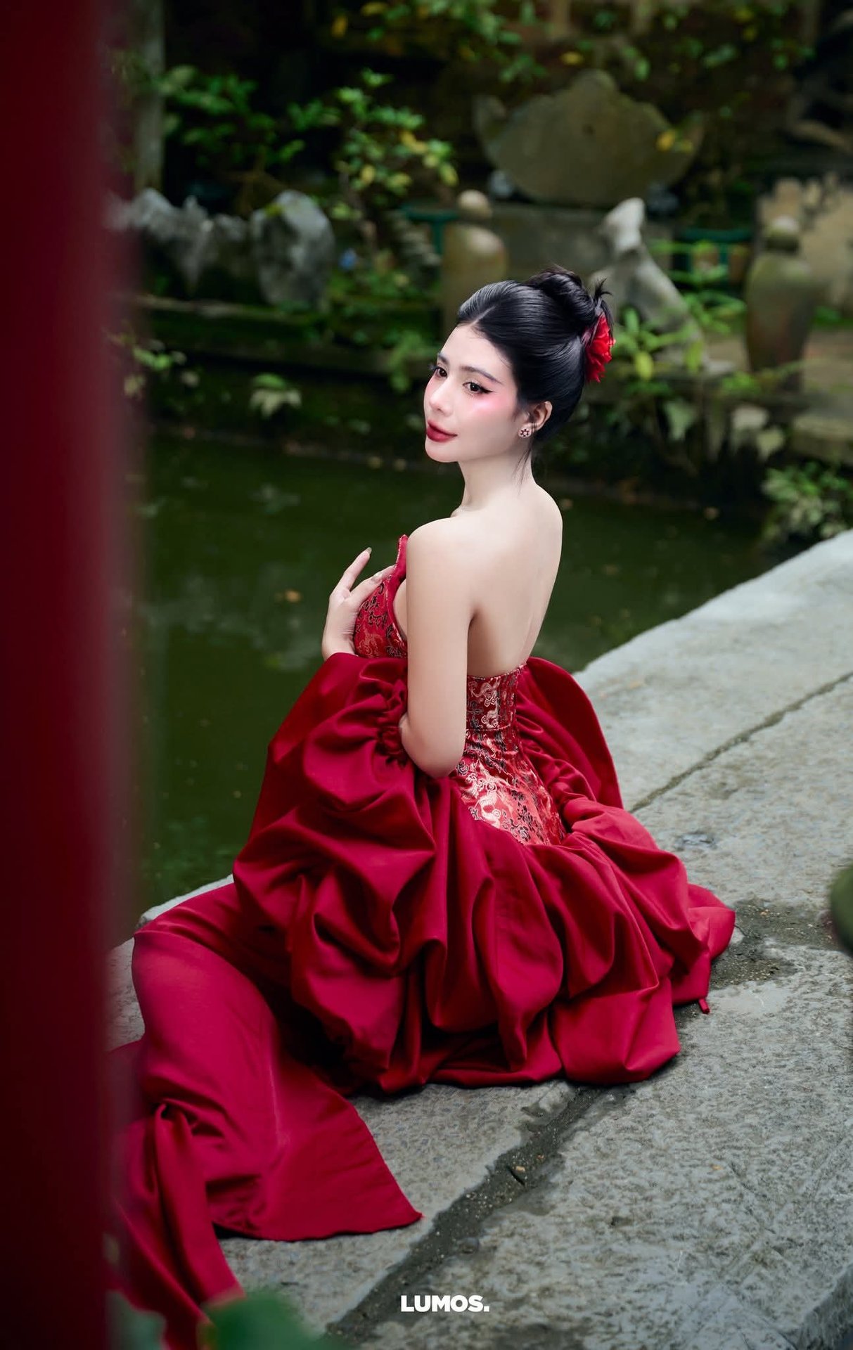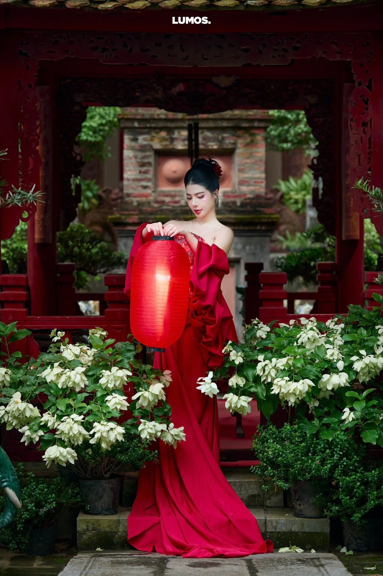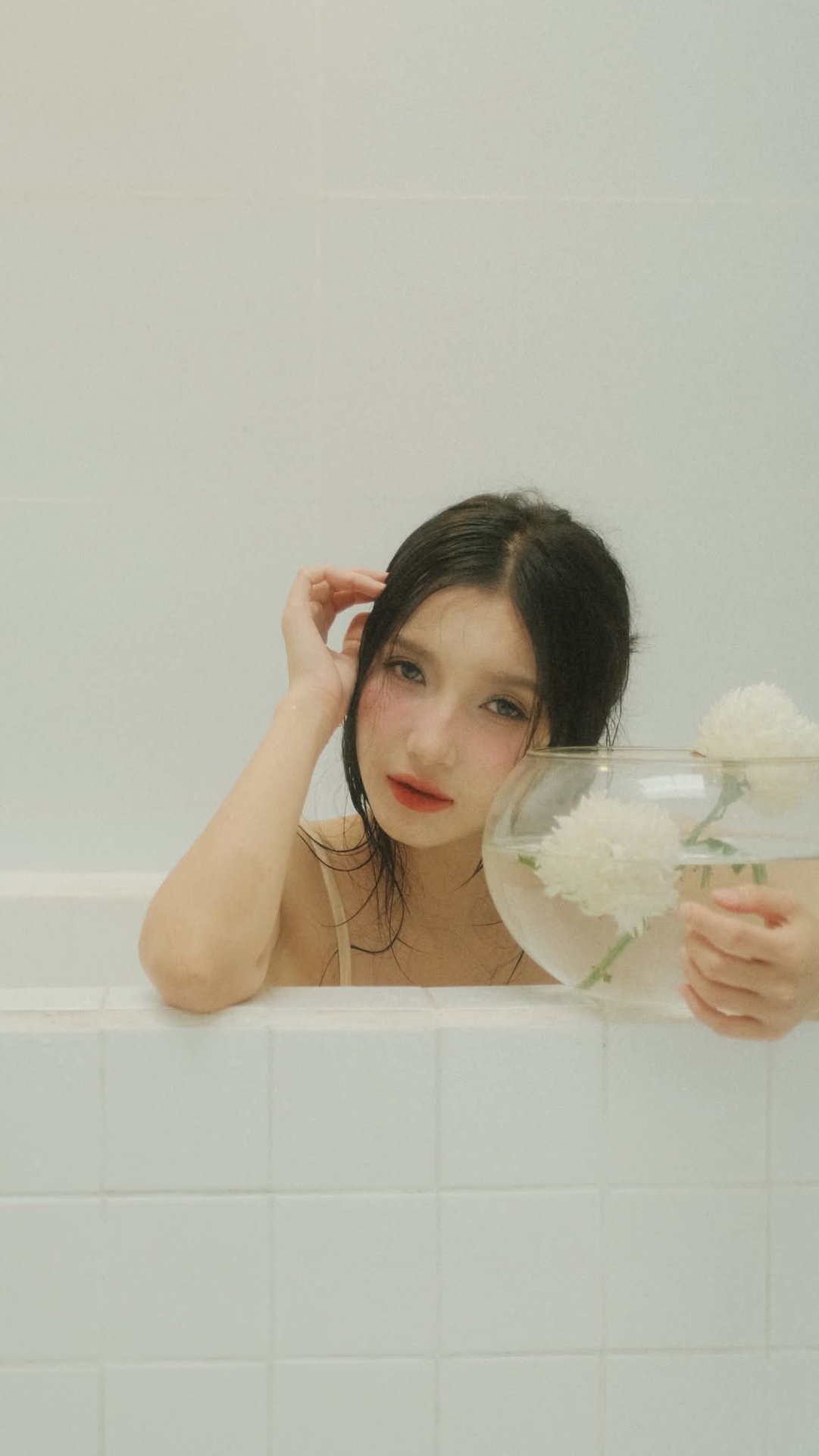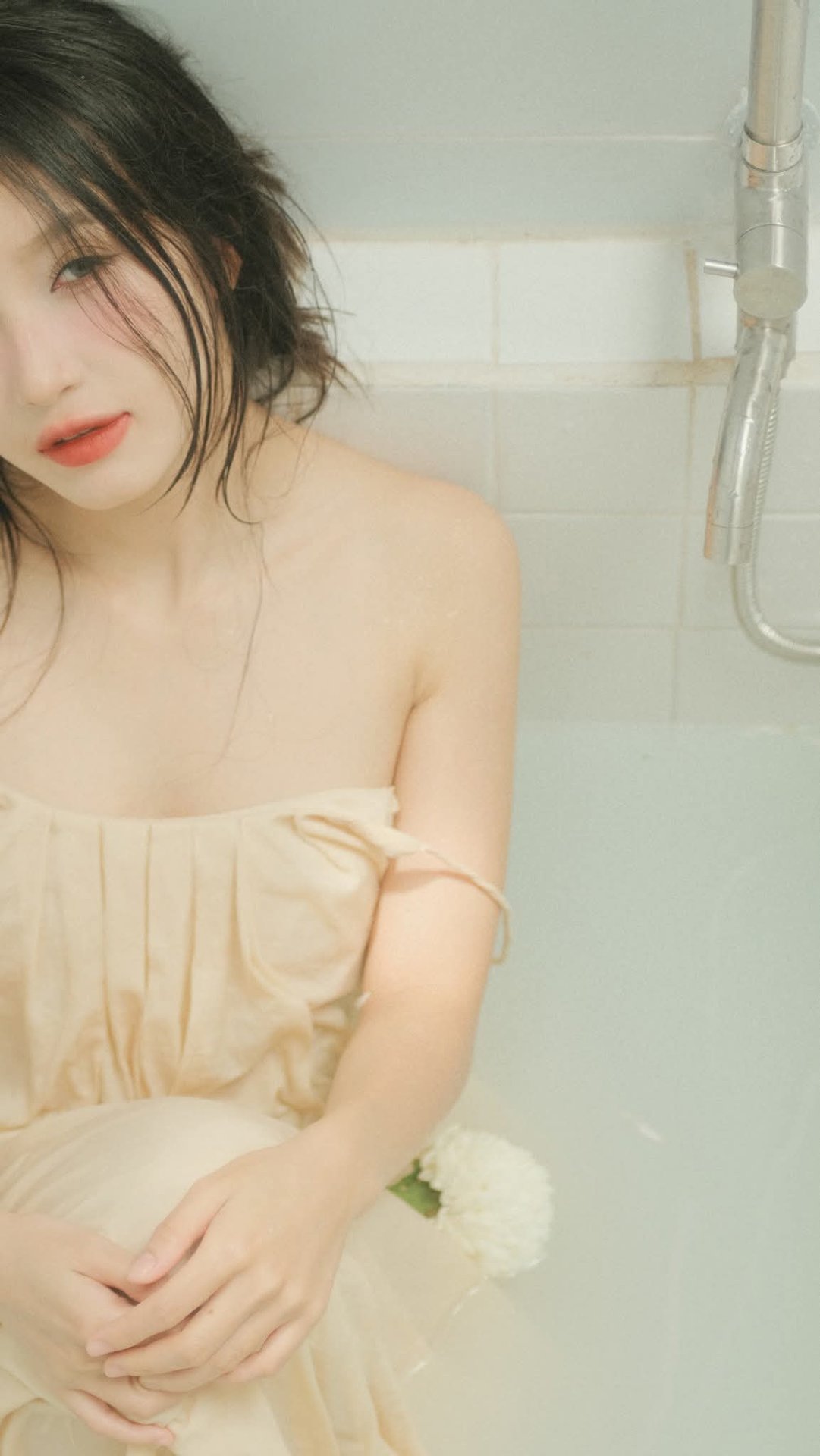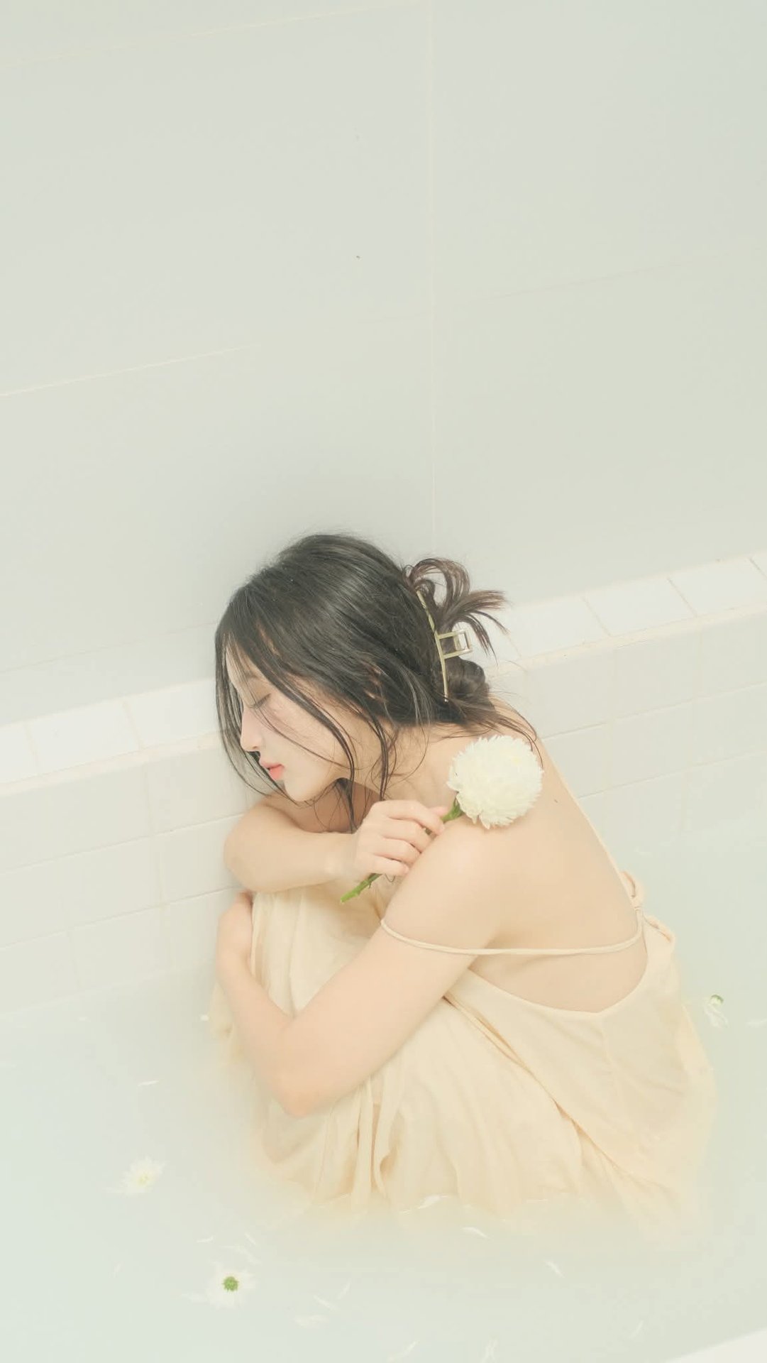 This captivating image portrays a young woman immersed in a bathtub, exuding a serene and dreamy beauty. Her hair is loosely tied, and she wears a delicate flowing pastel dress, enhancing her ethereal charm. Gently holding a pristine white flower, she embodies purity and grace. Soft lighting bathes the scene, creating an atmosphere of ultimate relaxation where time seems to stand still. More than just a photograph, it's an artistic expression conveying profound emotions of inner peace and refined femininity. The image evokes a sense of lightness, elegance, and subtle mystery, inviting viewers to appreciate the harmony between human and nature in a tranquil moment.Traditional Vietnamese Beauty: Elegant Woman with Red Lantern, Capturing Asian Charm. 1000018929.jpg
