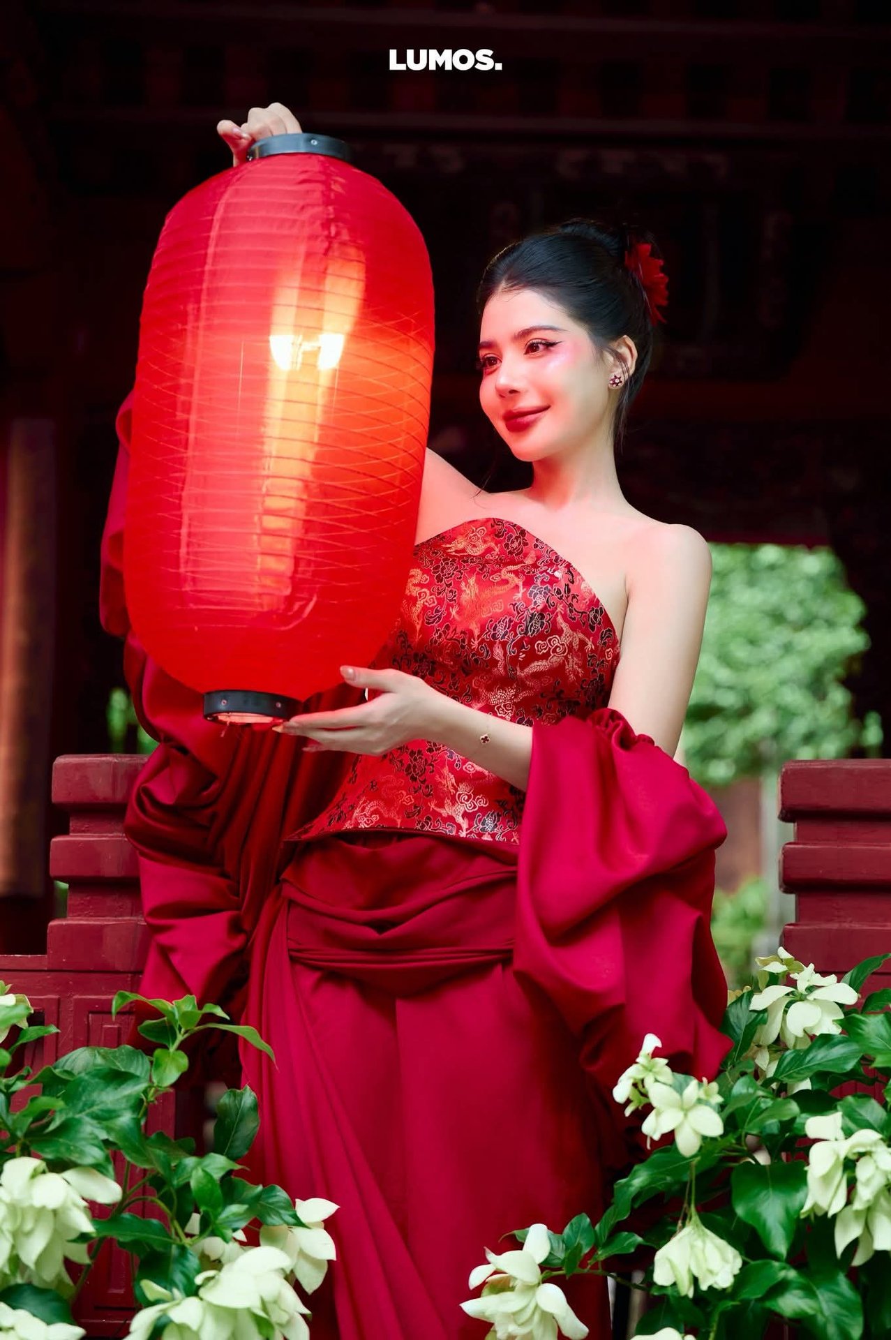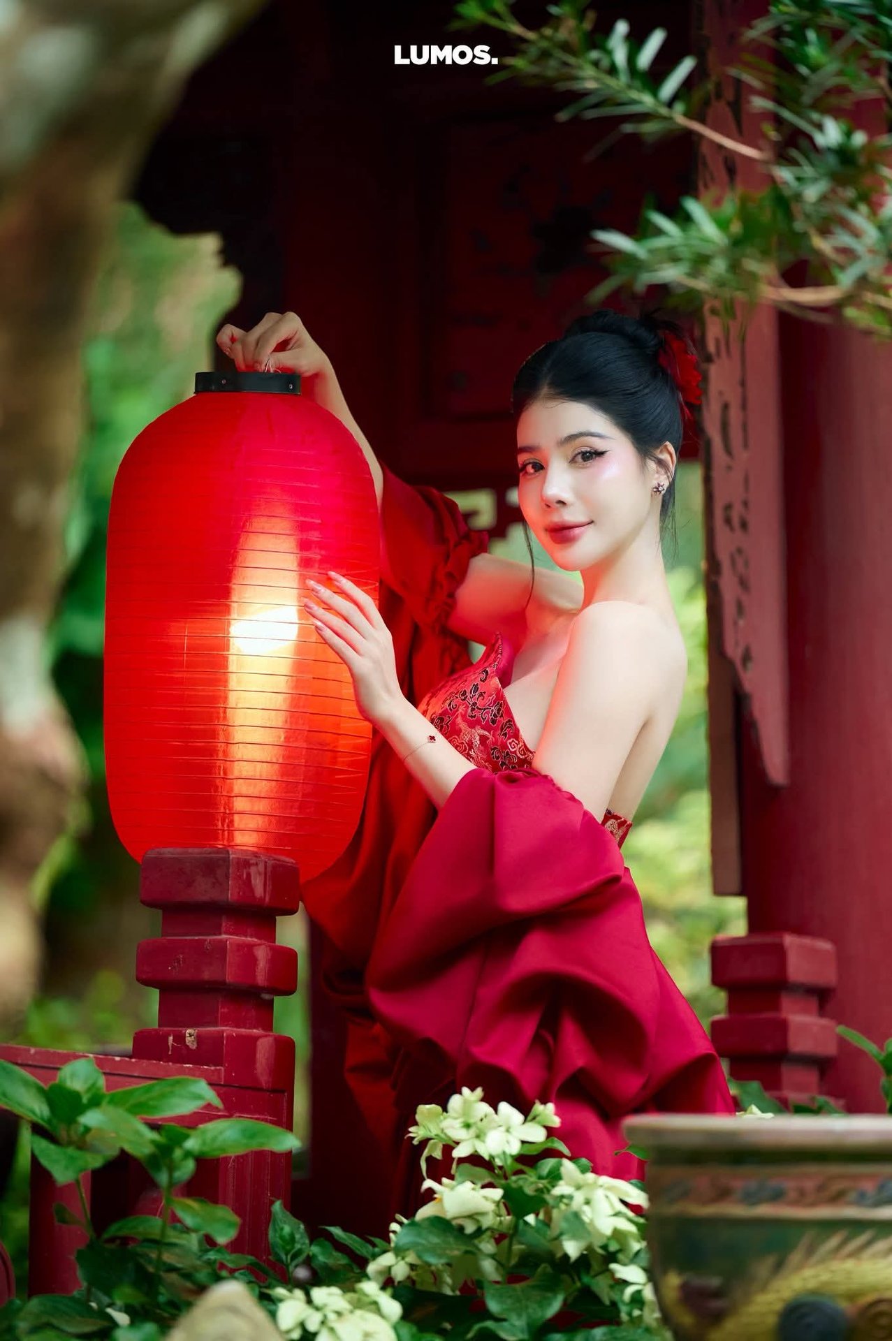 This image `1000017867.jpg` beautifully captures the elegant charm of a Vietnamese woman in modernized traditional attire. The young lady exudes grace and gentleness as she holds a vibrant carp-shaped lantern, a familiar symbol of Vietnamese culture, especially during festivals like the Mid-Autumn Festival. This portrayal not only celebrates the beauty of its people but also highlights profound traditional values, embodying the rich cultural identity of Vietnam. The red lanterns in the background further enhance the festive atmosphere, creating a vibrant and meaningful scene. It's a perfect blend of contemporary beauty and deep-rooted tradition.
