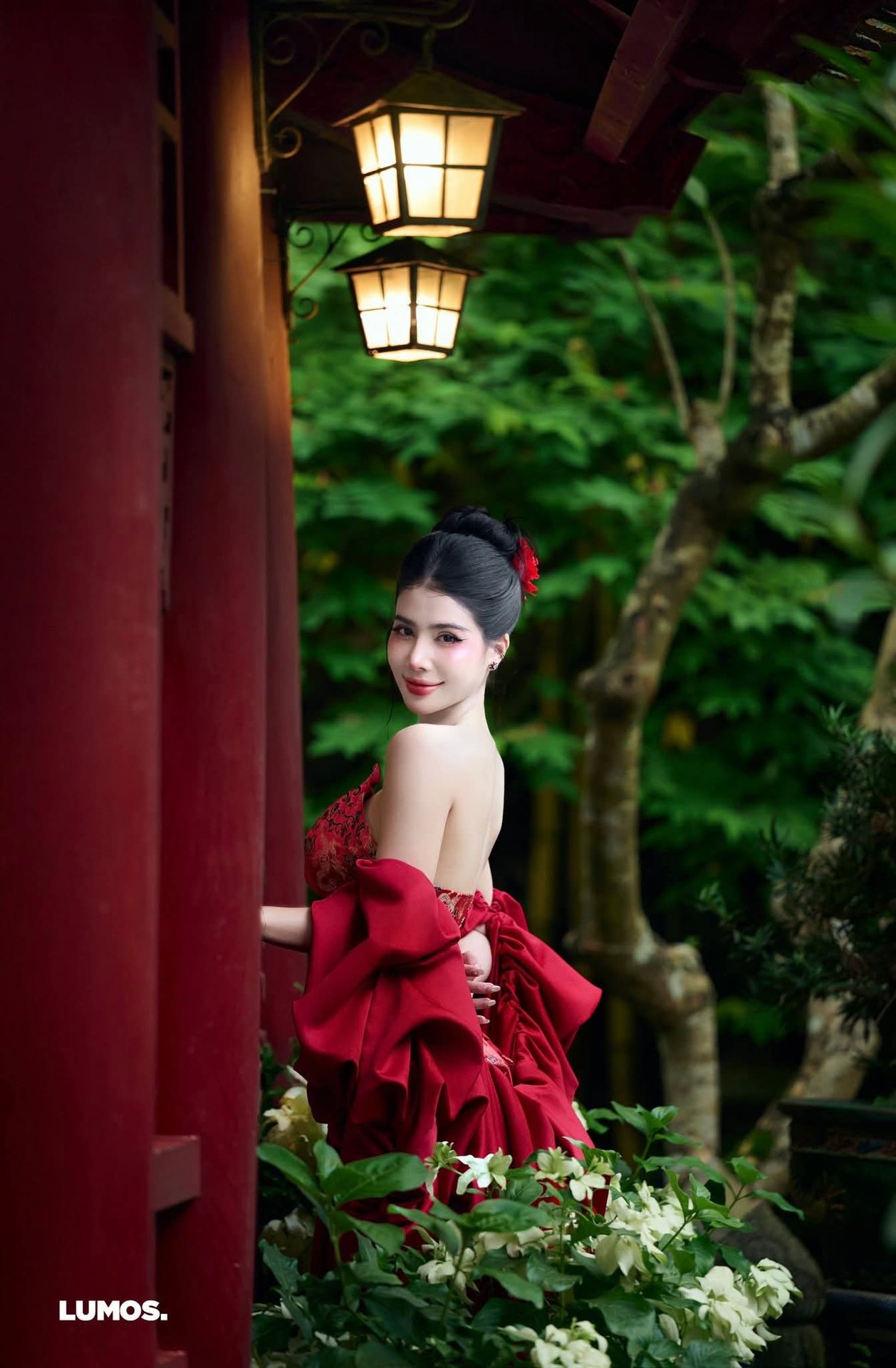 This captivating image portrays the serene beauty of a young woman adorned in traditional East Asian attire, exuding grace and allure. She stands delicately beside a vibrant red lantern, a powerful symbol of good fortune and warmth, creating an enchanting and poetic scene. Her gentle and elegant charm perfectly blends with the traditional architectural backdrop, evoking a sense of deep cultural values. While the outfit reflects a broader East Asian influence, the image beautifully conveys the enduring appreciation for classical beauty, a sentiment deeply cherished and admired by the Vietnamese people. This moment is not merely a portrait but a narrative of the interplay between past and present, offering a feeling of tranquility and nostalgia.Serene Moments with Hydrangeas: A Young Woman's Nature Portrait