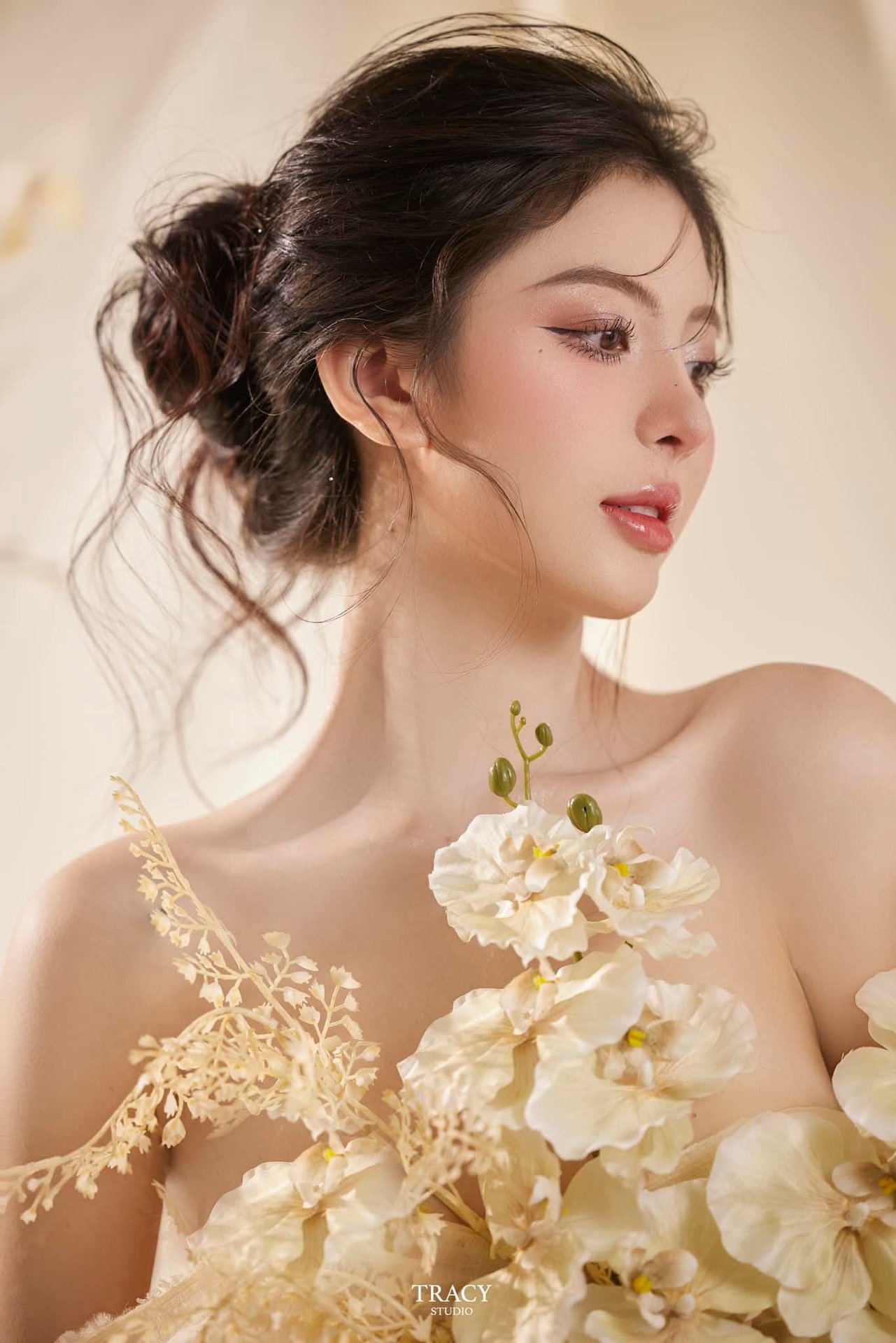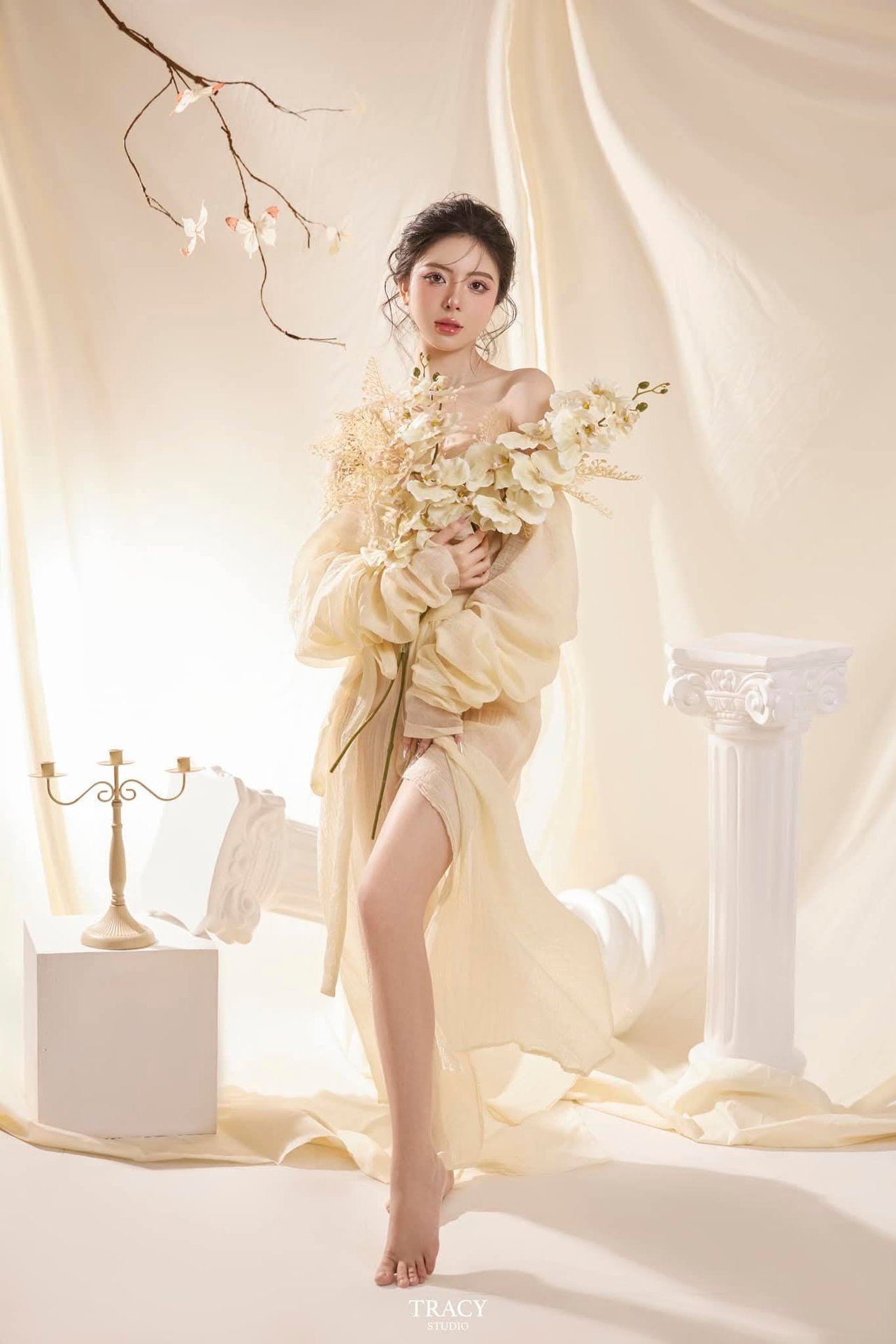 In this captivating image JP Shida Nene 志田音々 radiates with a brilliant smile as she strikes an adorable pose in a bathtub. The Japanese idol showcases her fresh and vibrant beauty. Dressed in a delicate bikini and a sheer mesh top Shida Nene presents a sweet and natural moment. Her hands skillfully form a heart conveying affection to the viewer. This picture is an exclusive part of the digital photo collection Manazashi no Saki ni from Weekly Playboy PHOTO BOOK. The photograph not only highlights Shida Nene's charming cuteness but also captures her clear gaze and confident demeanor. It is a compelling highlight within the collection that fans will not want to miss.Vietnamese Ao Dai Beauty: Graceful Girl with Flowers.