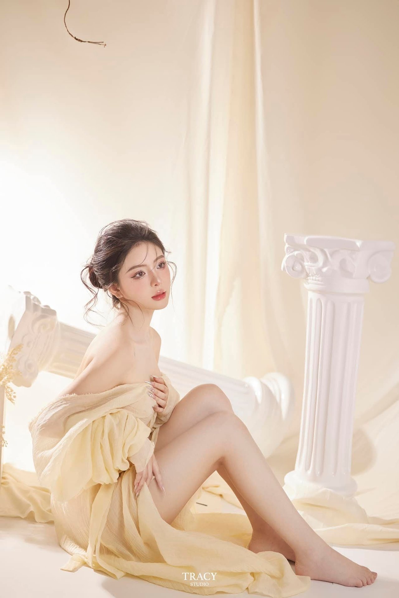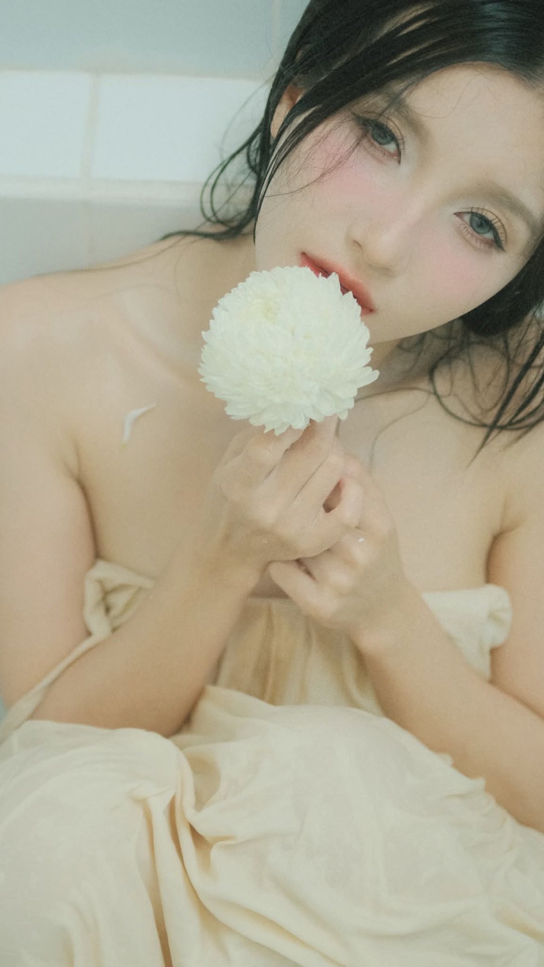 This captivating image 1000018513.jpg portrays a young woman exuding ethereal beauty reminiscent of muses from classical Greek mythology. Draped gracefully in soft flowing cream-colored fabric she strikes an elegant pose beside classical columns blending ancient charm with contemporary artistry. The gentle lighting accentuates her flawless complexion and delicate facial features with expressive eyes that draw the viewer in. More than just a portrait this is a profound piece of art photography where alluring beauty and timeless elegance converge transporting observers into a mystical realm of mythological tales. The photograph perfectly marries classical aesthetics with a modern artistic sensibility creating an immortal moment of grace and sophisticated allure.Ethereal Girl in Bathtub with White Flower: Serene Beauty & Relaxing Moment 1000018799.jpg