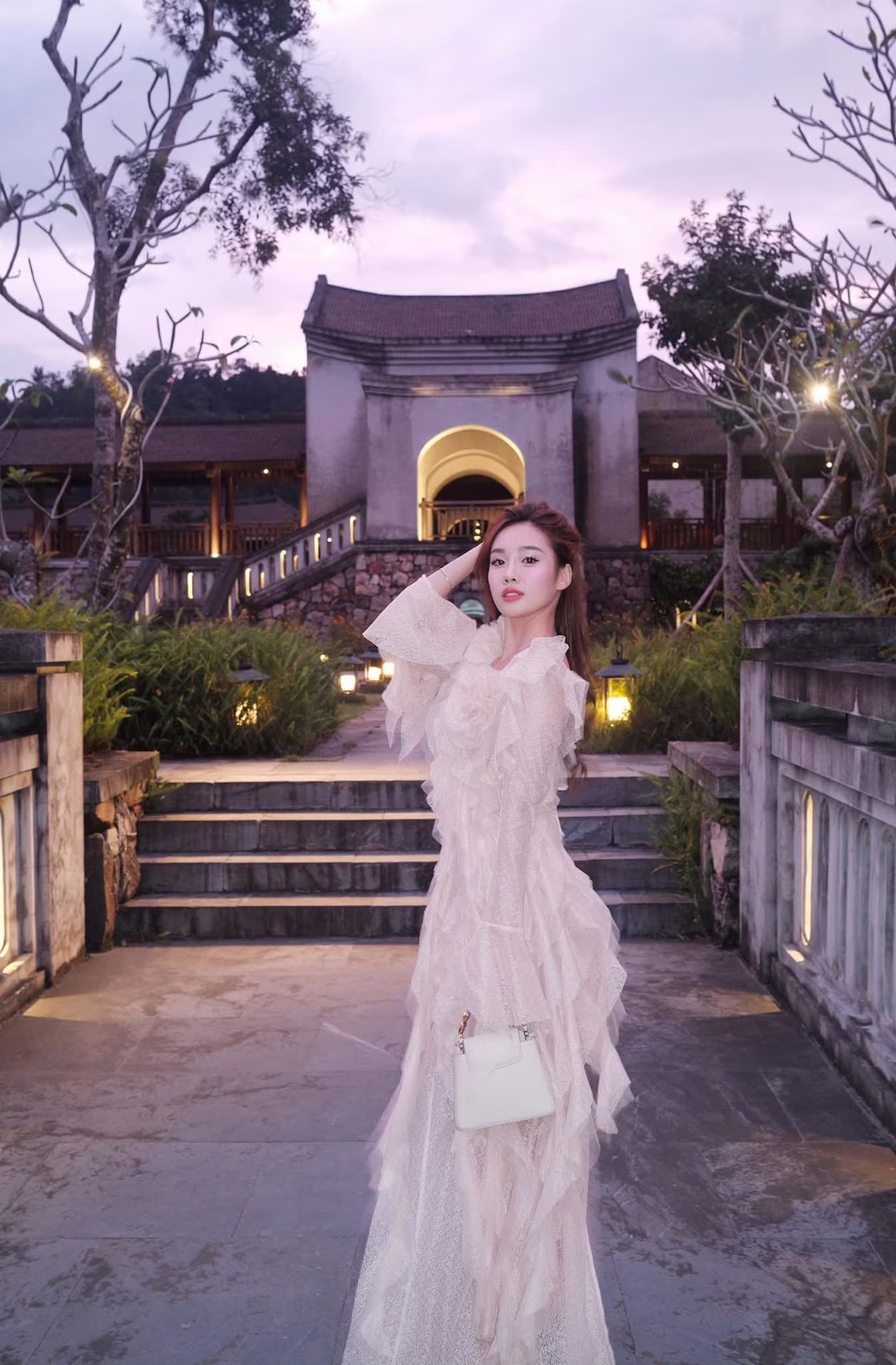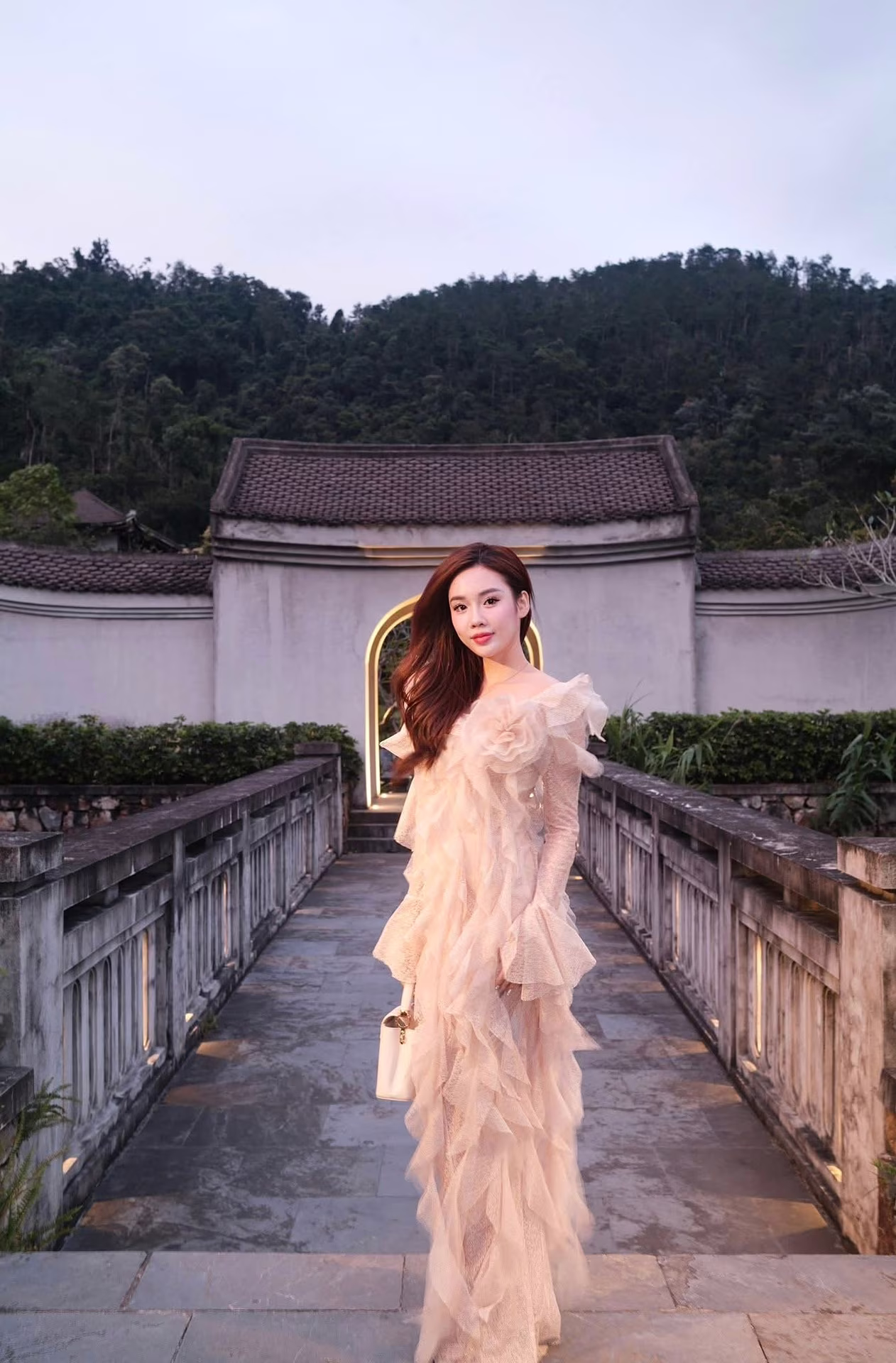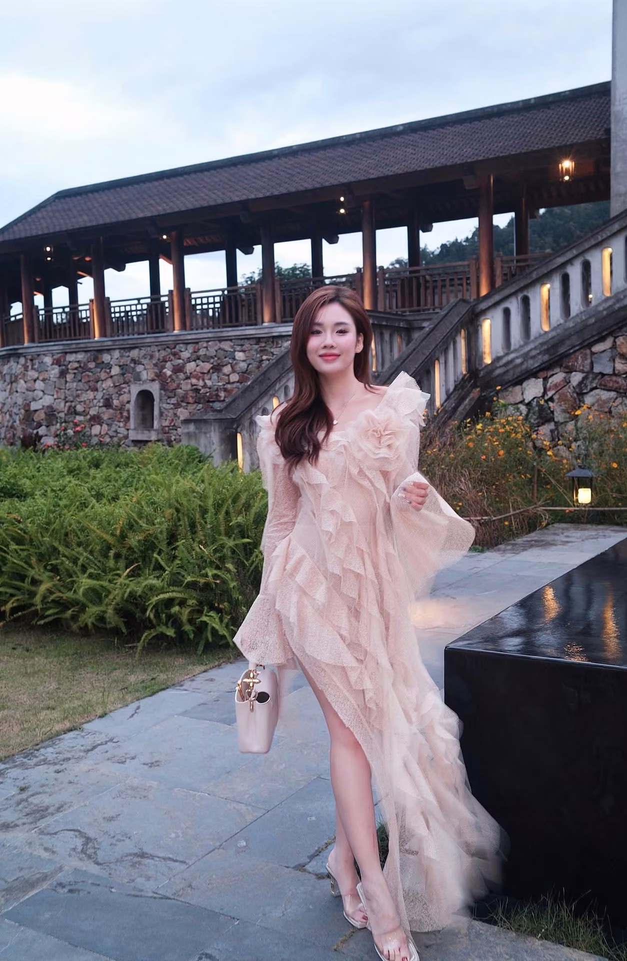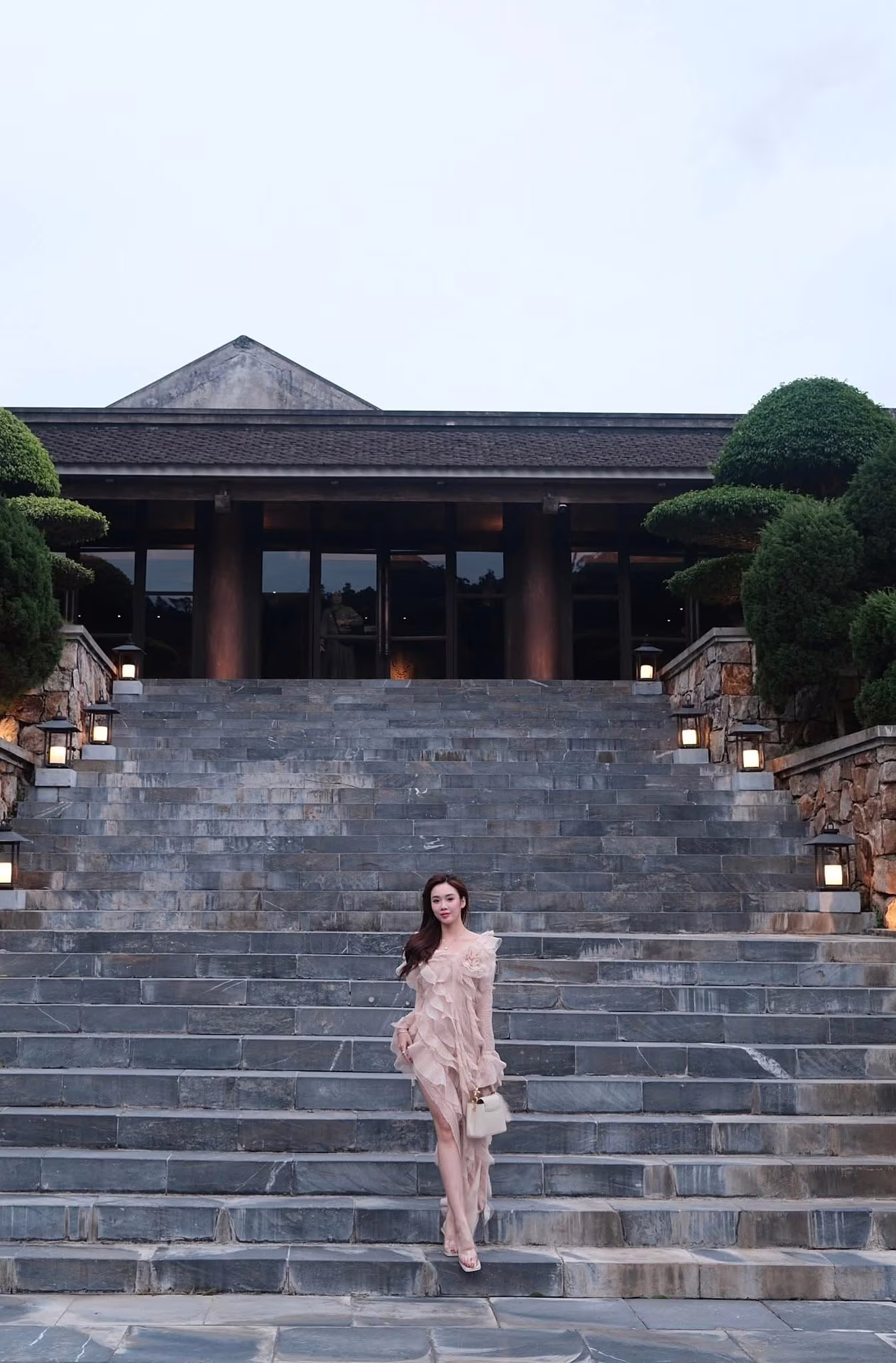 VGU No.51: captures a mesmerizing moment of an elegant muse gracefully posing on a balcony. She is adorned in a unique beige evening gown, its soft, layered fabric creating a sense of lightness and grandeur. The woman's sophisticated beauty blends seamlessly with the majestic natural landscape behind her. Lush green mountains and rich vegetation form a poetic backdrop, accentuating her luxurious and refined demeanor. This is not merely a fashion photograph but a subtle interplay between human elegance and scenic beauty, evoking a feeling of tranquility and ethereal charm. #Vietnamese #pretty #charm