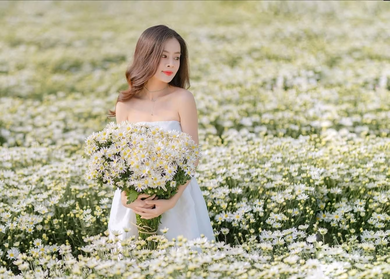 This VGU No.22 image captures a breathtaking moment of a graceful girl amidst a pristine field of white daisies. The gentle muse, adorned in a pure white dress, seamlessly merges with the flower-filled landscape. Her closed eyes and soft smile radiate an aura of peace and innocence. More than just a beautiful photograph, it evokes a profound emotion of harmony between humanity and nature. Each tiny daisy seems to cherish the girl's beauty, creating a dreamy, romantic tableau. The picture recalls beautiful youthful moments where the soul finds relaxation and tranquility. The natural charm and elegance of the girl illuminate the entire flower field, offering a light, airy sensation. #Vietnamese #pretty #charm