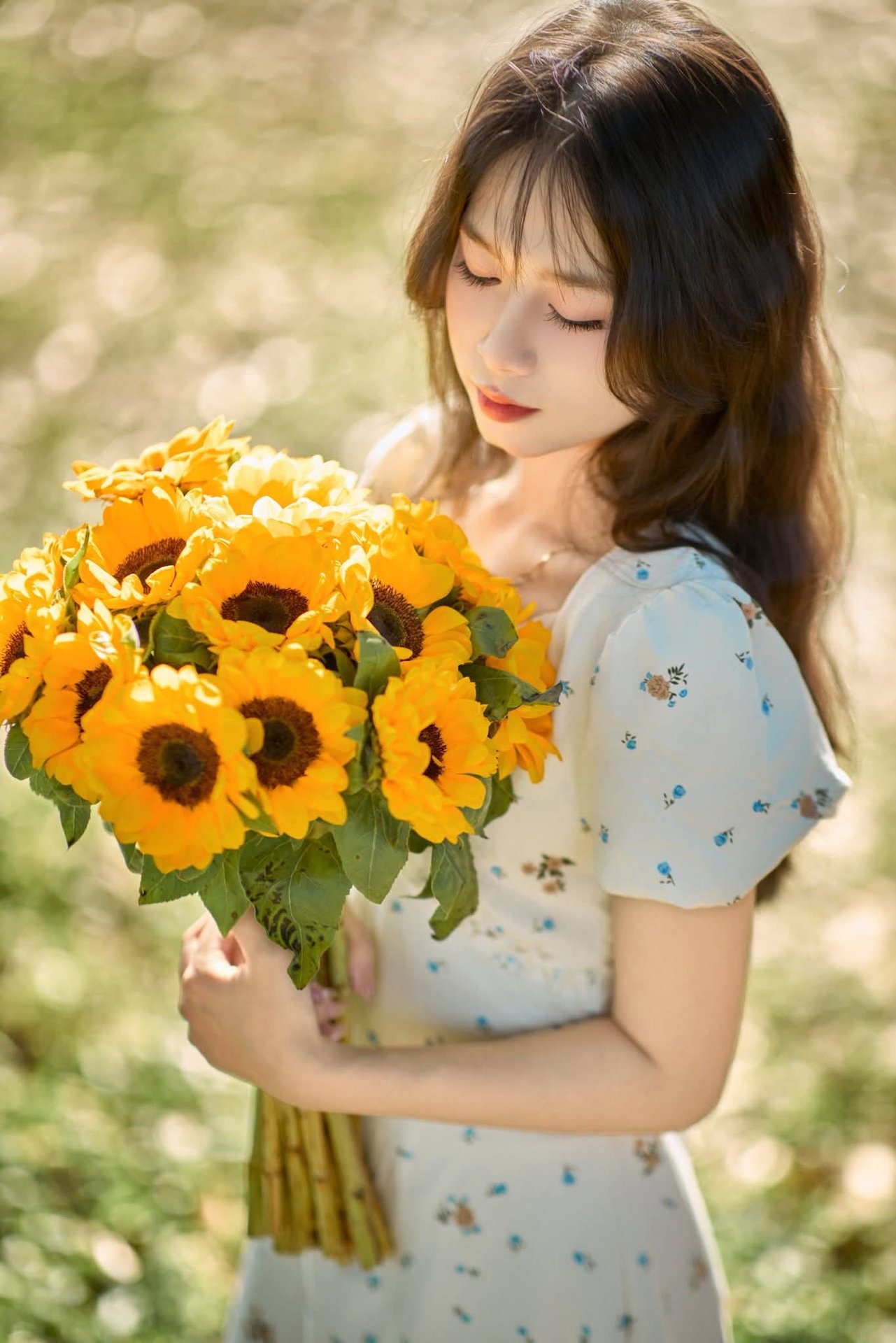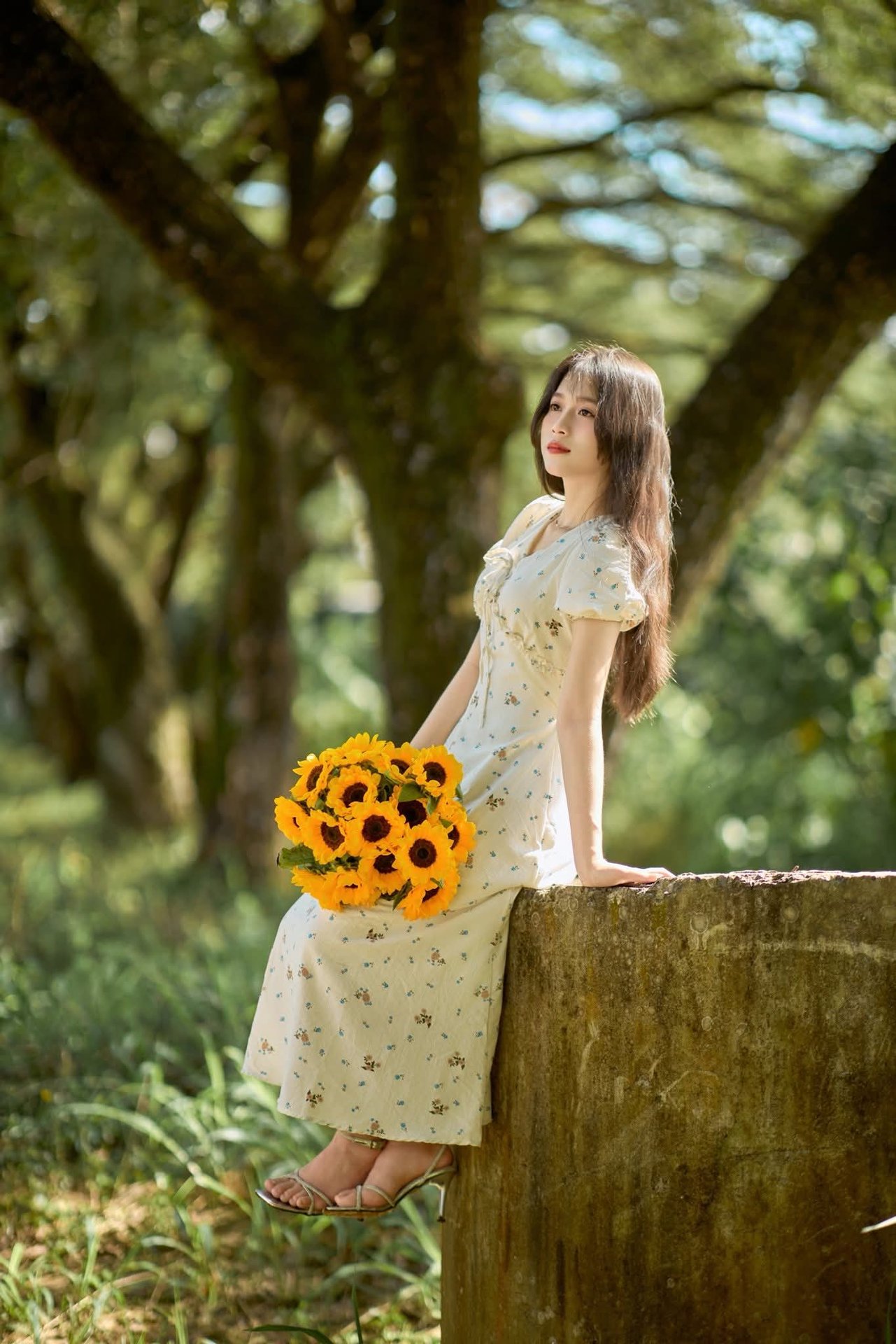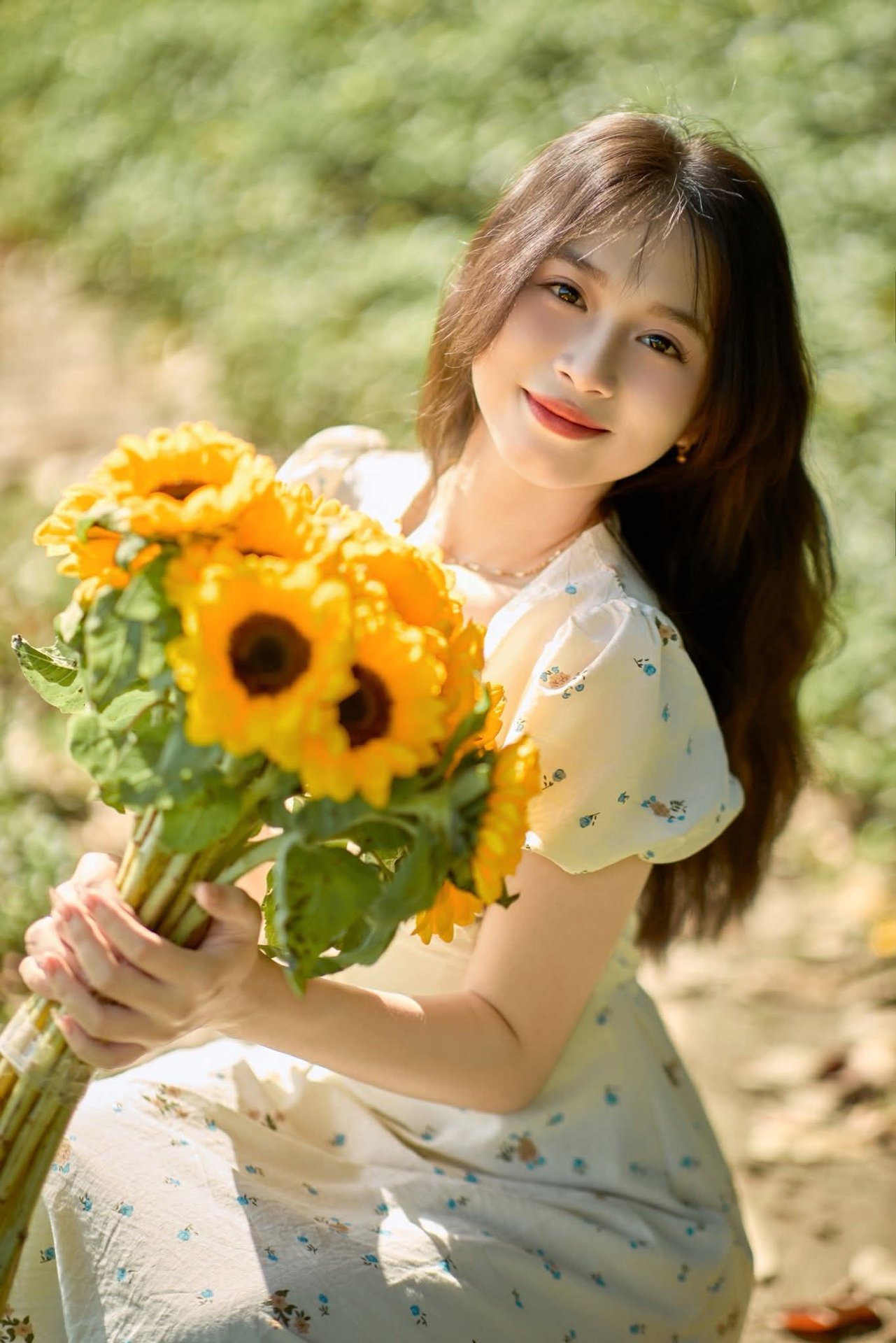 This image unveils a serene landscape inviting visitors to discover the unique beauty of Da Lat during its wild sunflower season. A gently winding path leads into a space filled with the radiant golden hues of wild sunflowers creating an enchanting Da Lat flower route. This is the ideal time for Da Lat travel immersing oneself in nature and enjoying the fresh air of the mountain town. With thoughtfully arranged photo spots like the white sofa and welcome sign for wild sunflower season photography visitors can easily capture their most beautiful moments. Exploring the mountain town during flower season is not just sightseeing but also an emotional experience finding peace. A wild sunflower tour will take you to wonderful locations like this where every frame is a work of art.XVG No.20: Discover the elegant beauty of a graceful Vietnamese girl