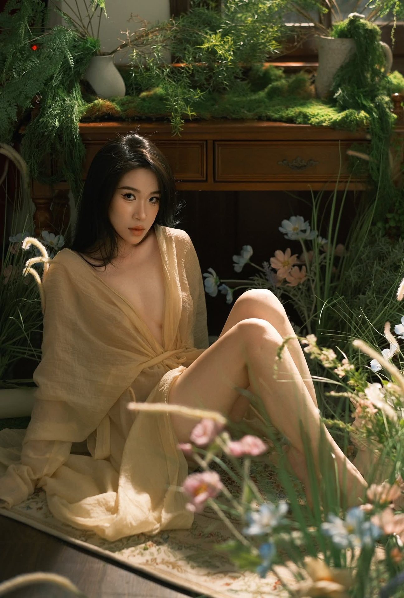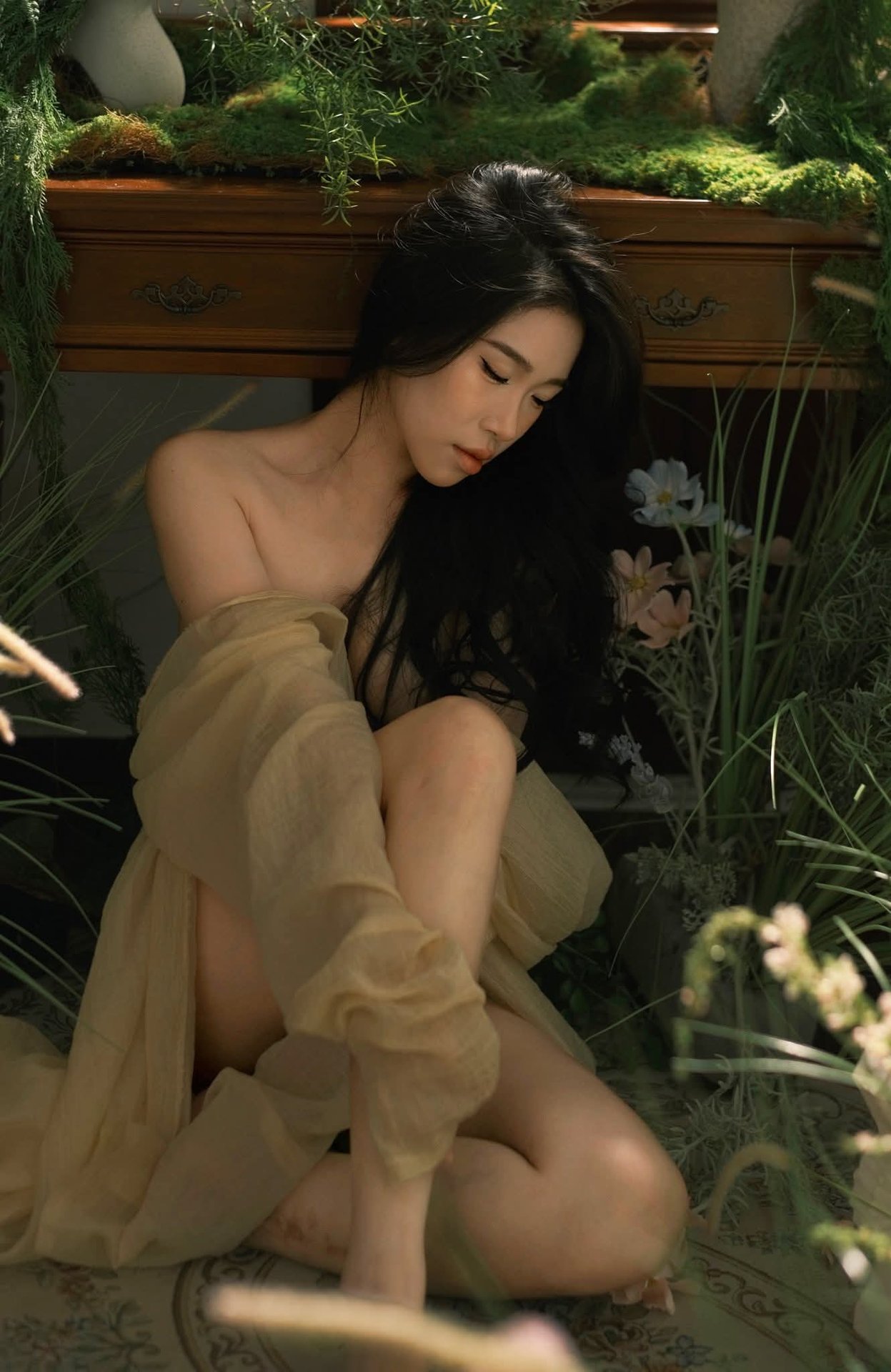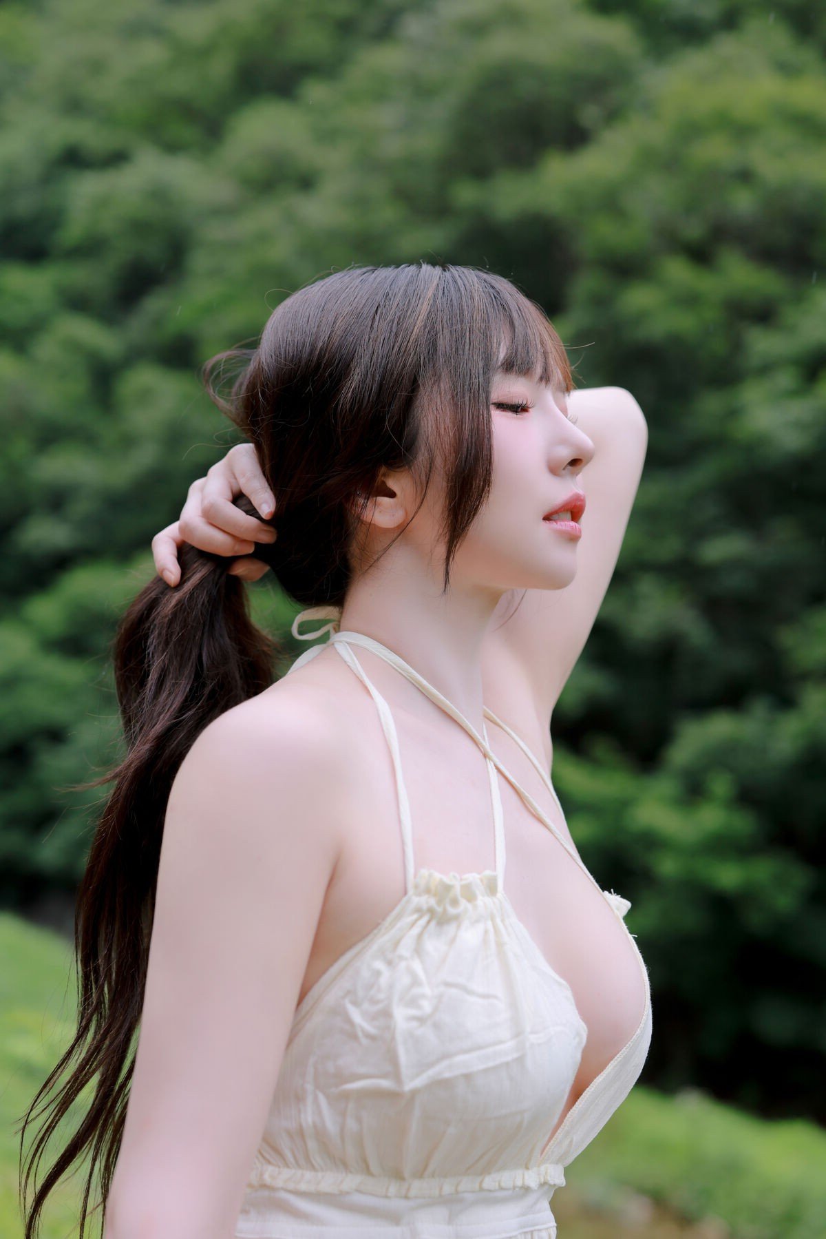 This captivating image showcases the ethereal beauty of model Soso amidst a lush forest stream setting. Her long flowing hair and gentle gaze complement the serene backdrop of vibrant greenery. Dressed in a light, delicate outfit, Soso gracefully crouches, her hand delicately touching the cool water, creating a moment of tranquil connection with nature. She embodies a pure and graceful charm, exuding a sense of peace and natural allure. This picture is a highlight from the exclusive SWEETBOX SOSO Once Part01 collection, celebrating Soso's enchanting presence in pristine natural landscapes.