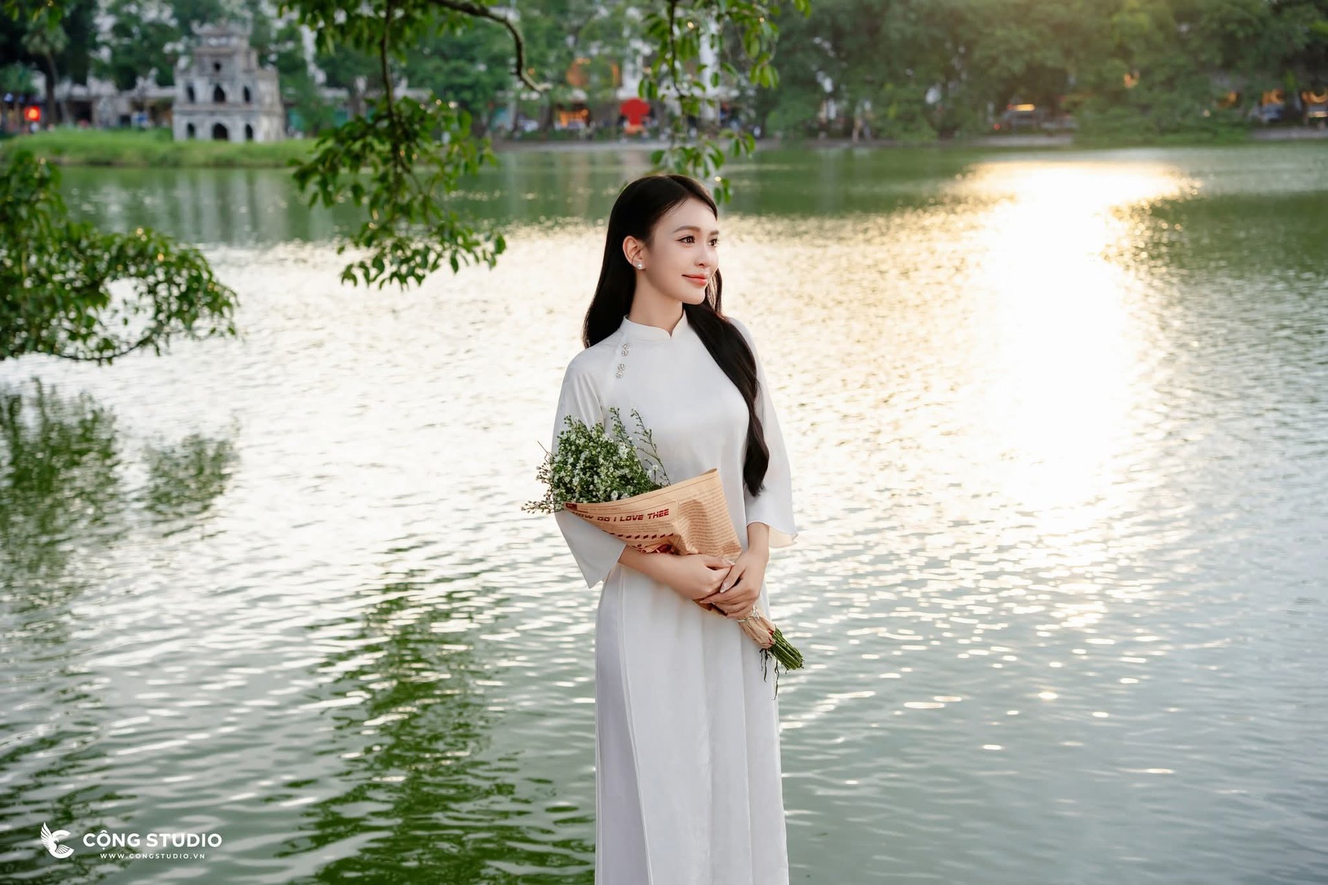 Gentle Vietnamese Woman in White Ao Dai by Hoan Kiem Lake | Serene Beauty of Vietnam