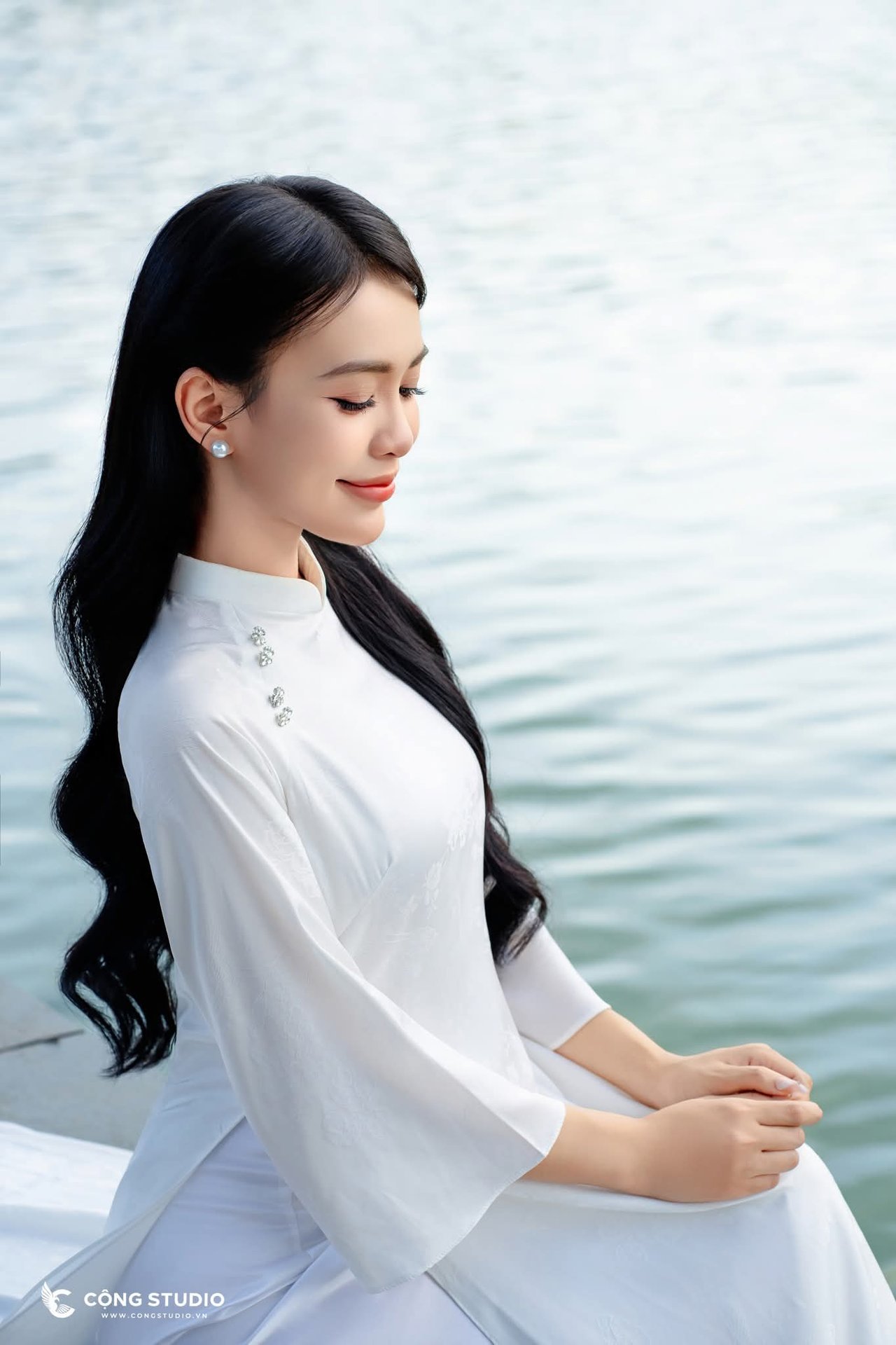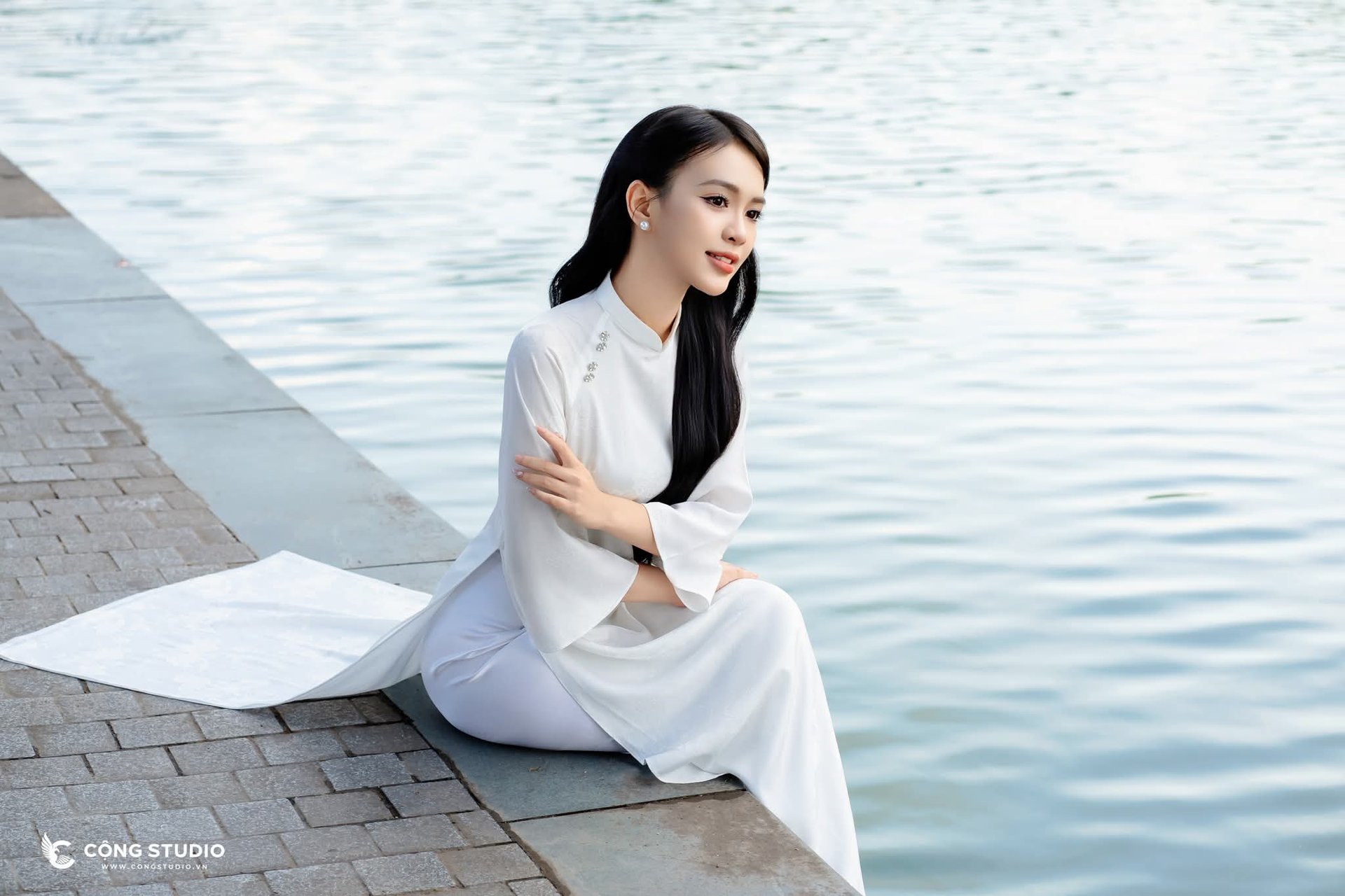 Image captures the `gentle` beauty of a `Vietnamese` woman in a pristine white `Ao Dai`, seated gracefully by a tranquil lake. This portrayal of a charming `person` from `Vietnam` blends seamlessly with the picturesque `landscape`, creating `beautiful scenery` that touches the heart. The traditional Ao Dai highlights her elegance and serenity, embodying the essence of national culture. With long dark hair and a pensive gaze, she exudes peace and contemplation. This is more than just a `beautiful picture`; it's a symbol of the peacefulness and timeless beauty of `Ao Dai` and the `Vietnamese landscape`, reminiscent of Hoan Kiem Lake, offering a sense of calm to viewers.