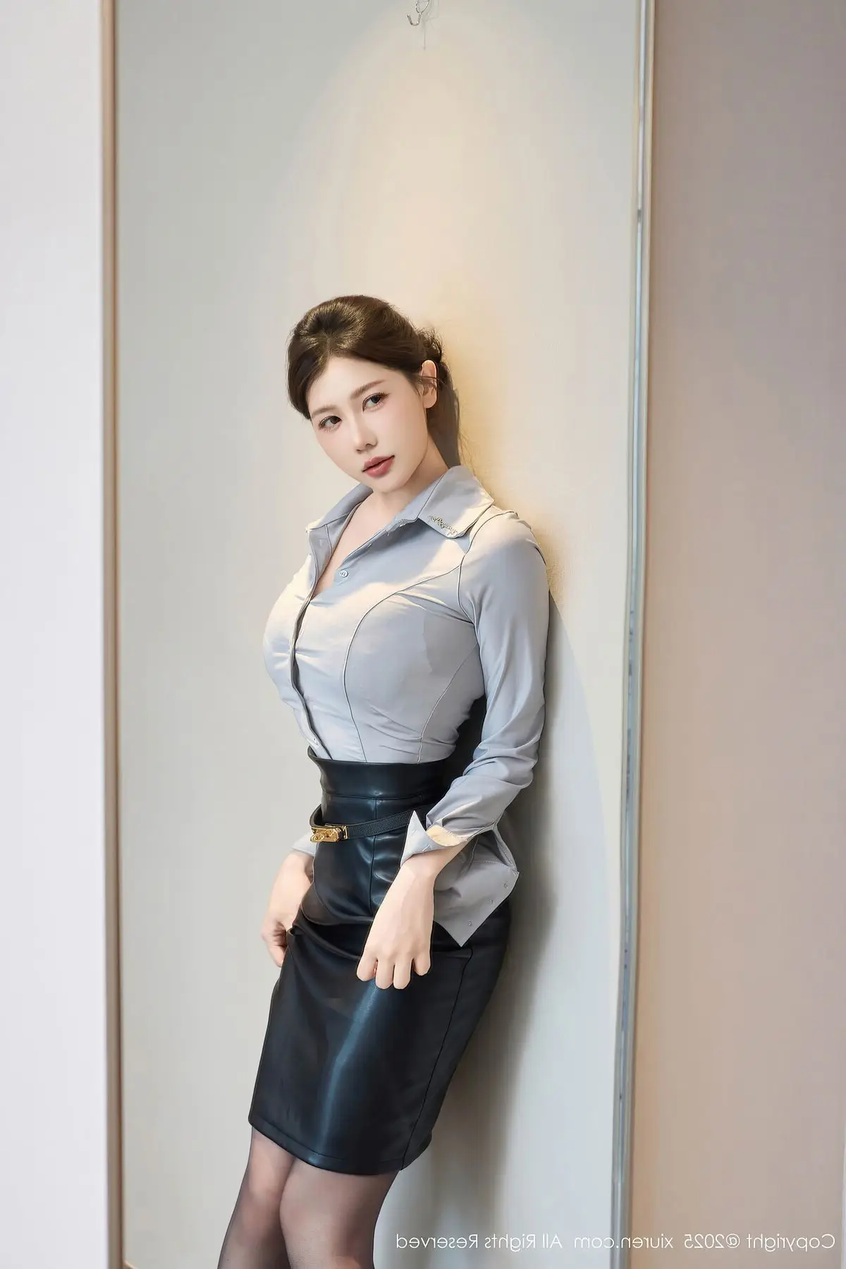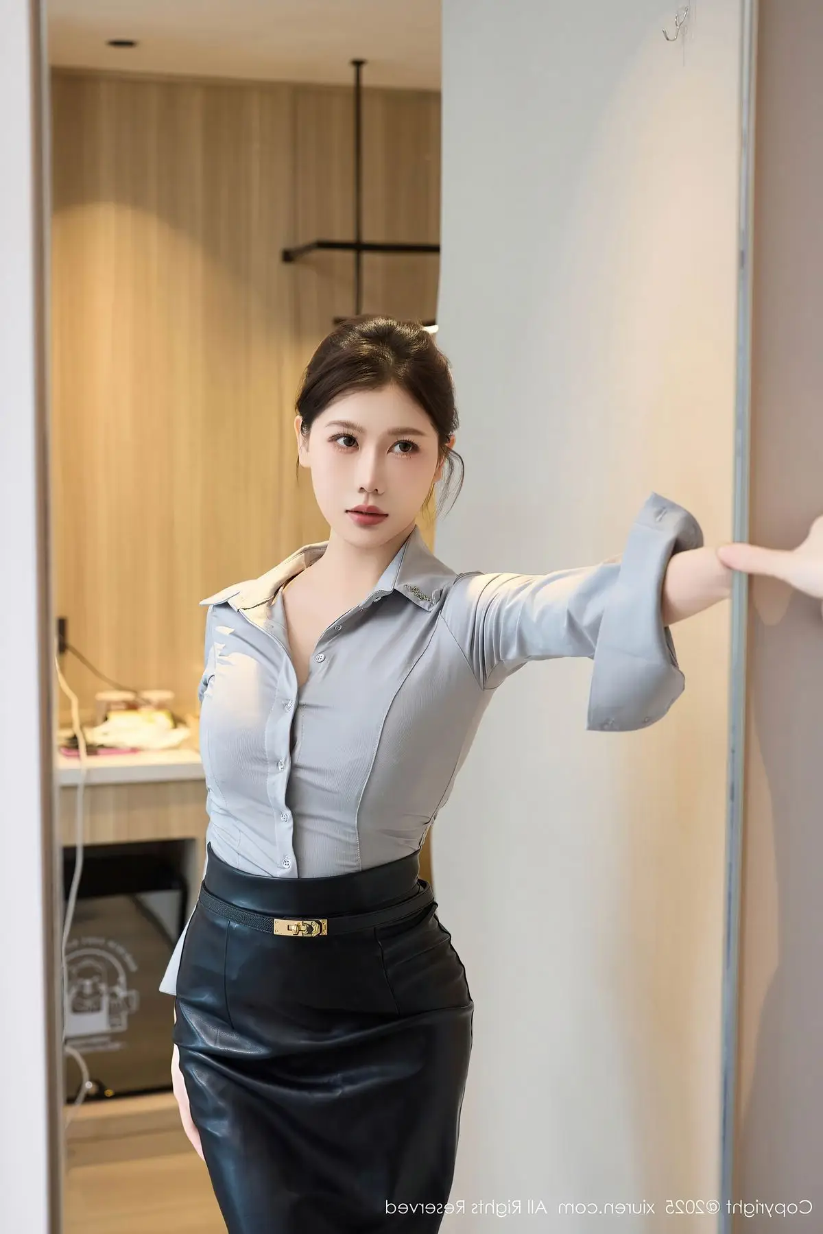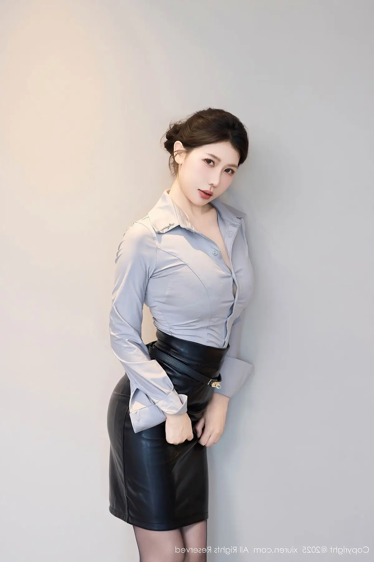 In the XiuRen No.10604 photo collection, model Yi Tian Tian shines with an elegant yet captivating beauty. She dons a sophisticated light blue shirt, expertly paired with a form-fitting black leather skirt, creating a distinctive and alluring office style. Every gesture and gaze from Yi Tian Tian exudes confidence and a professional demeanor, yet remains undeniably sensual. The modern backdrop with its unique textured wall further accentuates her charm. This collection not only highlights her figure but also vividly portrays Yi Tian Tian's irresistible appeal, delivering emotionally rich artistic moments.