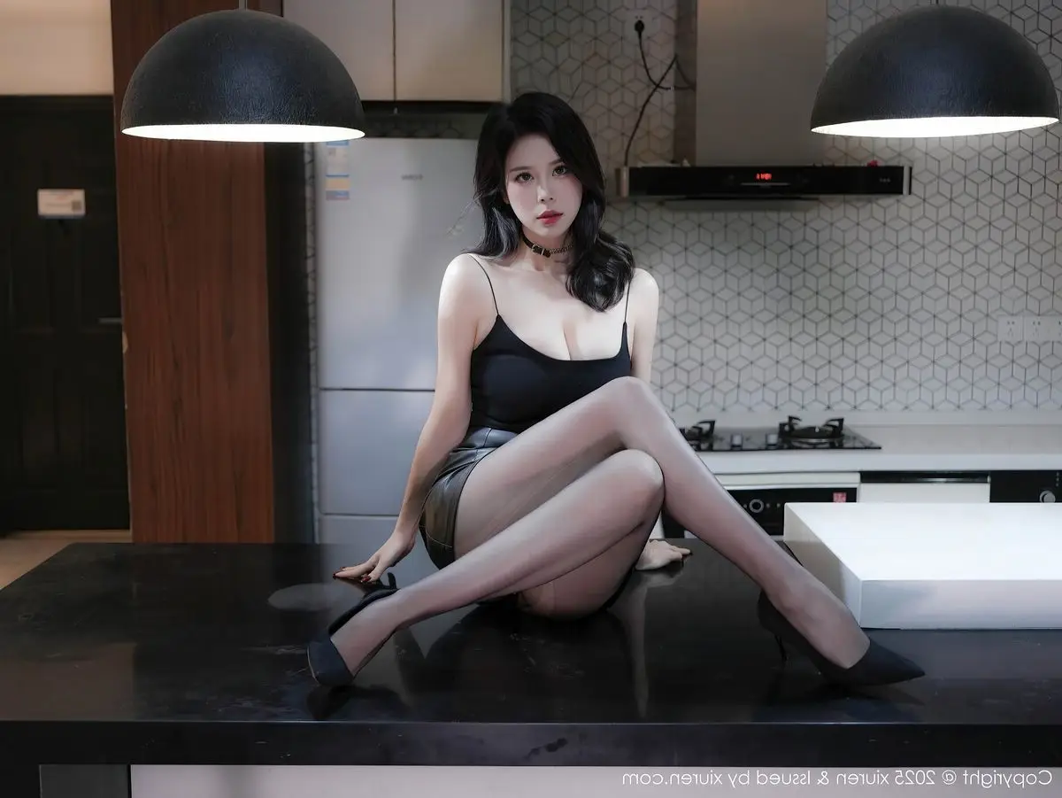 This image from the XiuRen No.10523 collection showcases the captivating beauty of model Mei Gui Wo Ai Ni. She exudes confidence and elegance dressed in a form-fitting black spaghetti strap top and an alluring glossy leather-look mini skirt. Her enchanting demeanor and profound gaze create an irresistible appeal. Mei Gui Wo Ai Ni gracefully leans against a modern kitchen counter highlighting her figure and sophisticated style. This photograph not only captures her striking physical beauty but also radiates a graceful sensual aura. It is an emotionally rich artistic moment sure to delight admirers of the fusion between fashion and East Asian aesthetics.