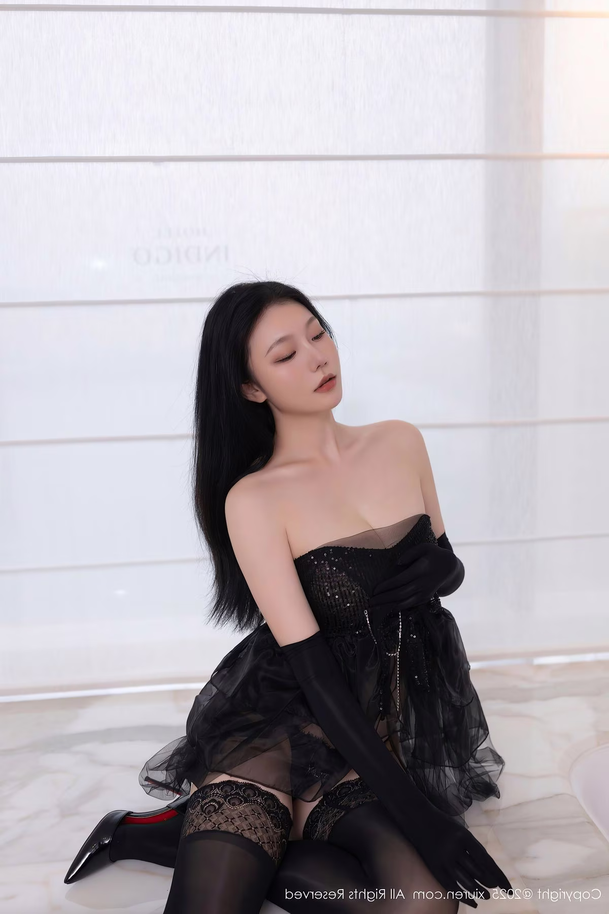 The XiuRen No.10363 collection proudly presents model An Ran, exuding an aura of captivating allure and sophisticated elegance. She is adorned in a refined black ensemble featuring a seductive sheer bodysuit, long gloves, and fishnet stockings, projecting an air of mystery and charm. Her striking red-soled high heels add a vibrant accent, beautifully enhancing her slender figure and gracefully elongated legs. An Ran's graceful seated pose, combined with her confident and direct gaze, highlights her professionalism and unique appeal. The minimalist background further emphasizes her chic beauty and captivating contours, offering a mesmerizing visual experience of fashion and self-assured confidence from An Ran.XVG No.53: Captivating Asian Beauty in Traditional Attire Amidst Serene Lotus Flowers.