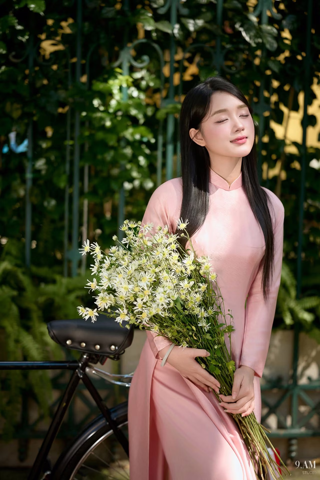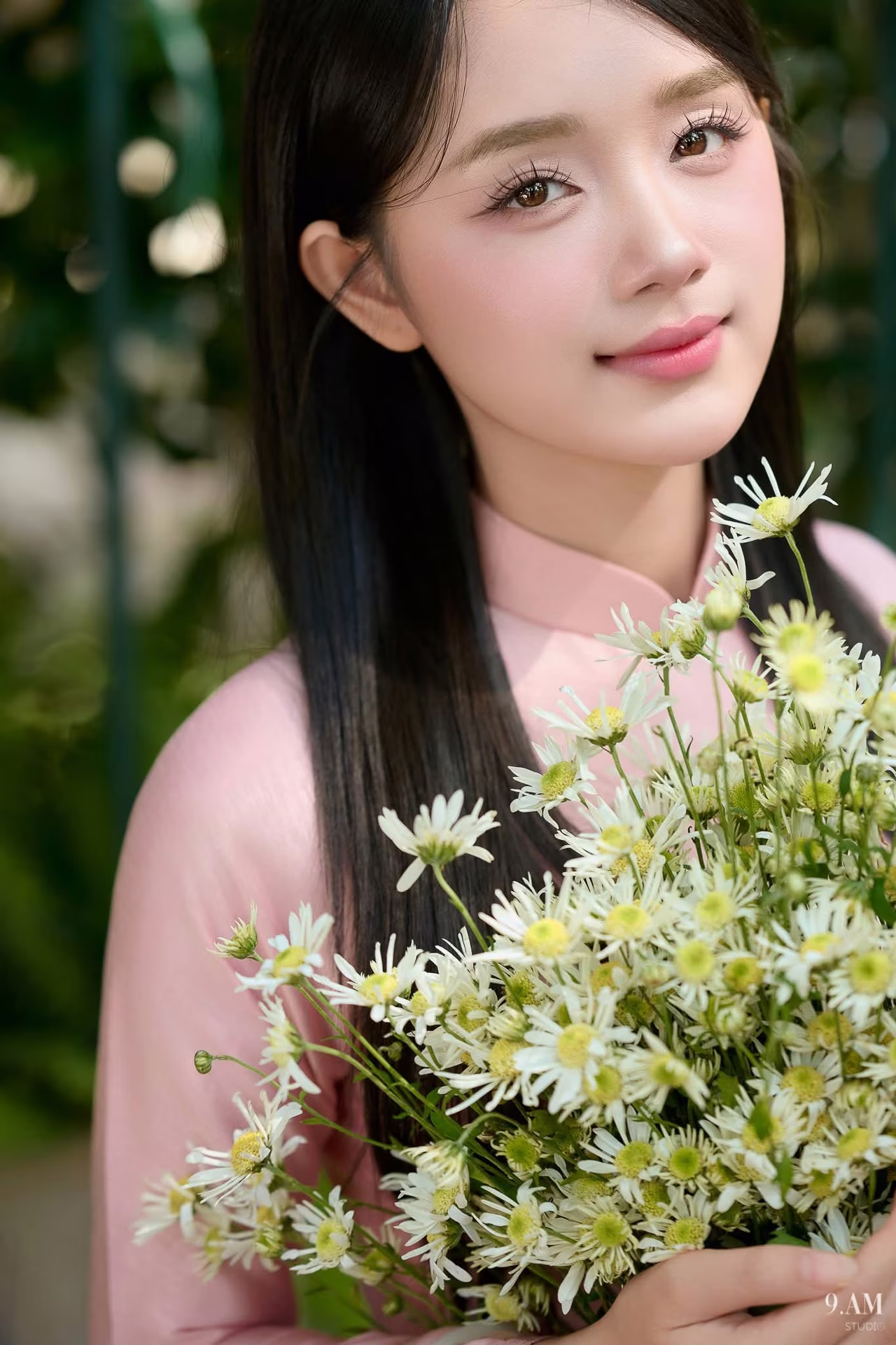 This beautiful photograph captures a Vietnamese lady with a serene and graceful beauty. Dressed in a traditional light pink Ao Dai her elegant figure is highlighted. Her gentle smile and clear eyes convey a demure charm characteristic of Vietnamese women. She holds a delicate bouquet of pure white flowers symbolizing purity and natural beauty. This image not only records a peaceful moment but also celebrates the rich cultural identity of Vietnam through its iconic Ao Dai. It is a harmonious blend of human beauty and traditional attire creating a captivating and emotional portrait. The lush green background further enhances her elegant presence. #Vietnamese #pretty #charmVGU No.18: Captivating Elegance A Young Woman in Pink Ao Dai