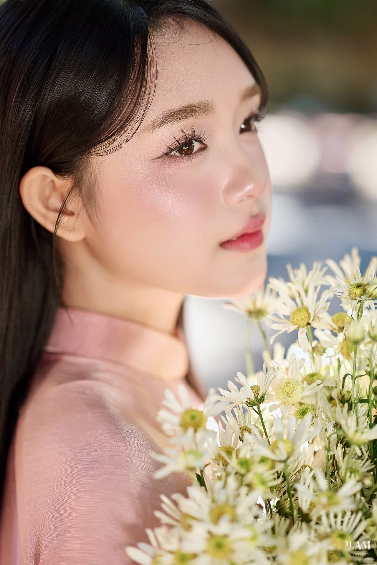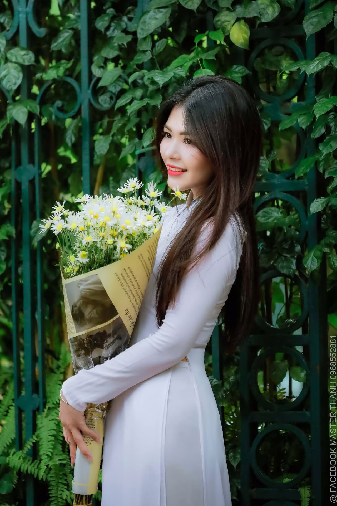 VGU No.18 captures a stunning Vietnamese young woman adorned in a flowing pink Ao Dai exuding elegance and grace. Her long raven hair frames a delicate face, and her dreamy gaze directed upwards adds a layer of emotion and depth to the moment. In her hands she holds a pristine bouquet of white daisies symbolizing purity and simple beauty further enhancing her charming Asian allure. The lush green natural backdrop provides a serene setting beautifully complementing the vibrant pink of her traditional attire. This image perfectly blends traditional aesthetics with the fresh vitality of youth creating a captivating and soulful portrait. #Vietnamese #pretty #charmVGU No.11: Elegant Charm: A Woman's Grace in White Gown and Delicate Rose Bouquet