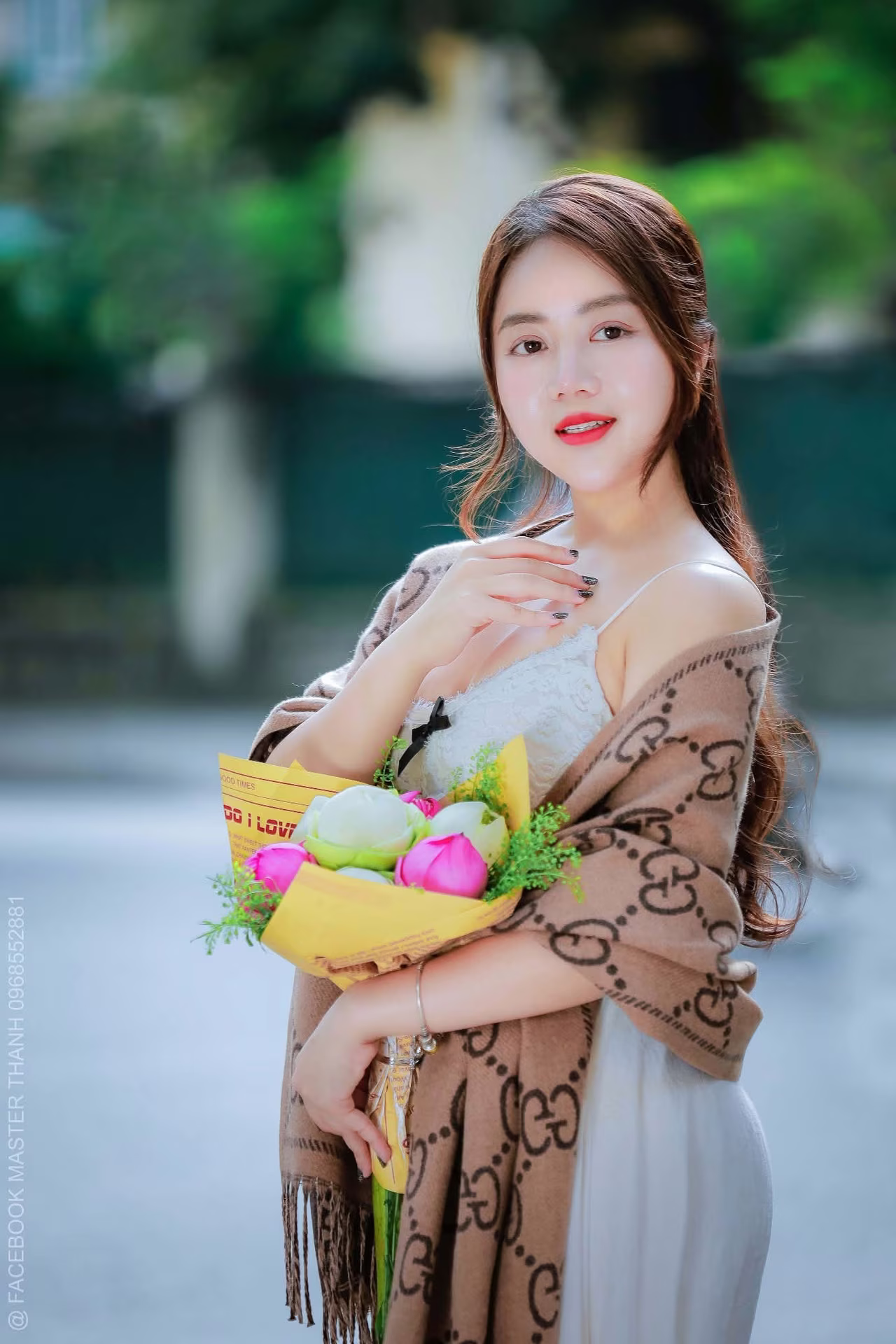This VGU No.88 photograph captures a mesmerizing moment of a young woman radiating elegant beauty and a gentle smile. She exudes a captivating charm in her refined attire complemented by a stylish modern patterned shawl. The focal point is the fresh lotus bouquet she cherishes symbolizing purity and innocence which further accentuates her natural and graceful allure. Her dreamy gaze and flowing hair create an enchanting portrait evoking feelings of femininity and serenity amidst the urban setting. This image is more than just a picture it is a narrative of beauty and timeless style. #Vietnamese #pretty #charmVGU No.87: Discover the captivating elegance of a Vietnamese girl in a pristine white Ao Dai.