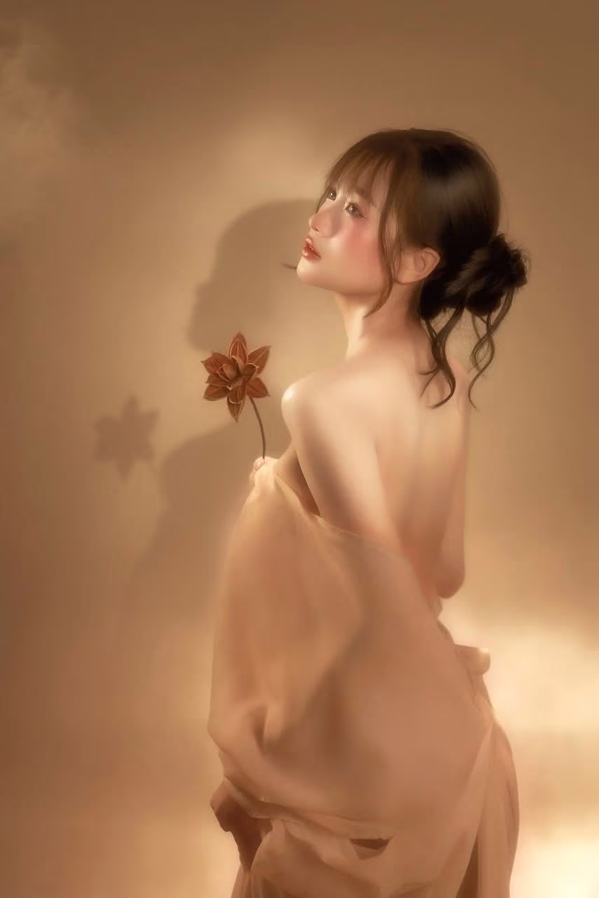 This XVG No.35 photograph is a captivating work of art portraying the dreamy and delicate beauty of a muse. Soft amber light envelops the scene creating a romantic vintage atmosphere reminiscent of a classic painting. The main character with her neatly tied hair and graceful bare shoulders exudes purity and mystery. She gently holds a dried flower symbolizing timeless beauty and nostalgia. The rear view and upward gaze suggest deep contemplation and a hidden longing. Every detail from the sheer fabric to the soft shadows on the wall contributes to an emotionally rich and irresistibly captivating artistic momentXVG No.9: Long-Haired Muse in a Dreamy Garden Serene and Pure Beauty