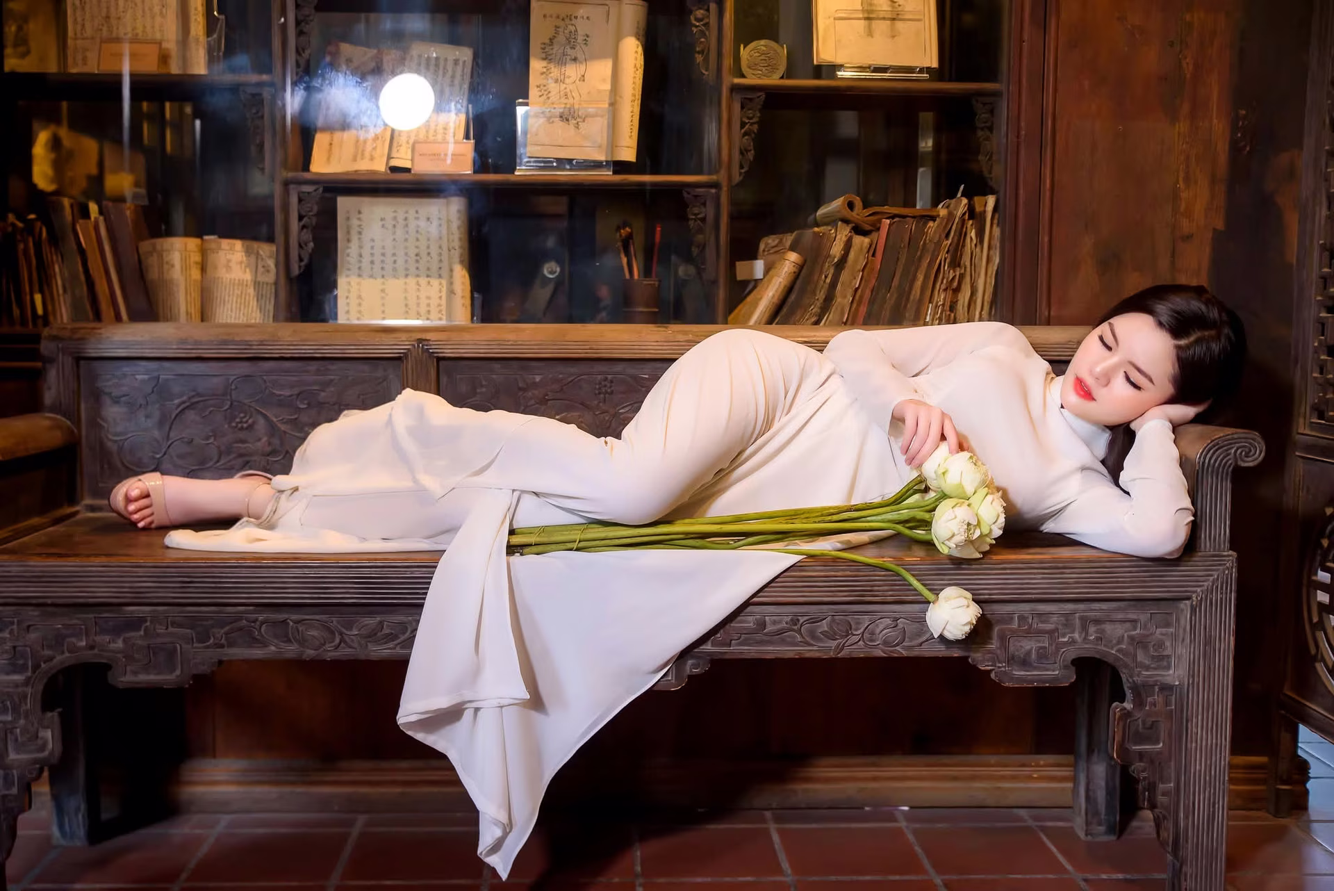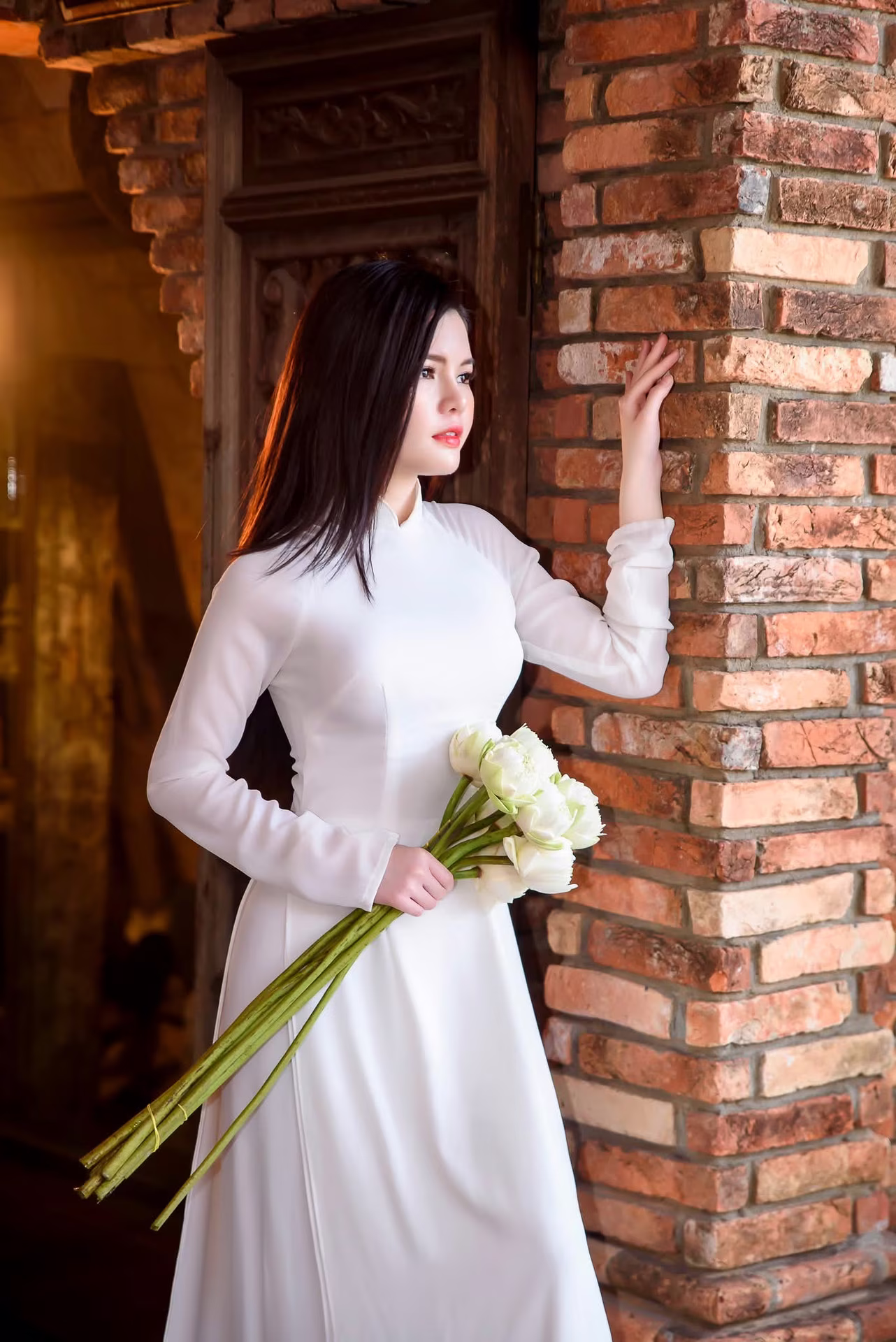 This VGU No69 image celebrates the gentle and elegant beauty of a Vietnamese girl in a pristine white Ao Dai. She sits gracefully holding a bouquet of pure white lotuses symbolizing innocence and nobility. Her Asian beauty blends harmoniously with the ancient architectural setting creating a poetic scene. The white Ao Dai is not merely an outfit but the soul of Vietnamese culture enhancing her graceful figure and refined demeanor. Every detail from her gaze to her subtle smile radiates charm captivating all who behold it. This image truly represents the traditional beauty and spirit of Vietnam. #Vietnamese #pretty #charmVGU No.65: Explore Vietnam's Traditional Beauty: Ao Dai Gracefully Meets Ancient Culture