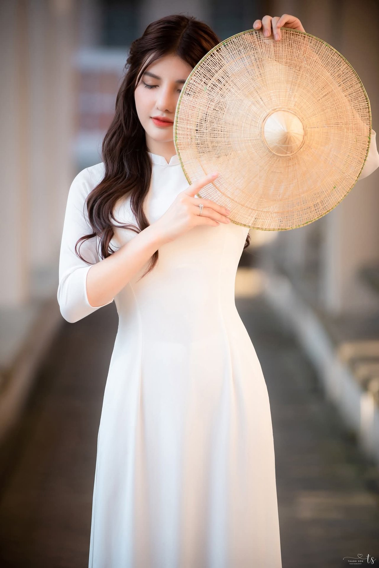 This image captures the serene beauty of a Vietnamese woman in a traditional white Ao Dai. The graceful girl holds a conical hat adorned with the red and yellow star of the Vietnamese flag symbolizing national pride and rich Vietnamese culture. Her gentle modest demeanor combined with the elegant attire highlights sophistication and grace. The form-fitting Ao Dai and the iconic conical hat are not just garments but a source of national honor. The classic architecture in the background further enhances the cultural and historical value. This beautiful and evocative portrayal speaks of a traditional yet modern Vietnam where human beauty harmonizes with its profound heritage.XVG No.35: Vintage Artistic Muse – Dreamy and Pure Beauty