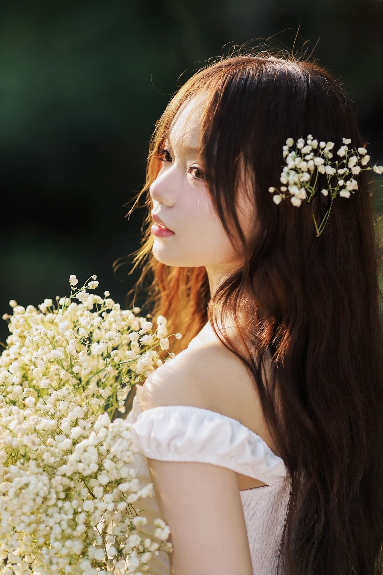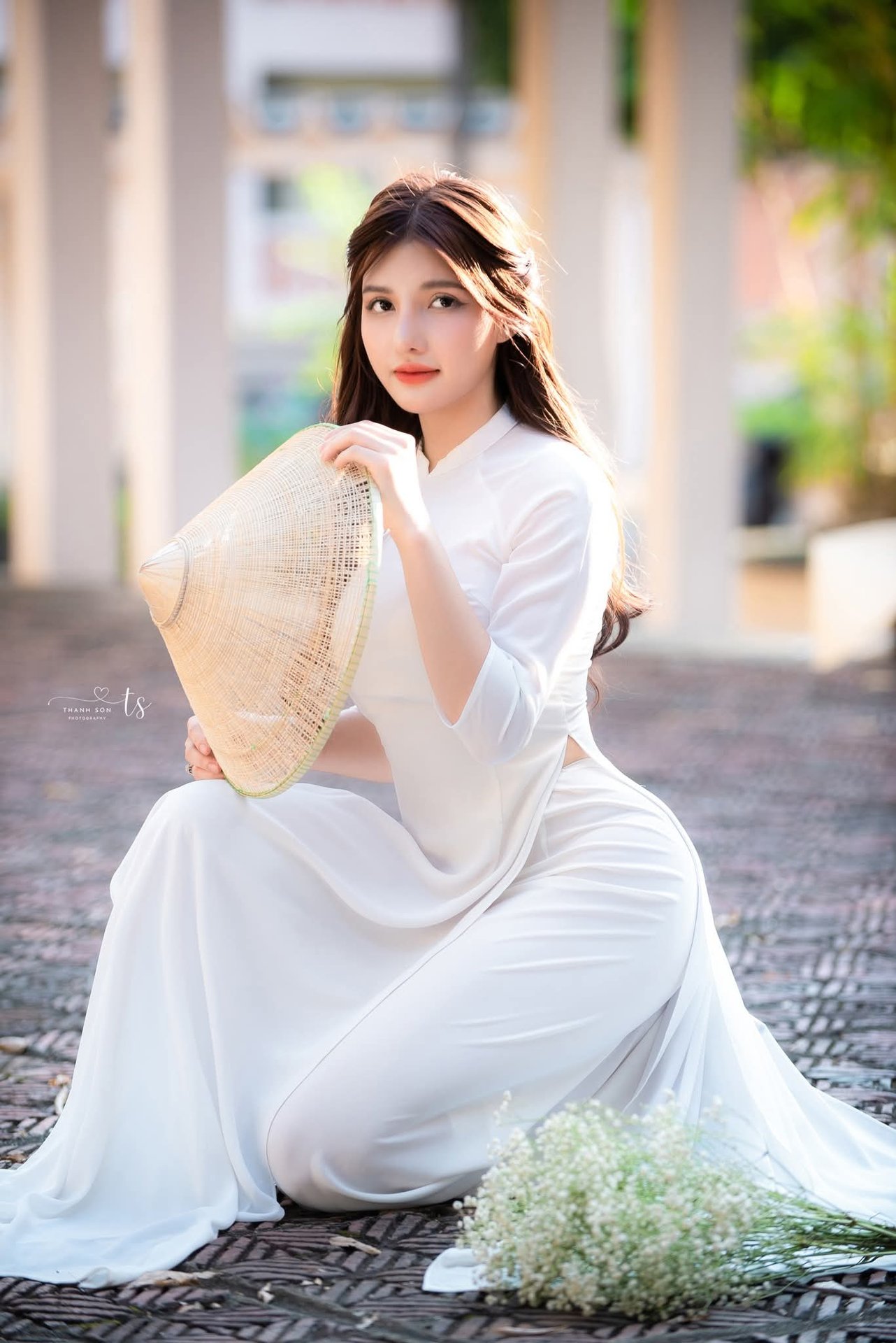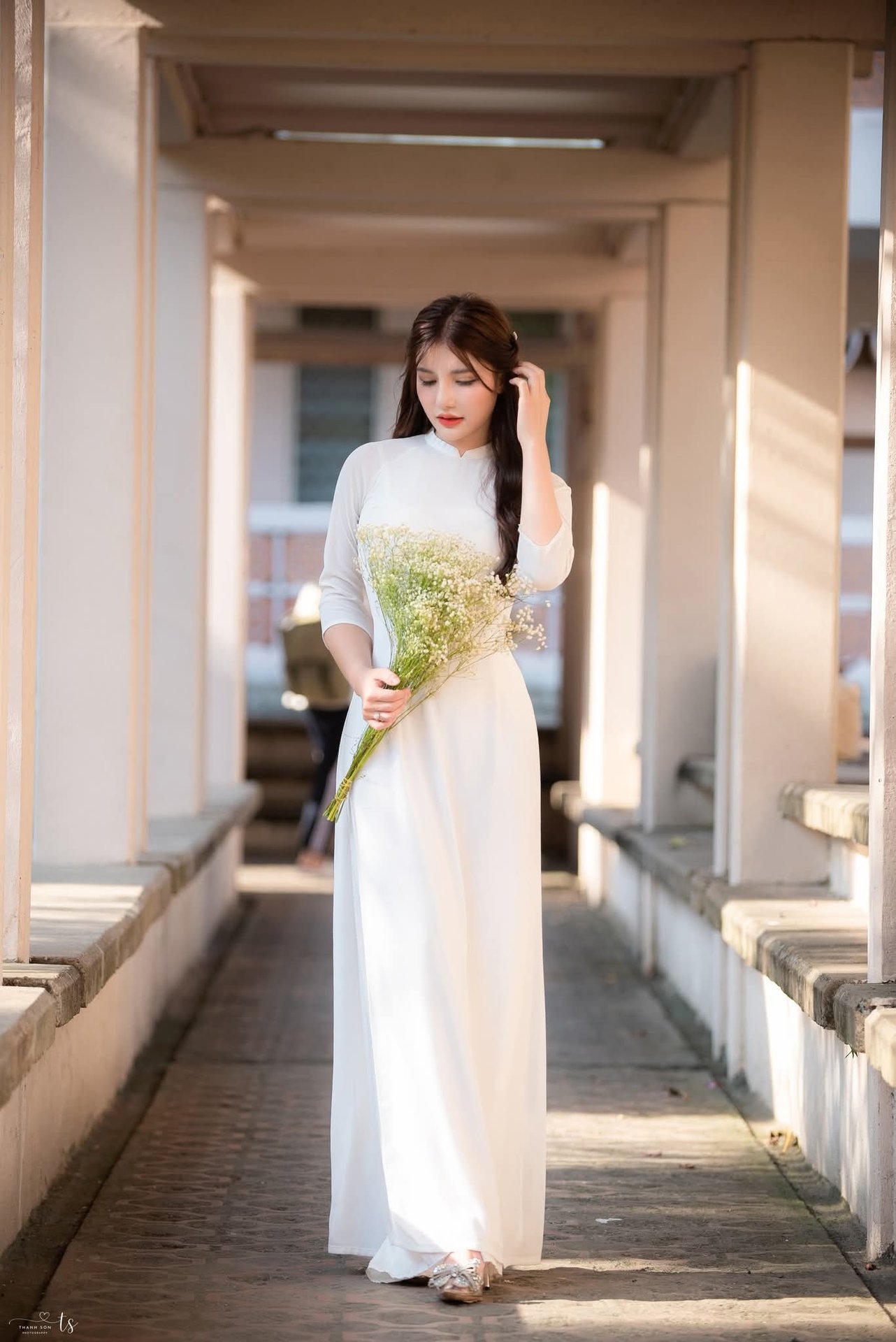 This image captures a serene and emotional moment of a graceful Vietnamese girl in a pristine white Ao Dai. She exudes gentle, elegant beauty with her flowing long hair and soft smile, captivating every gaze. The traditional Ao Dai, flowing gracefully, accentuates her slender, delicate figure, affirming the beauty of Vietnamese culture. In her hands, she holds a bouquet of pure white baby's breath flowers, symbolizing purity and innocent love, further highlighting her fresh, natural youthful charm. The corridor setting with soft golden sunlight adds to the romantic ambiance, creating a harmonious picture rich in Asian aesthetics. This image represents the timeless beauty of Vietnamese women, a perfect blend of tradition and freshness.