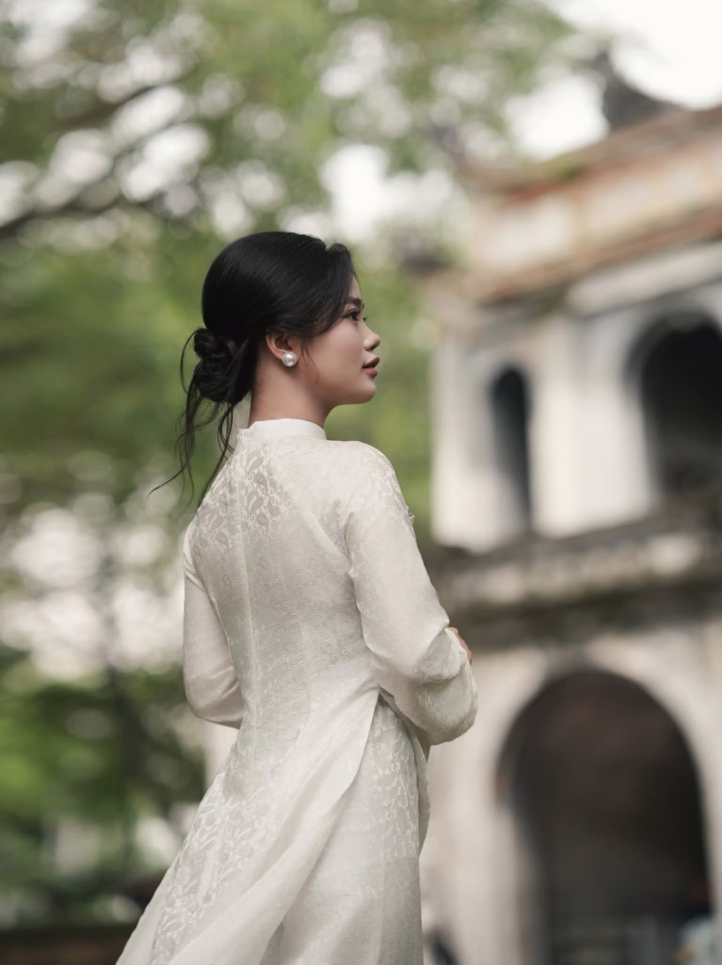 This stunning photograph captures a young woman exuding gentle beauty and refined elegance. She is adorned in a sophisticated ivory-white sleeveless dress, featuring a soft cowl neck design that gracefully highlights her slender shoulders and graceful figure. Her hair is neatly styled in an updo, complemented by sparkling earrings, creating an overall look of luxury and class. A romantic touch is added by the delicate bouquet of small pink roses she lovingly holds, symbolizing purity and affection. Her gaze, directed slightly away, carries a dreamy and serene quality, as if lost in a moment of quiet contemplation. This is more than just a portrait; it is an artistic capture where natural beauty harmonizes with exquisite style, captivating the viewer. The woman radiates an ethereal charm, evoking the image of a bride on her happiest day. #Vietnamese #pretty #charmXVG No.54: The Grace of Vietnamese Ao Dai & Conical Hat. A beautiful woman embodies national pride and cultural heritage.