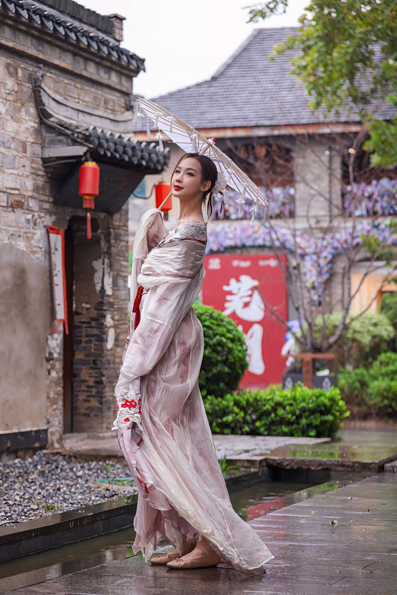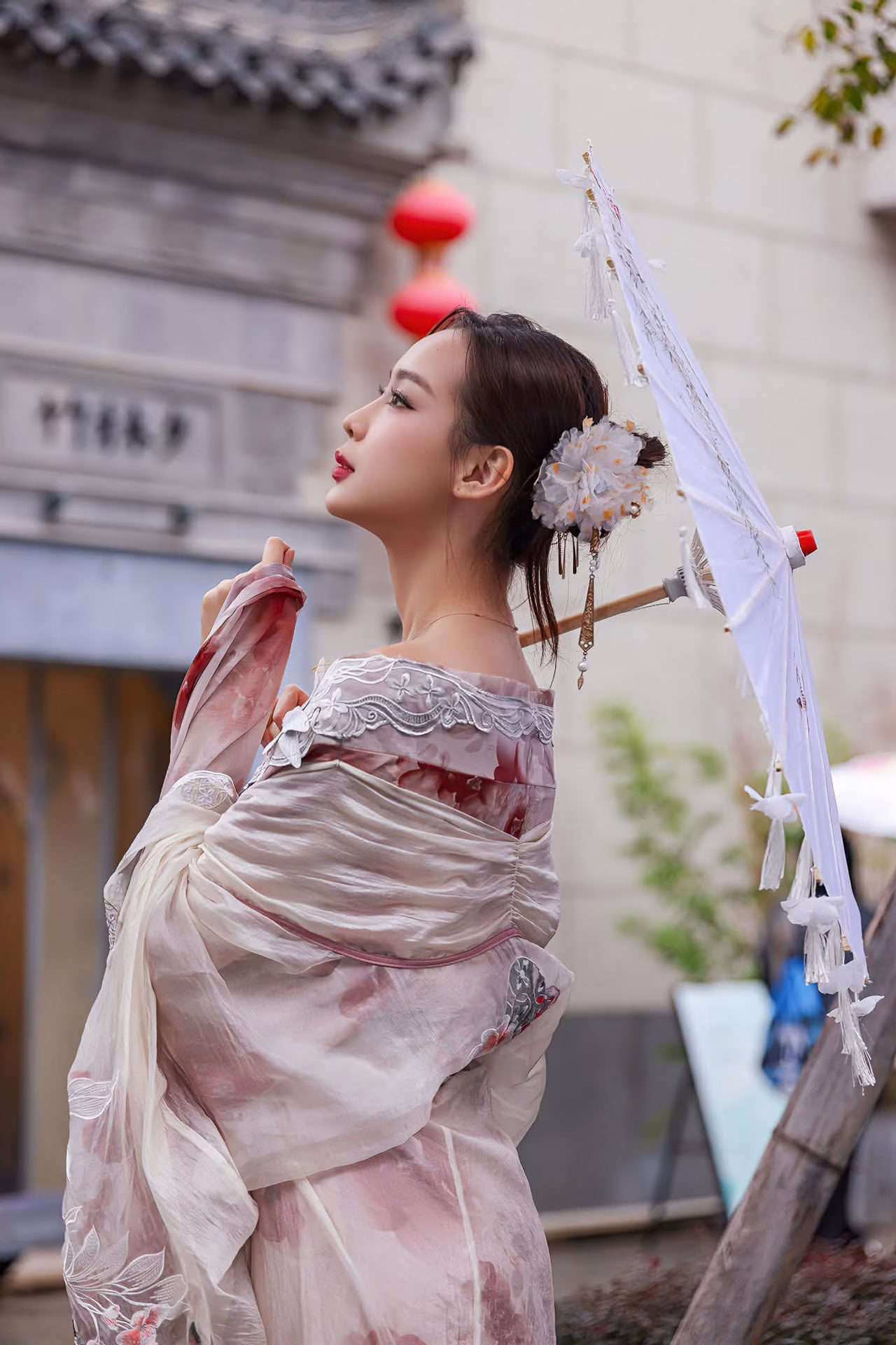 This stunning photograph captures a graceful East Asian woman exuding elegance in exquisite traditional attire. Every detail of her dress not only accentuates her figure but also reflects the intricate beauty of ancient culture. Her radiant smile and joyful gaze directed upwards illuminate the frame, conveying a sense of happiness and optimism. She delicately holds a white, intricately patterned paper parasol, symbolizing purity and timeless traditional charm. In the background, characteristic red lanterns hang, creating an authentic East Asian cultural setting. This image is a moment filled with emotion, celebrating the harmonious blend of human beauty and rich cultural heritage. #Vietnamese #pretty #charmVGU No.69: Graceful Vietnamese beauty in pristine white Ao Dai with pure lotus, exuding captivating Asian charm.