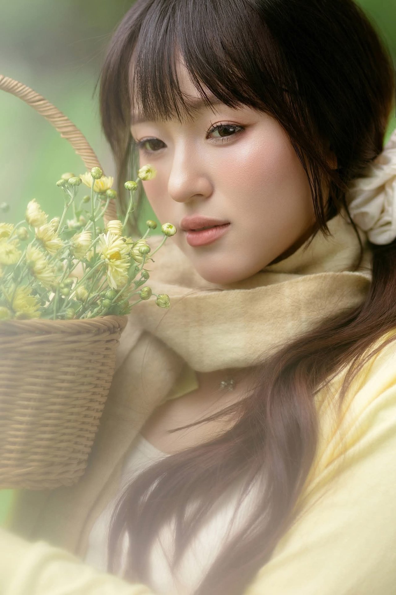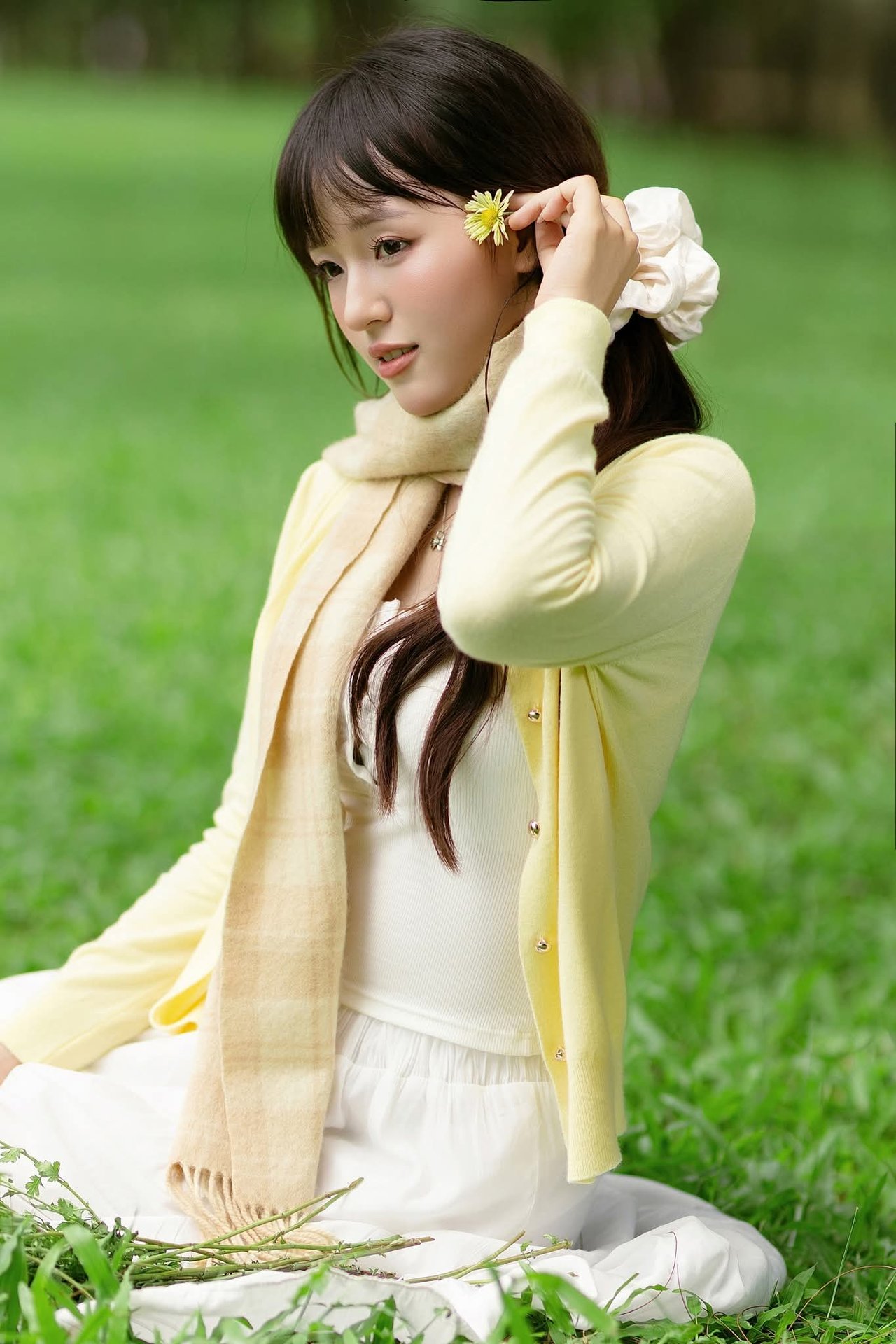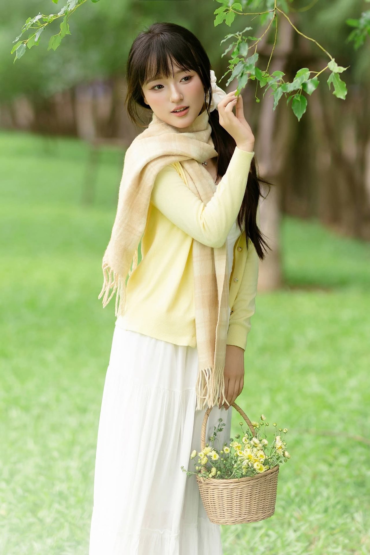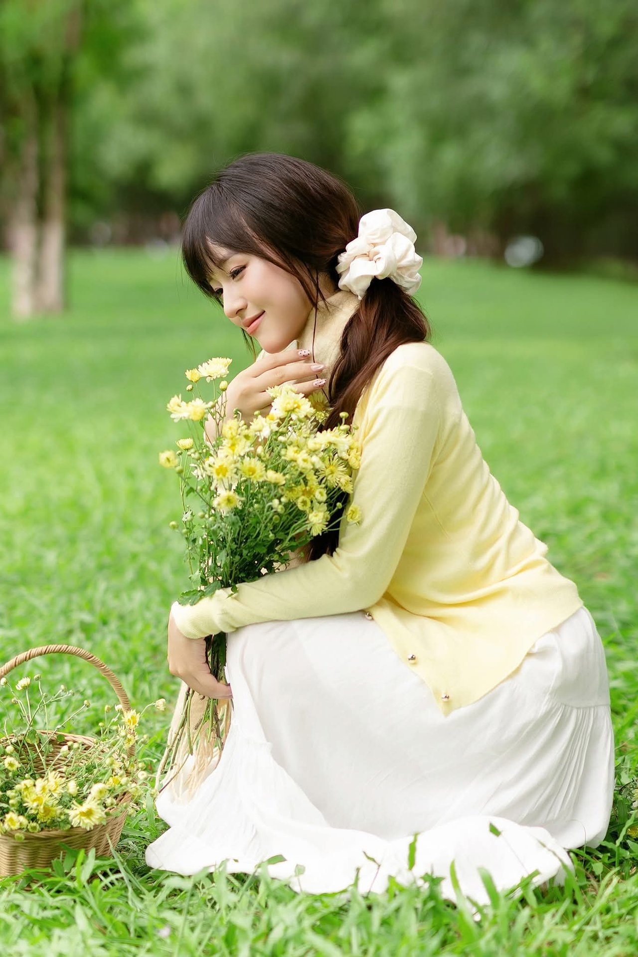 This beautiful photograph captures a young woman embodying pure and gentle beauty. She stands out in a light yellow cardigan paired with a pristine white dress creating a simple yet captivating style. Her long dark hair is neatly tied highlighting her delicate face and clear eyes. In her hands she holds a vibrant bouquet of yellow flowers symbolizing freshness and joy. The setting is a lush green park with shady trees offering a sense of relaxation and peace. This image is a perfect blend of human natural beauty and the splendor of nature evoking feelings of purity and vitality. It is a lovely moment capturing the charm of youth.Captivating Portrait: Gentle Girl's Natural Beauty with Pure White Flowers in Golden Sunlight. Discover Her Grace.
